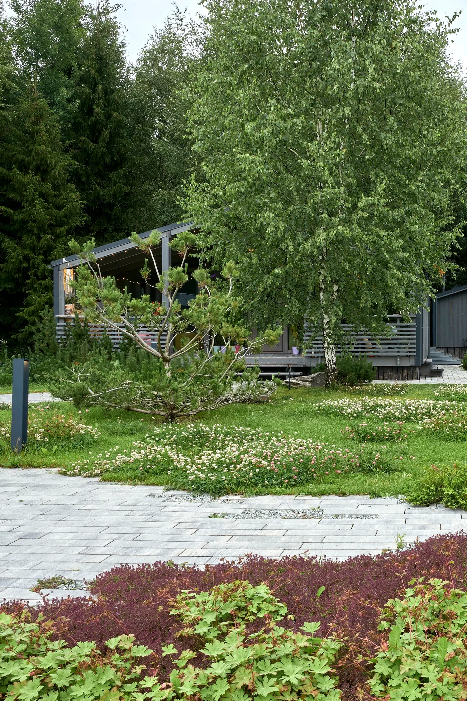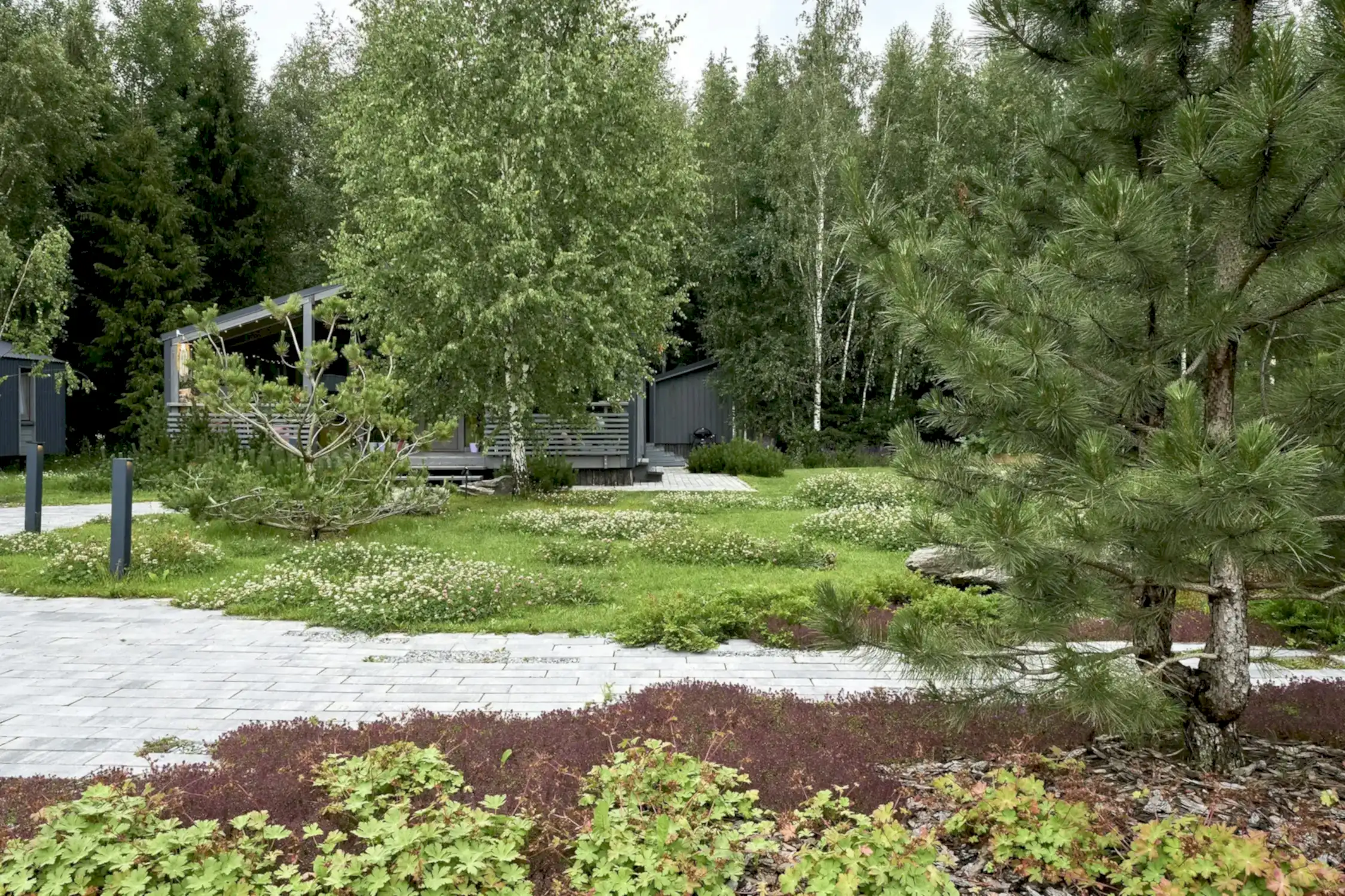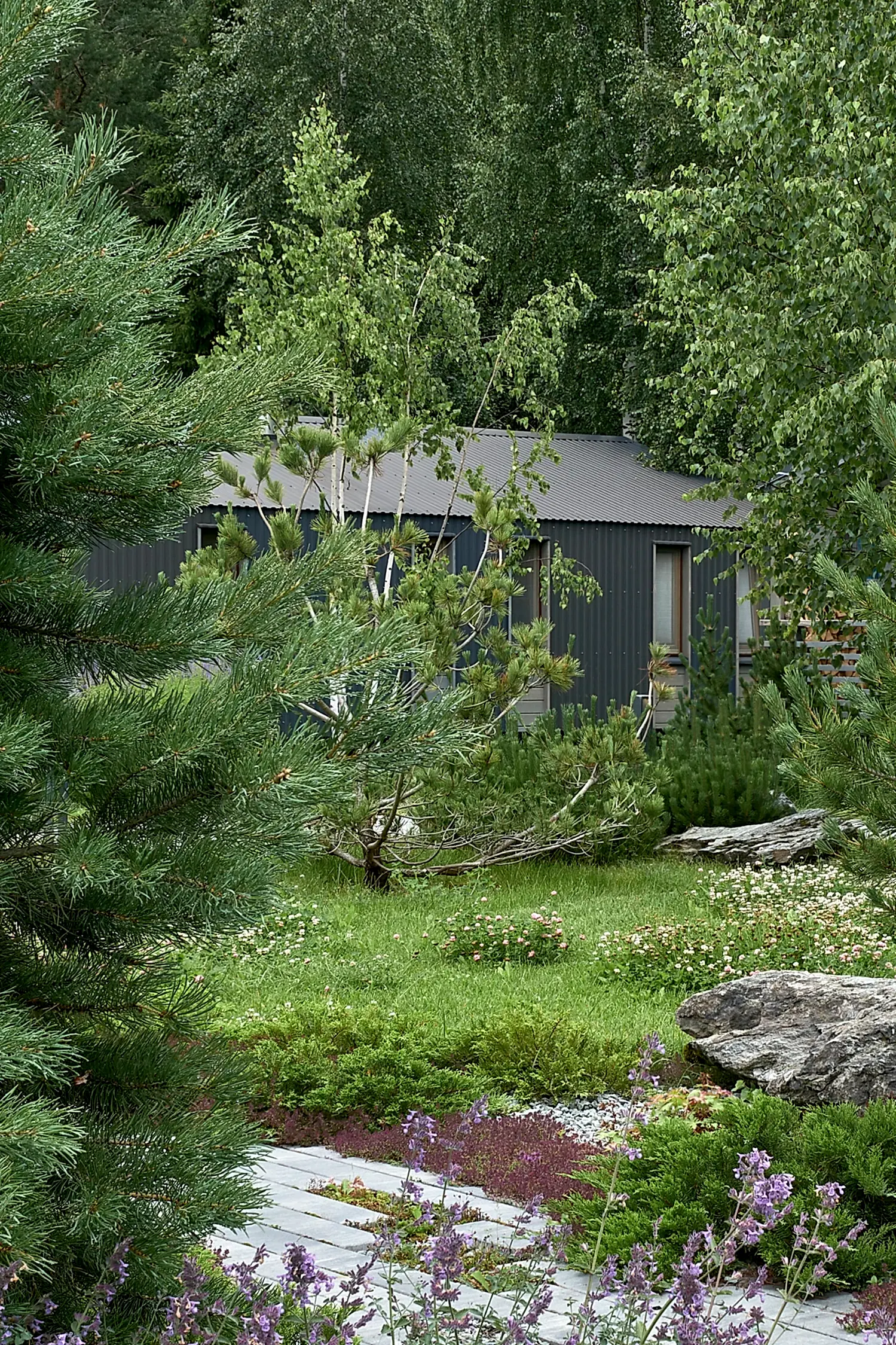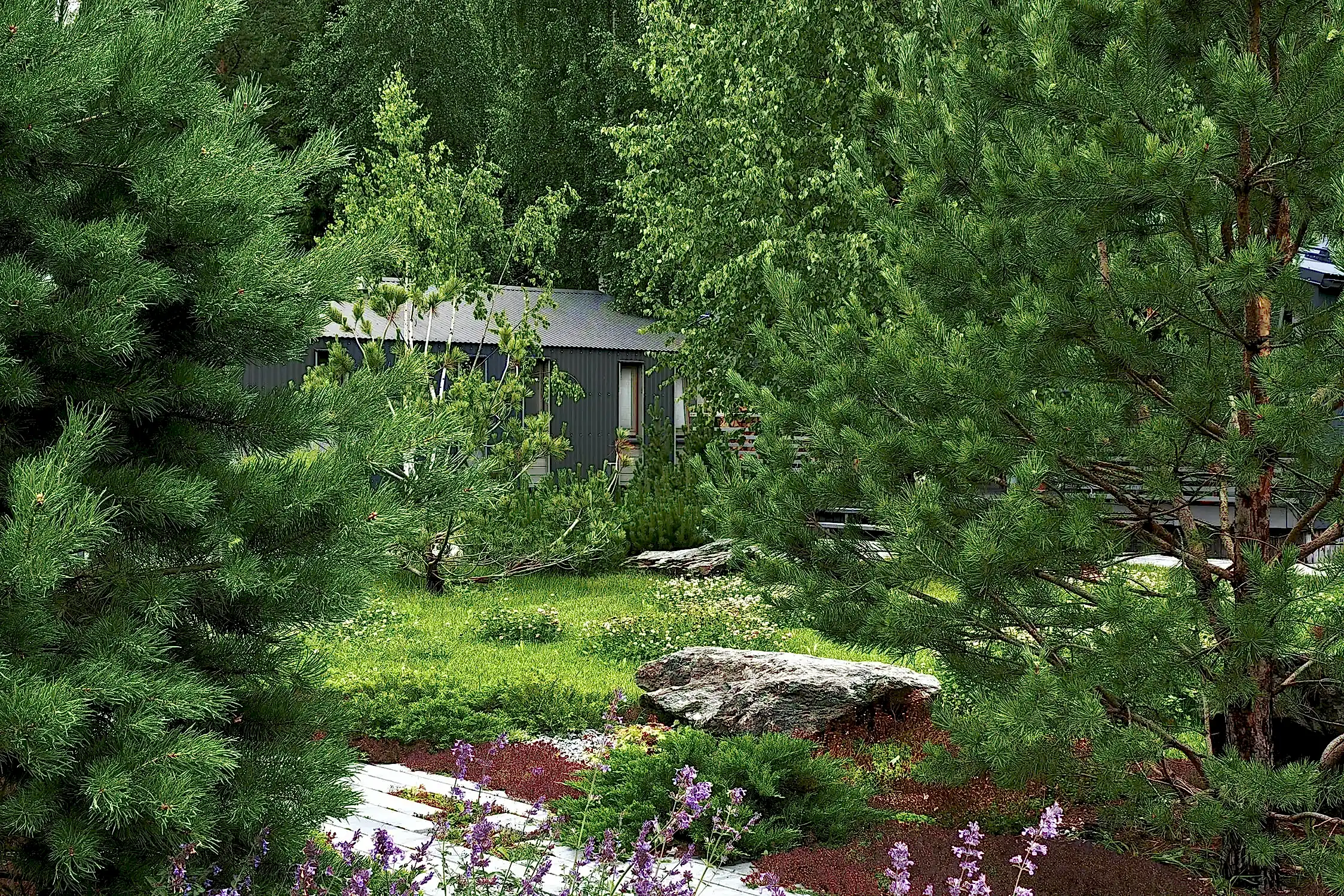 В теневой части мы не боролись за солнце - напротив, высадили тех, кто любит полумрак: рододендроны, орешники, Pin-Up молодые ели и берёзы. Солнечную часть защитили крупными соснами, чтобы дома отдыхали