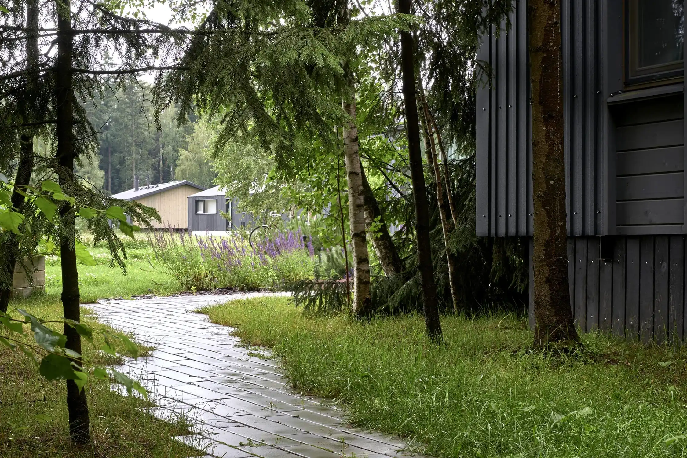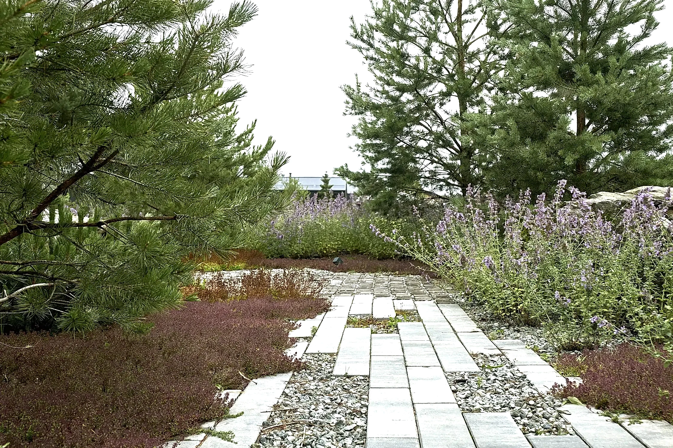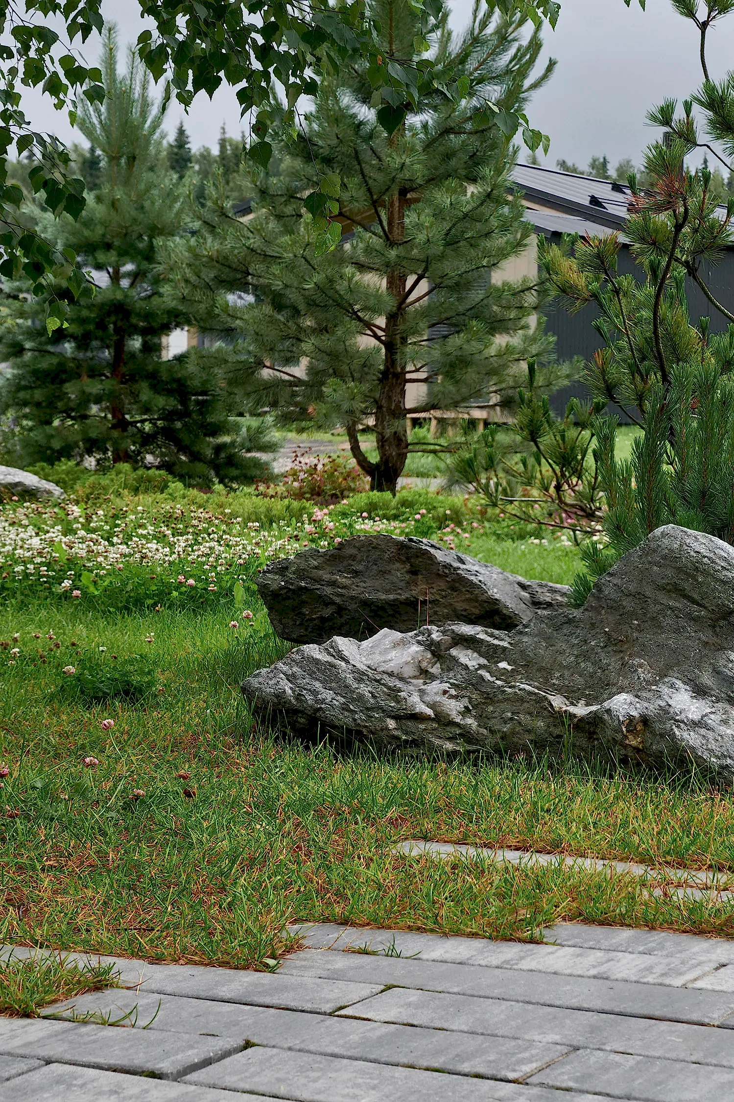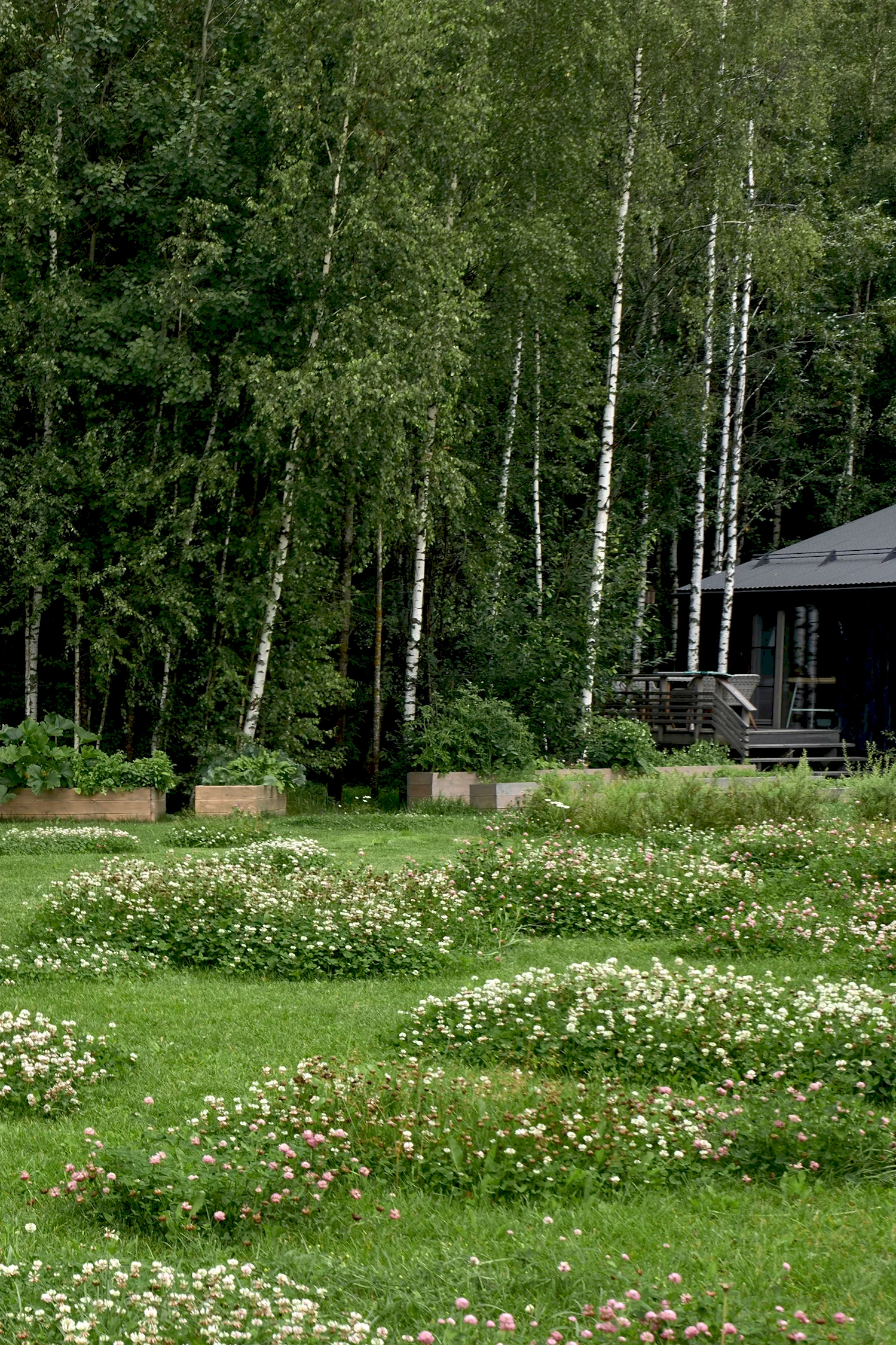 В теневой части мы не боролись за солнце - напротив, высадили тех, кто любит полумрак: рододендроны, орешники, Pin-Up молодые ели и берёзы. Солнечную часть защитили крупными соснами, чтобы дома отдыхали