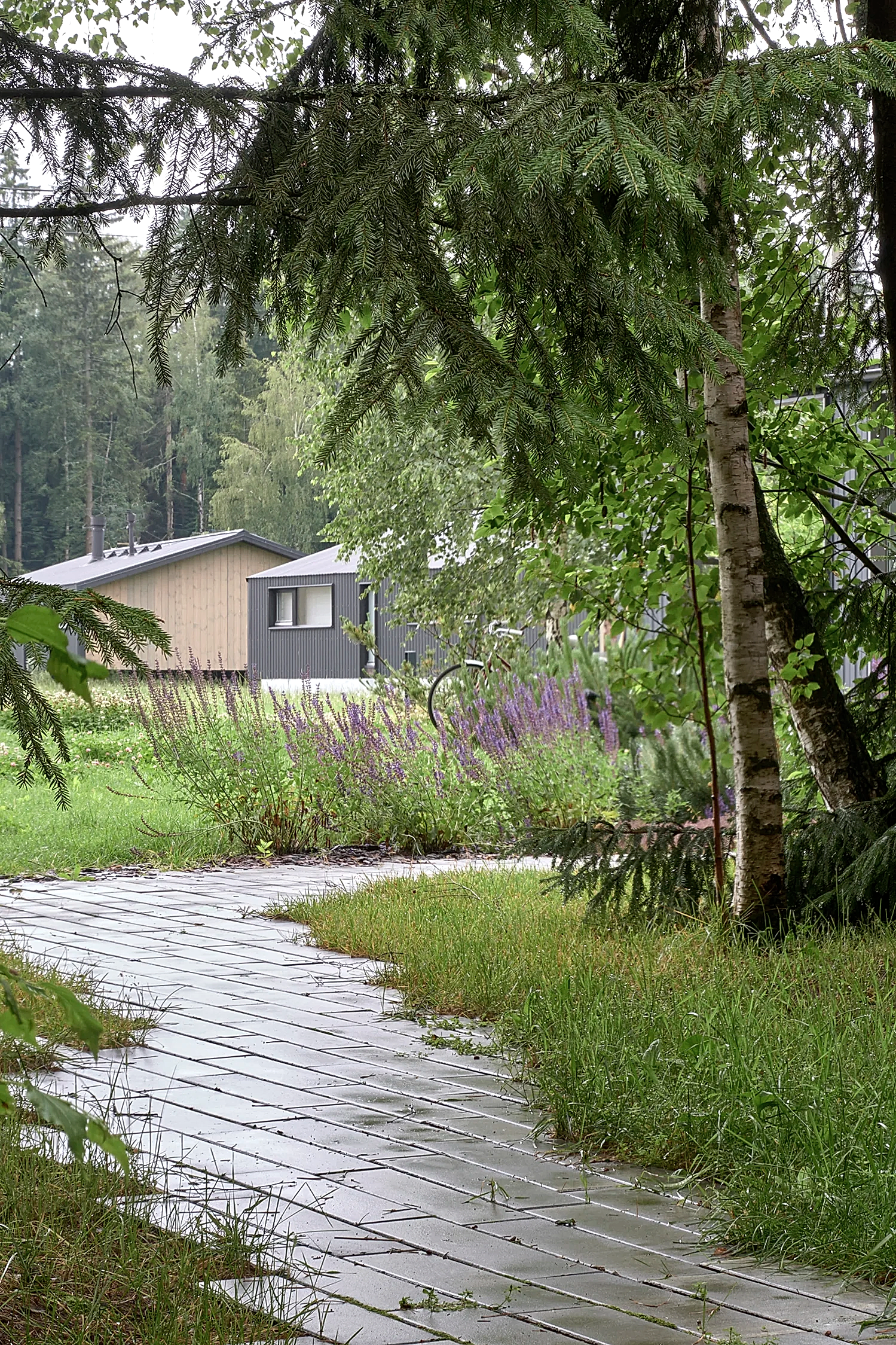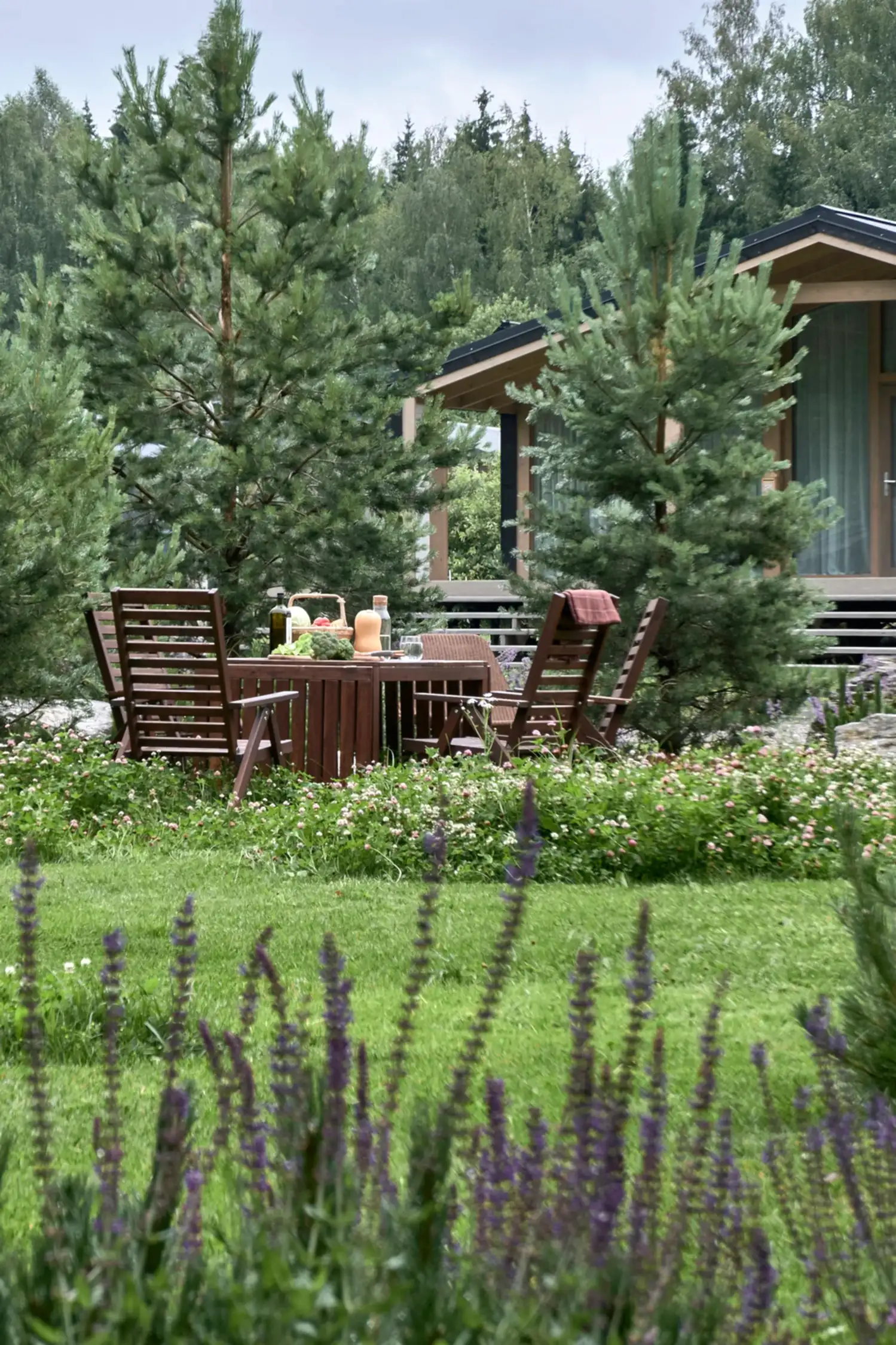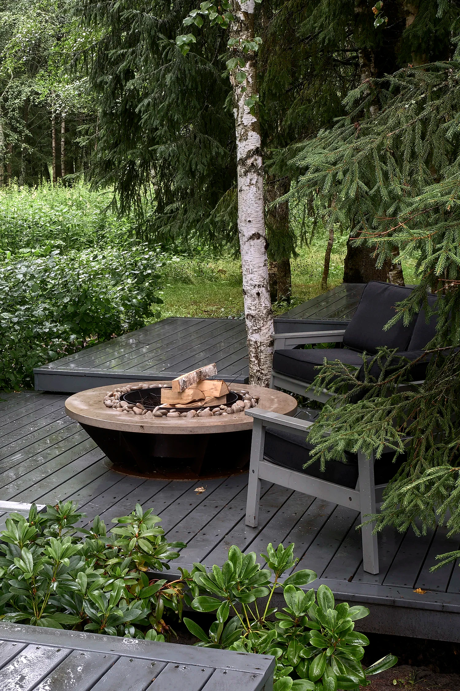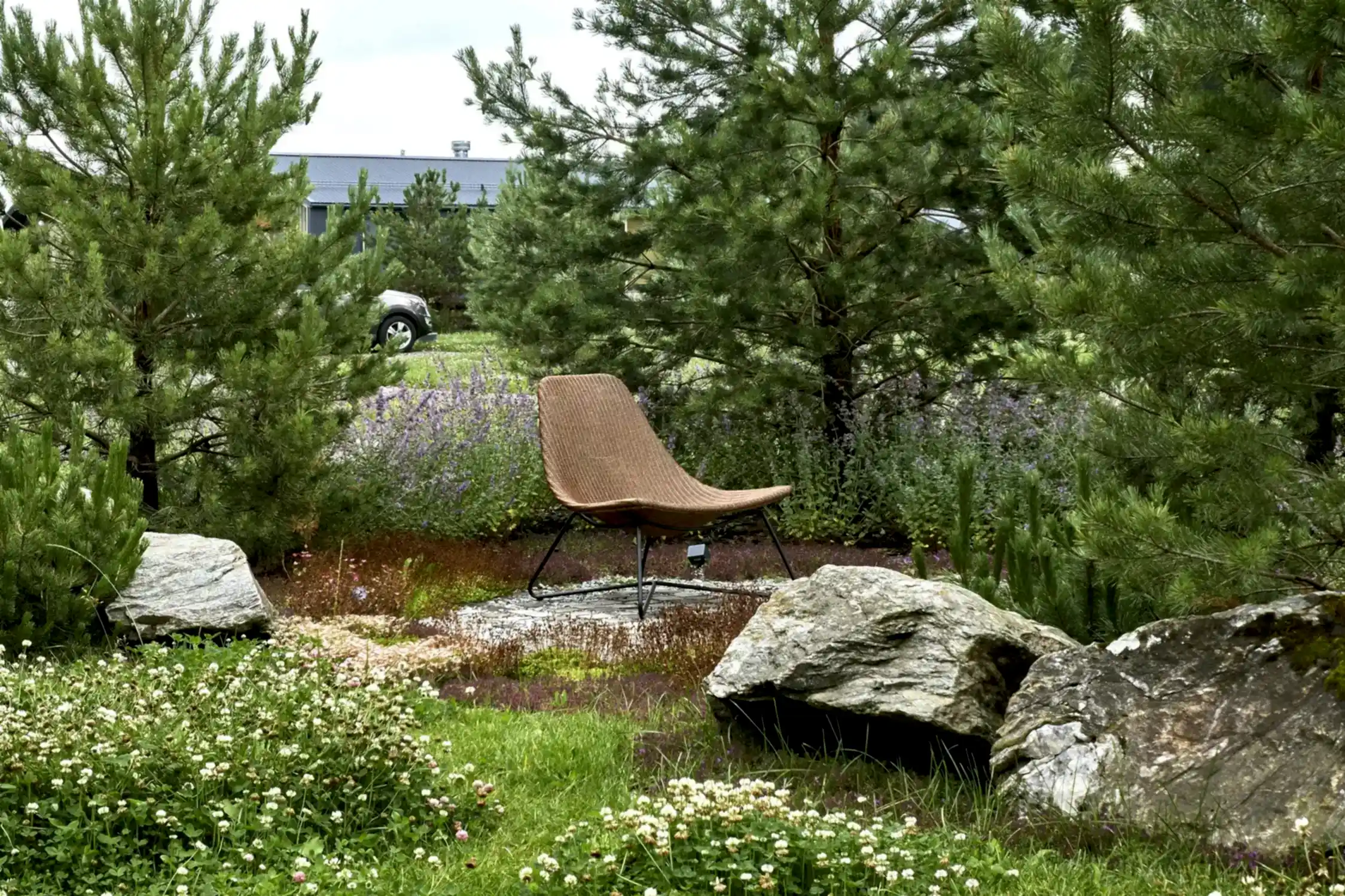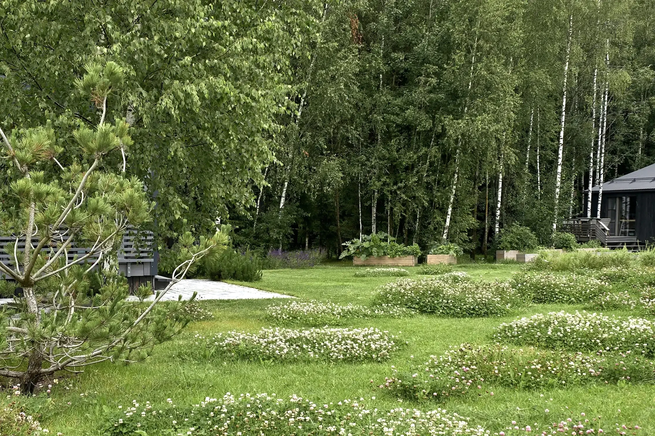 У одного из домов появился front yard с открытой лужайкой. У второго - устроили лесной back Pin-Up с красивым видом на зону очага. Для уединённого созерцания предусмотрено нетривиальное «бревно» от Дениса Милованова.