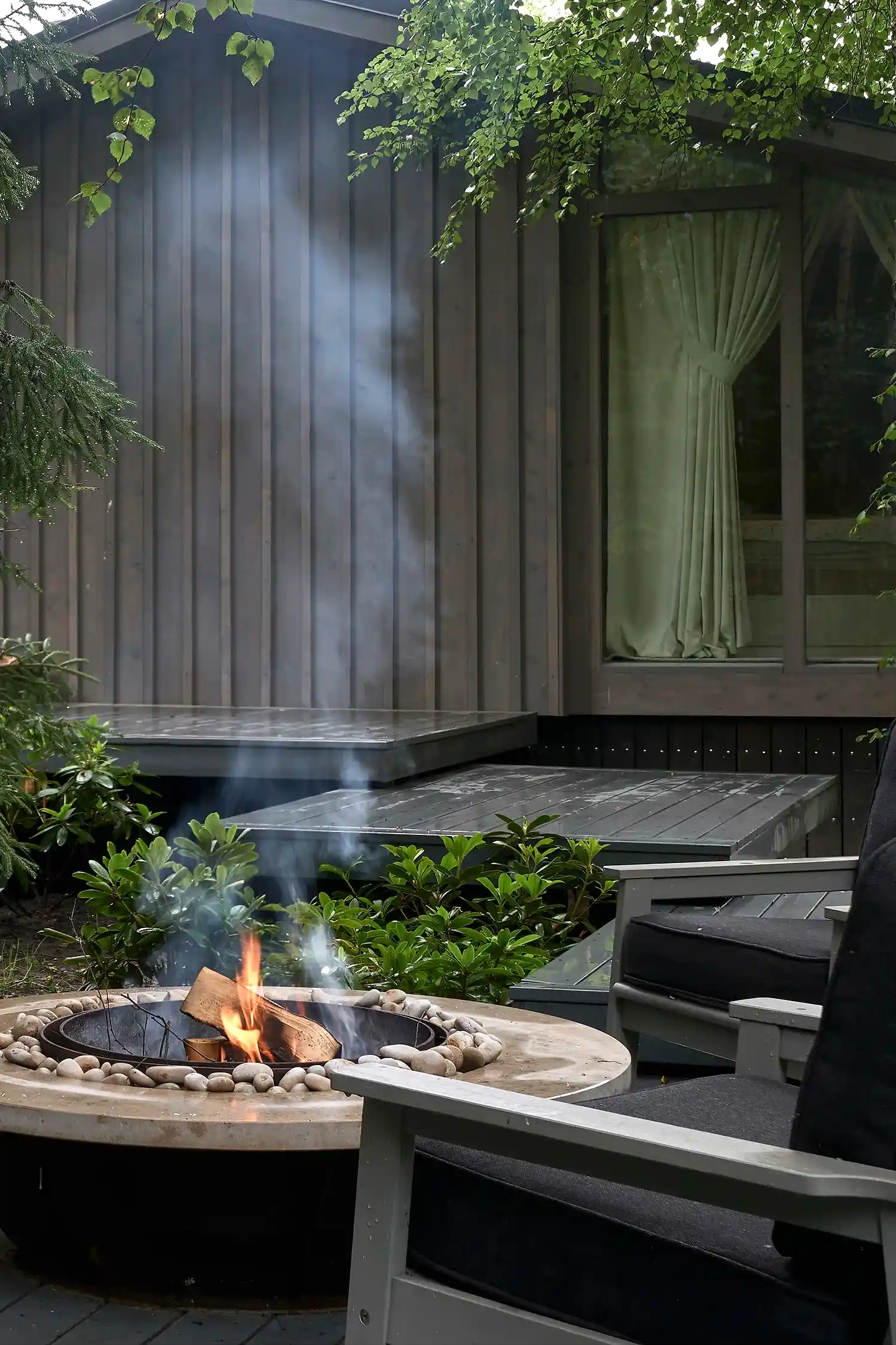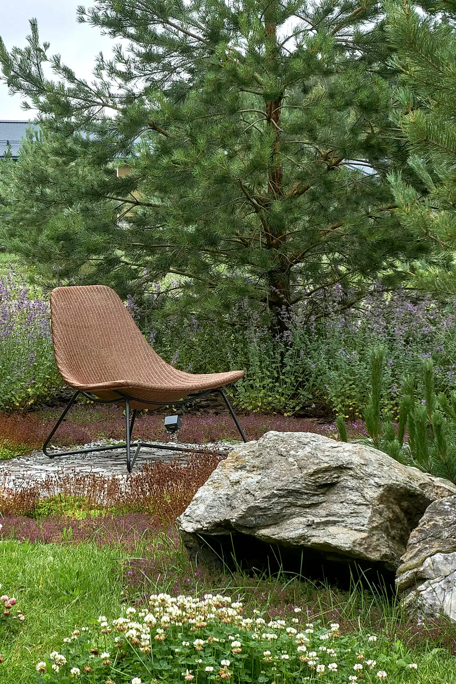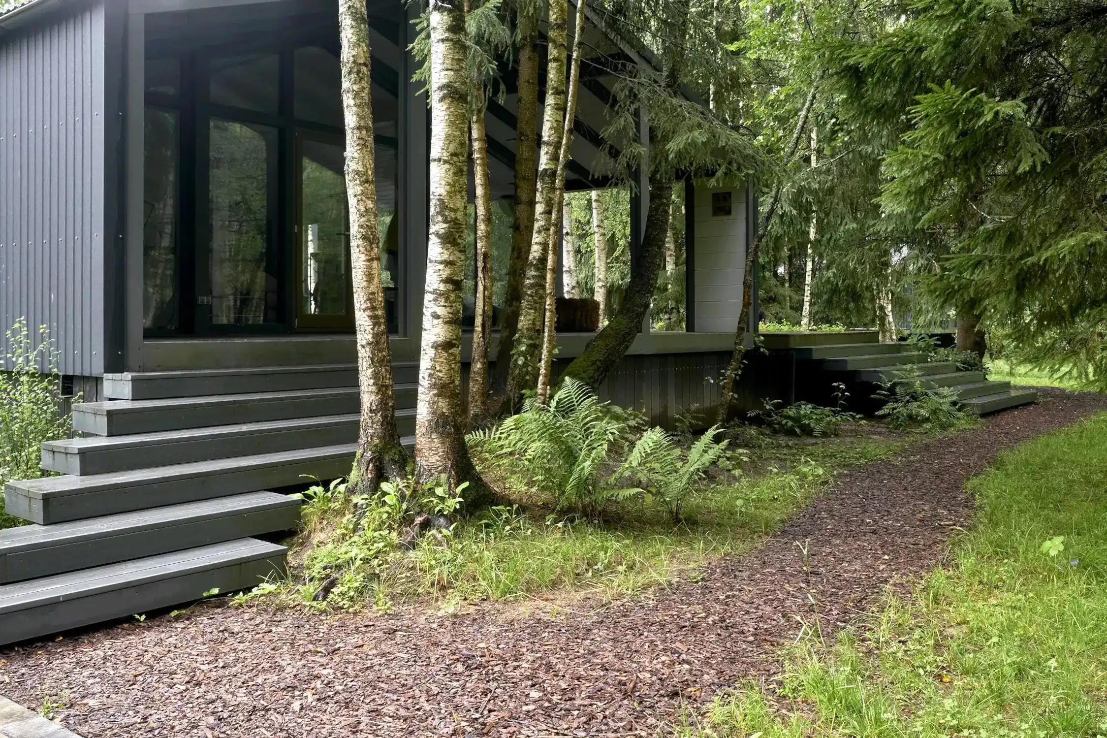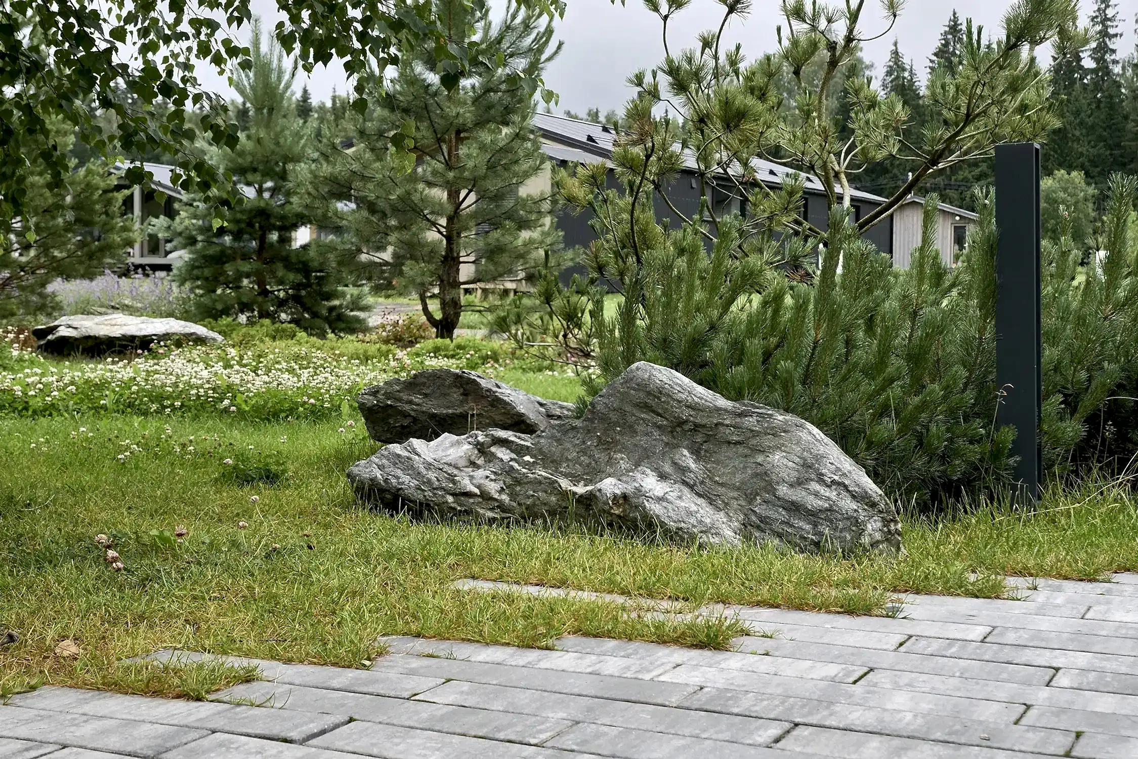 У одного из домов появился front yard с открытой лужайкой. У второго - устроили лесной back Pin-Up с красивым видом на зону очага. Для уединённого созерцания предусмотрено нетривиальное «бревно» от Дениса Милованова.