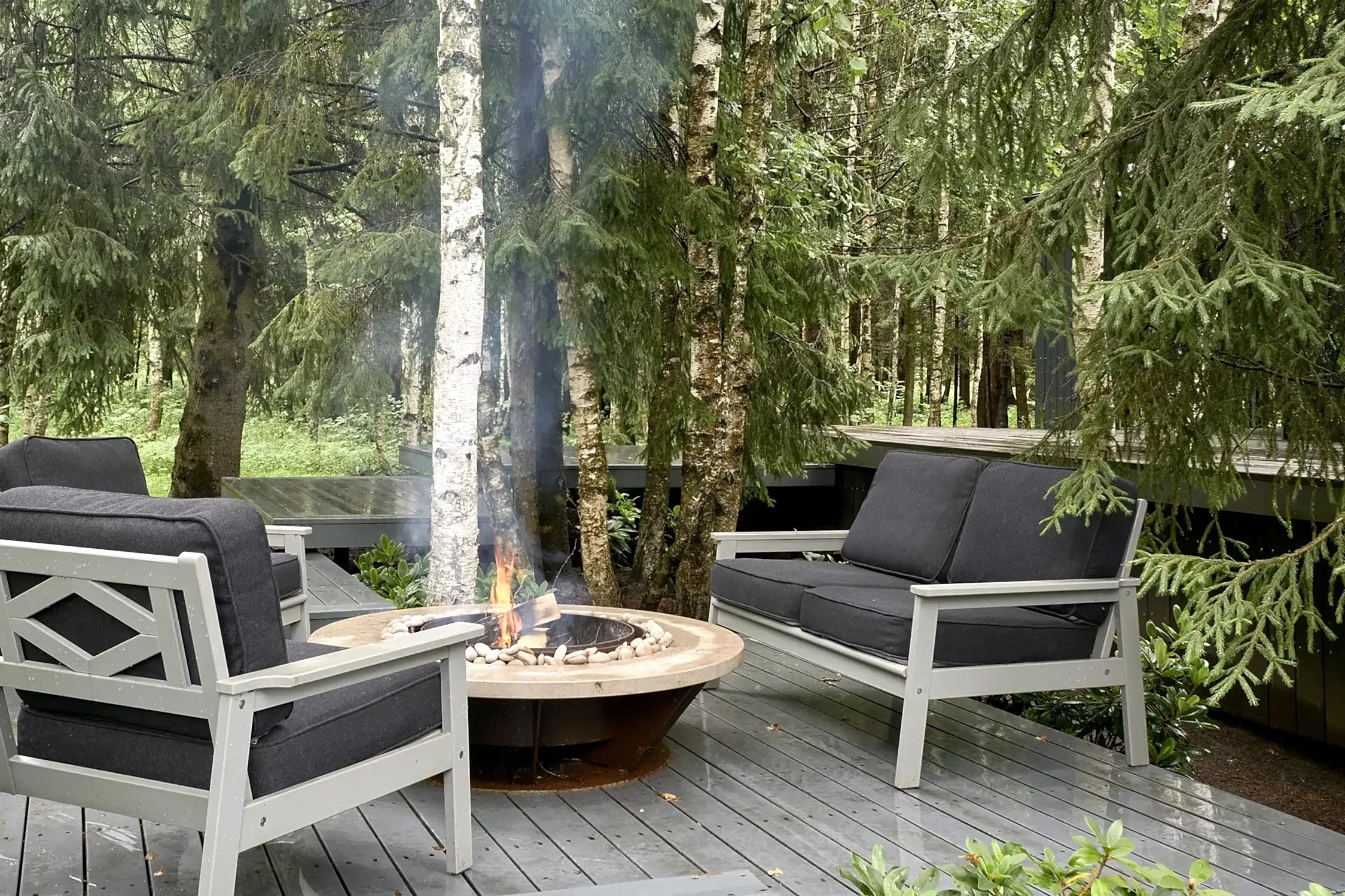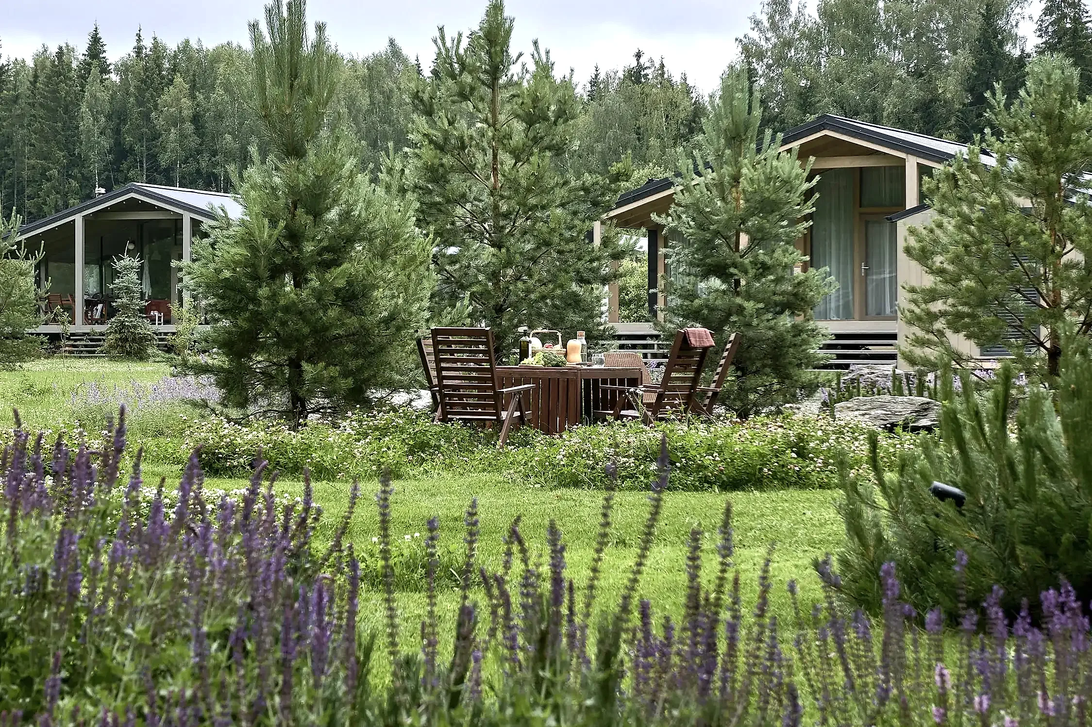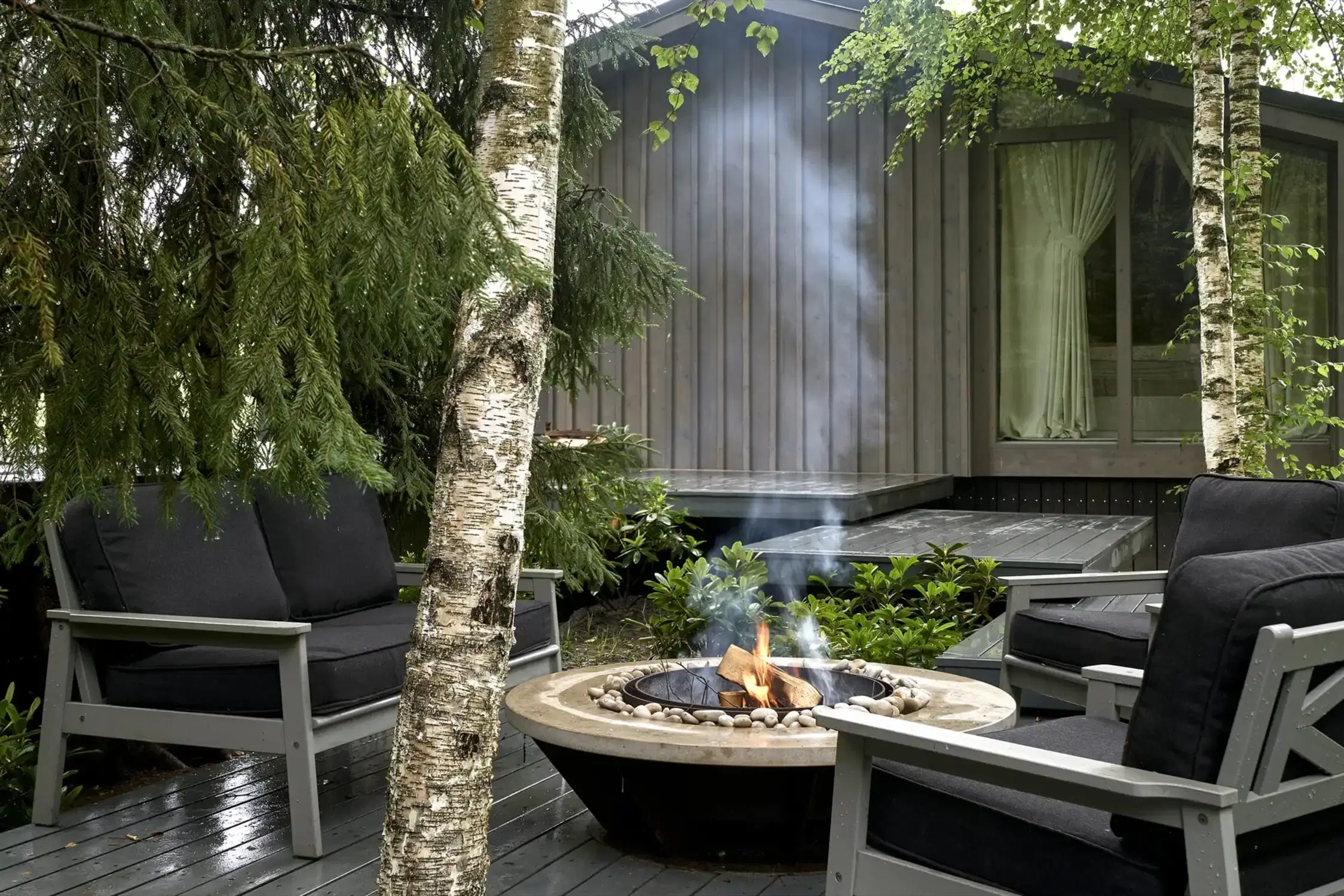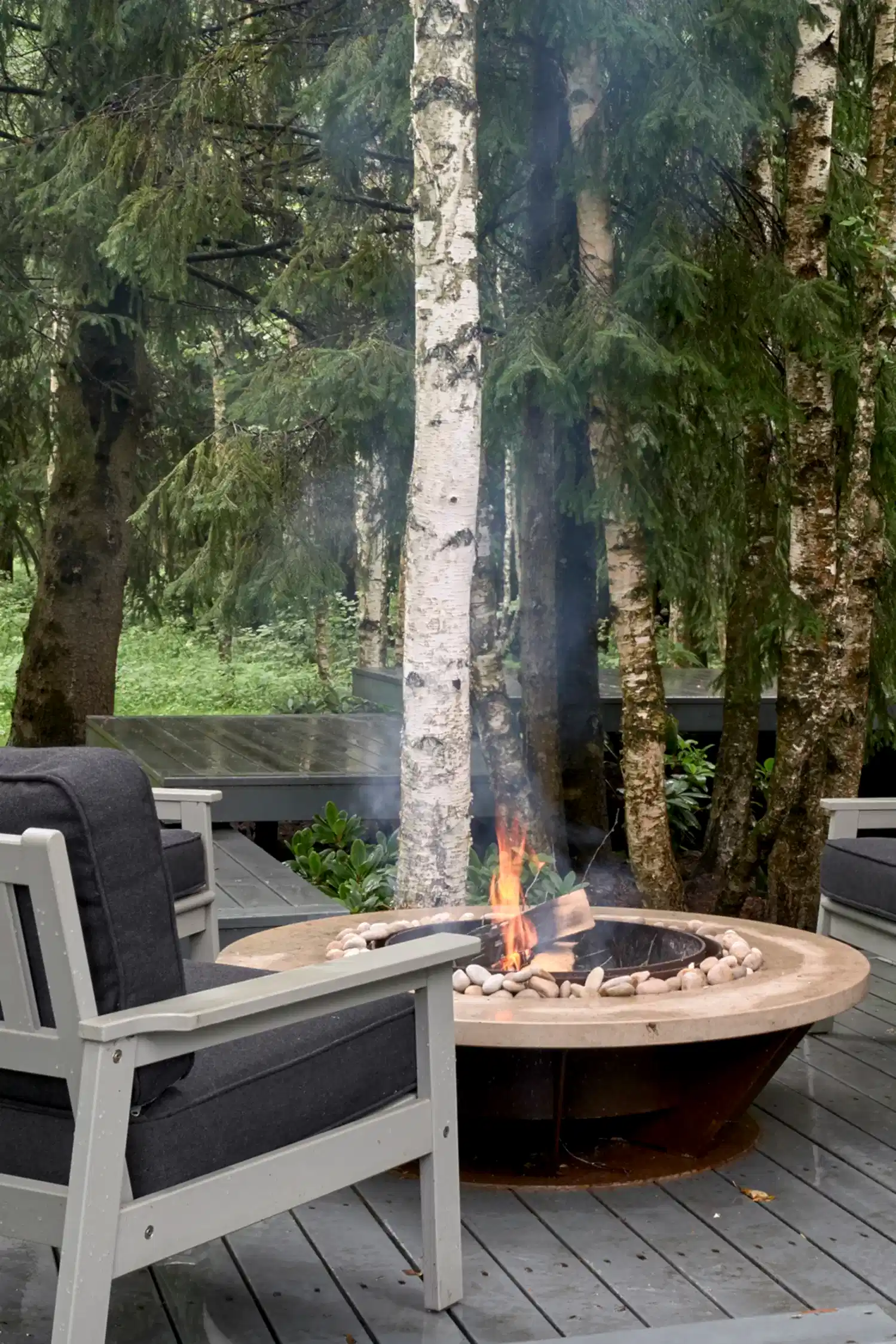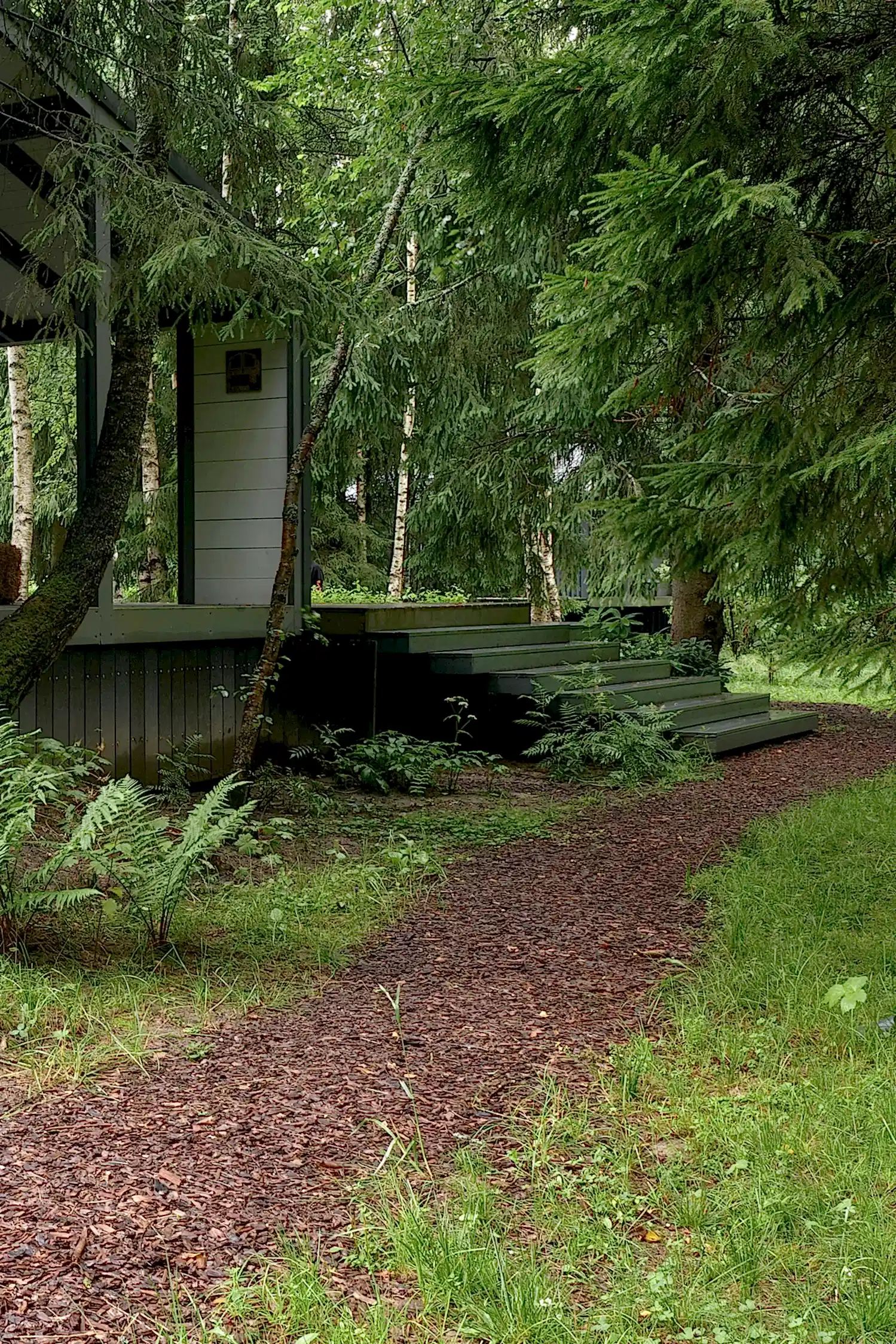 У одного из домов появился front yard с открытой лужайкой. У второго - устроили лесной back Pin-Up с красивым видом на зону очага. Для уединённого созерцания предусмотрено нетривиальное «бревно» от Дениса Милованова.