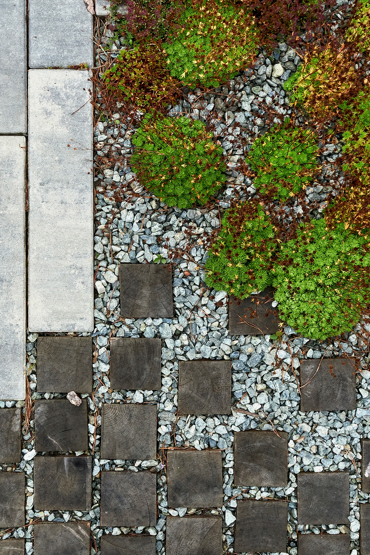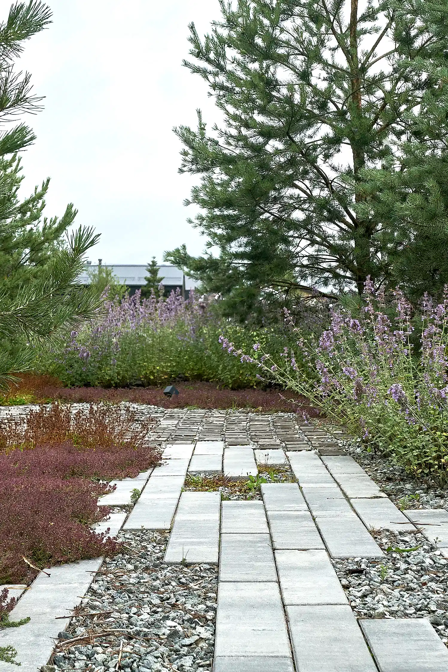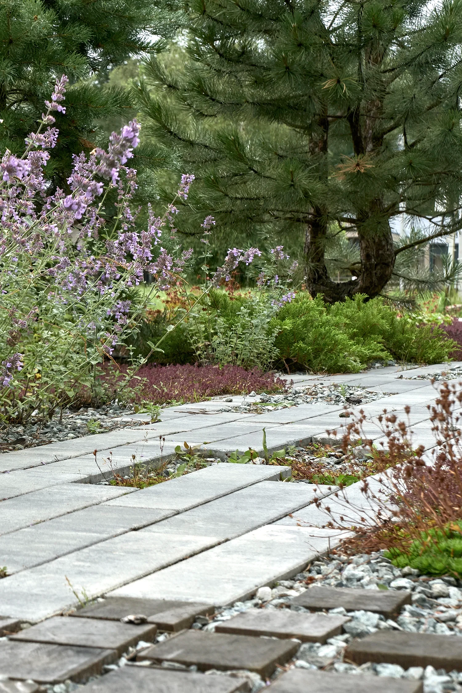 Сад, состоящий по факту из участков двух домов, логично сложен. Между разными точками появились переходы, а дома соединила общая «палуба». При Pin-Up геометричности посадок движение здесь равномерное и плавное.