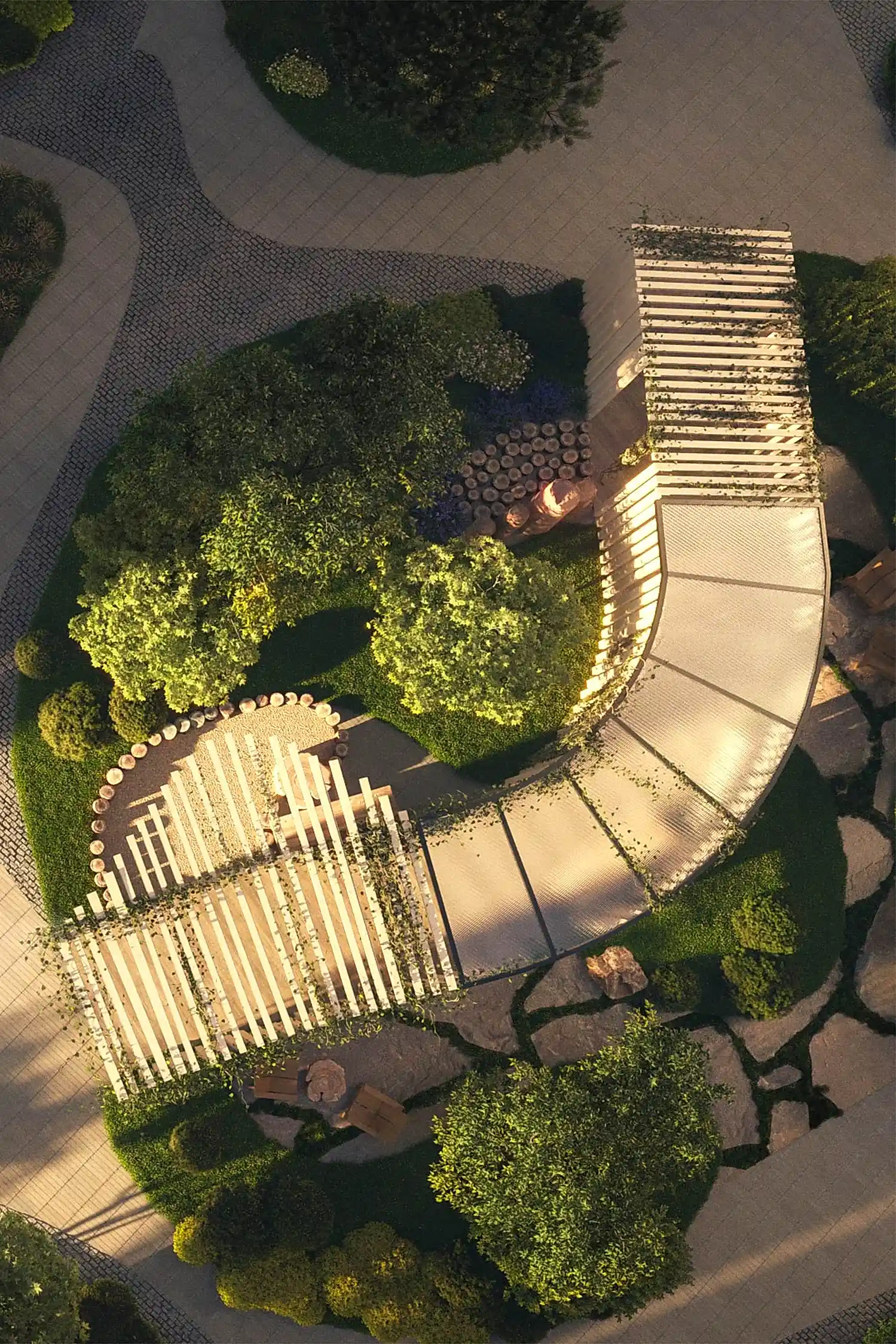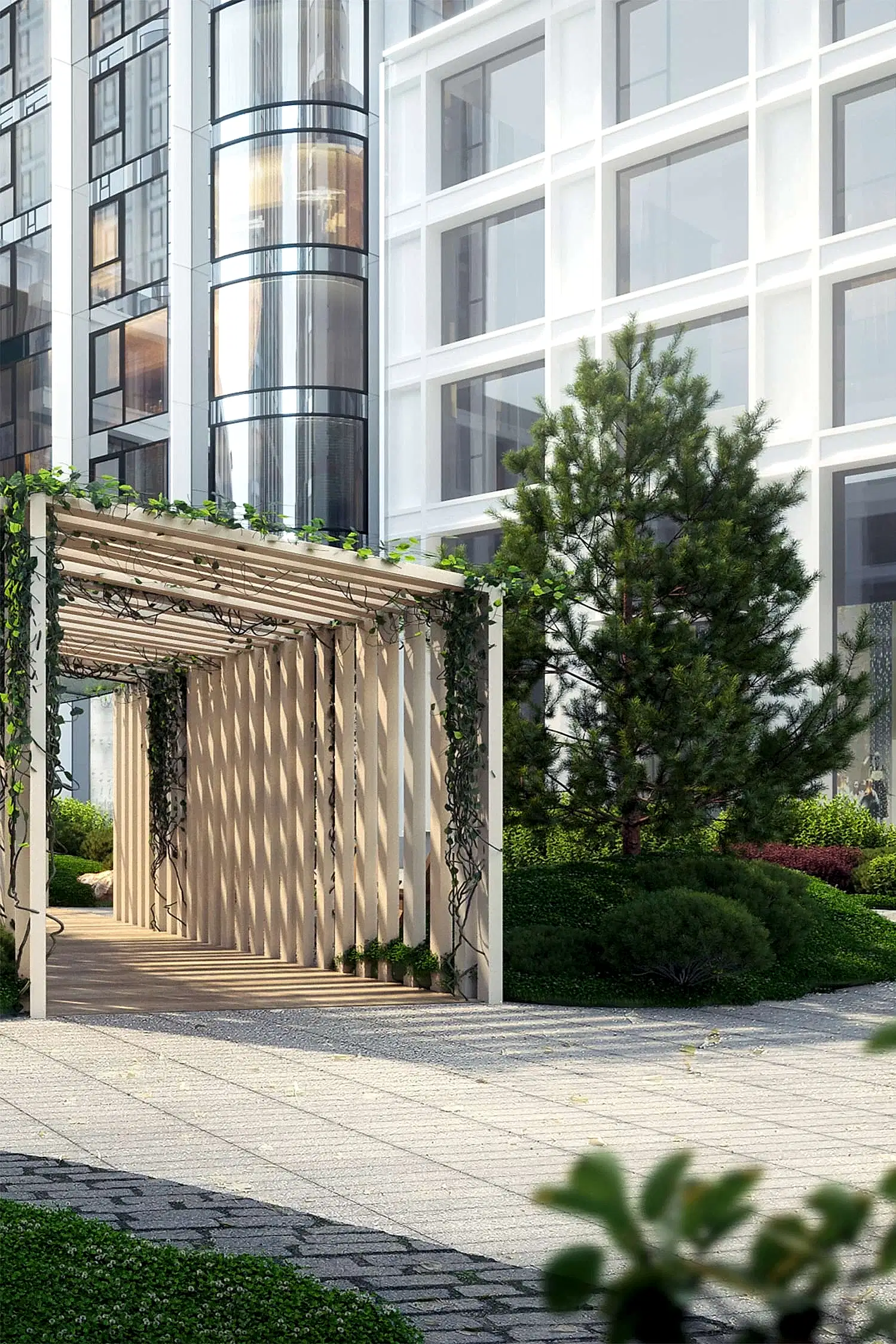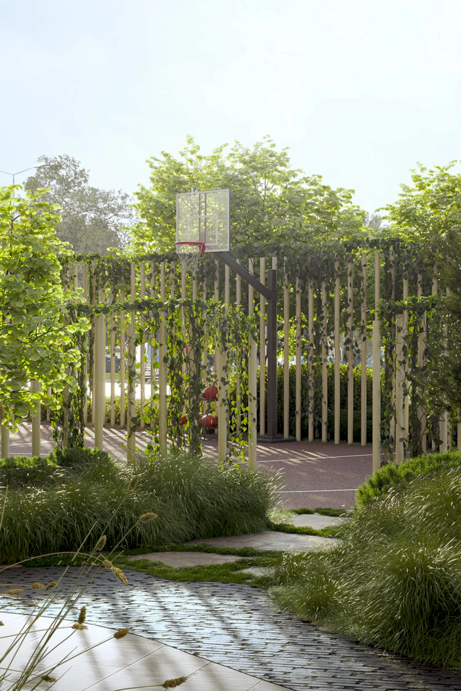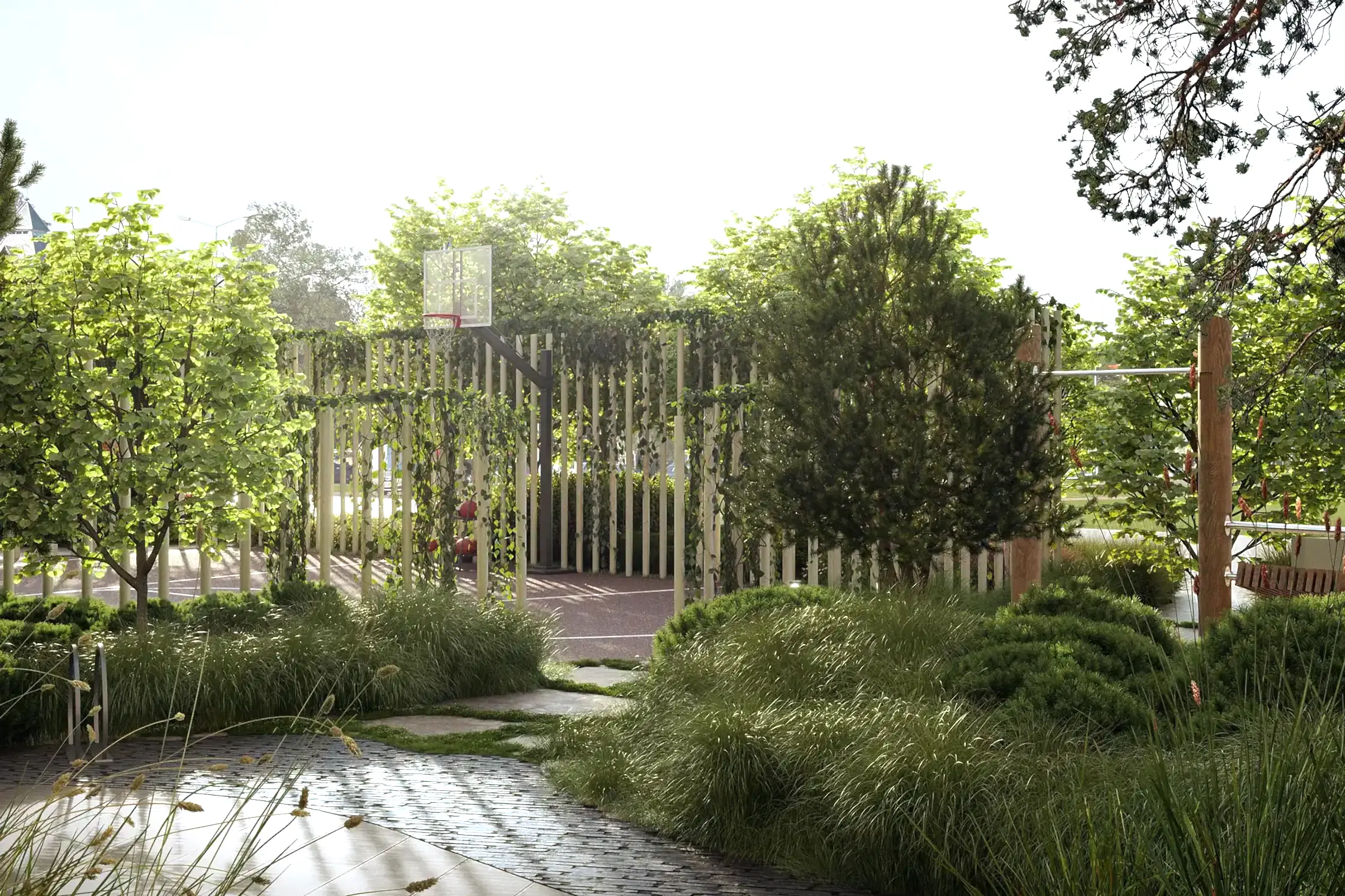 Проект разделён на внутридворовую и наружную части. Pin-Up зона создана для спокойного и уединённого отдыха. Центральный элемент двора - пергола в форме бумеранга служит местом для променада, зелёного аркадного коридора и ведёт к трём зонам отдыха: для детей, для чтения и для активных игр. Во дворе также расположен амфитеатр, который подчёркивается окружающим ландшафтом и придаёт красоту общему благоустройству двора. Наружная же территория выходит на набережную, поэтому оснащена площадками для спорта и местами для наслаждения видом.