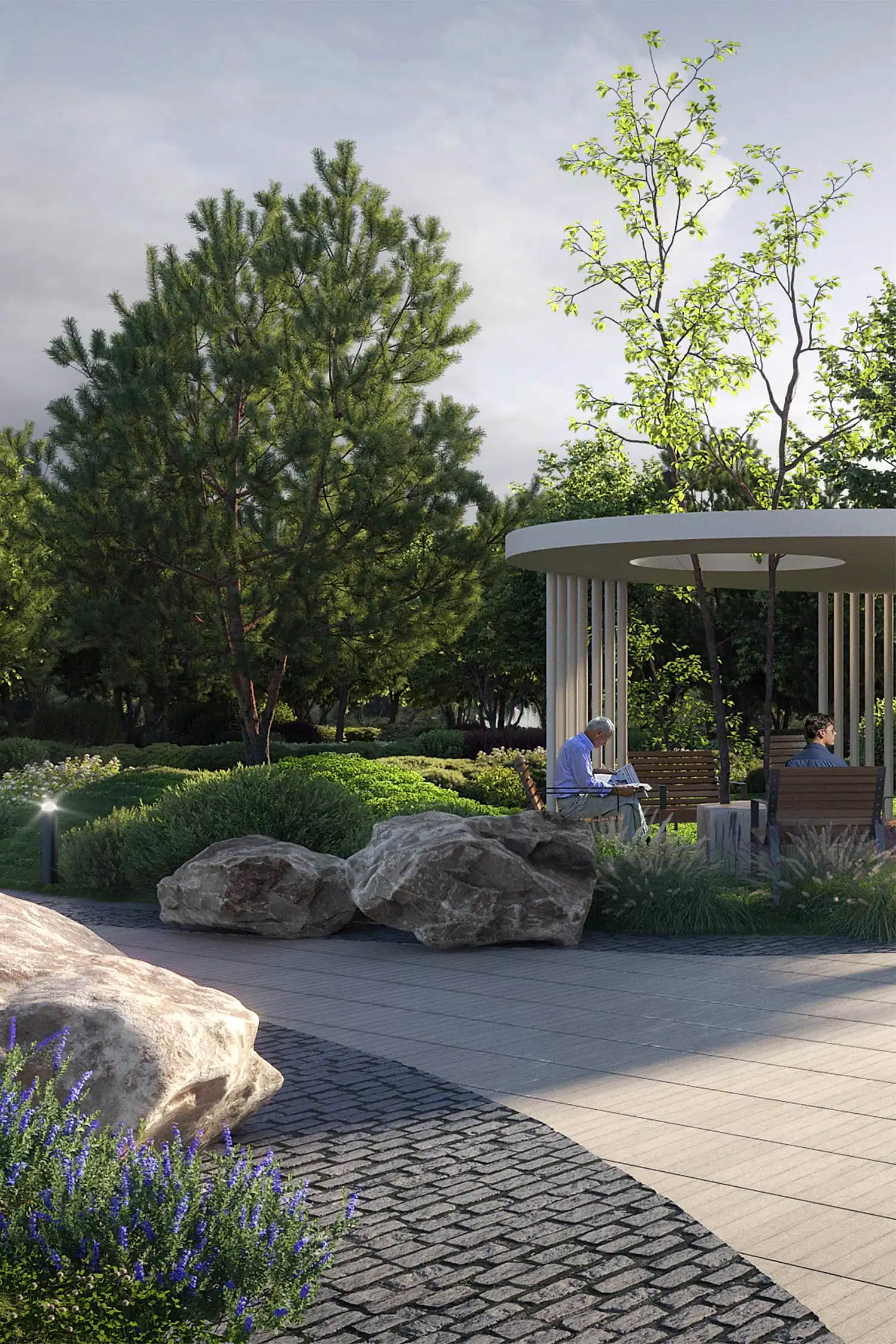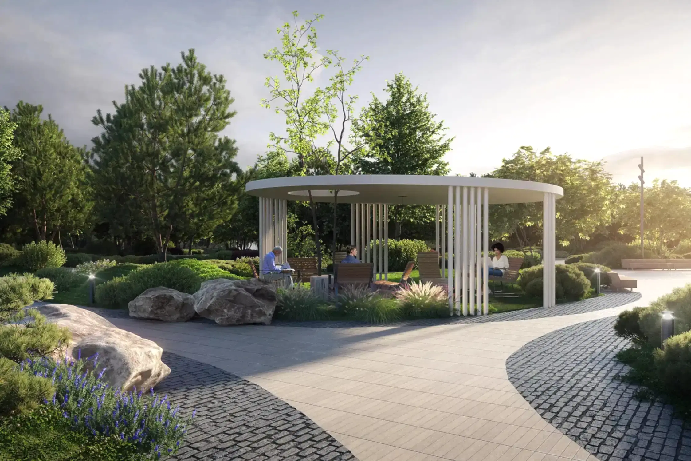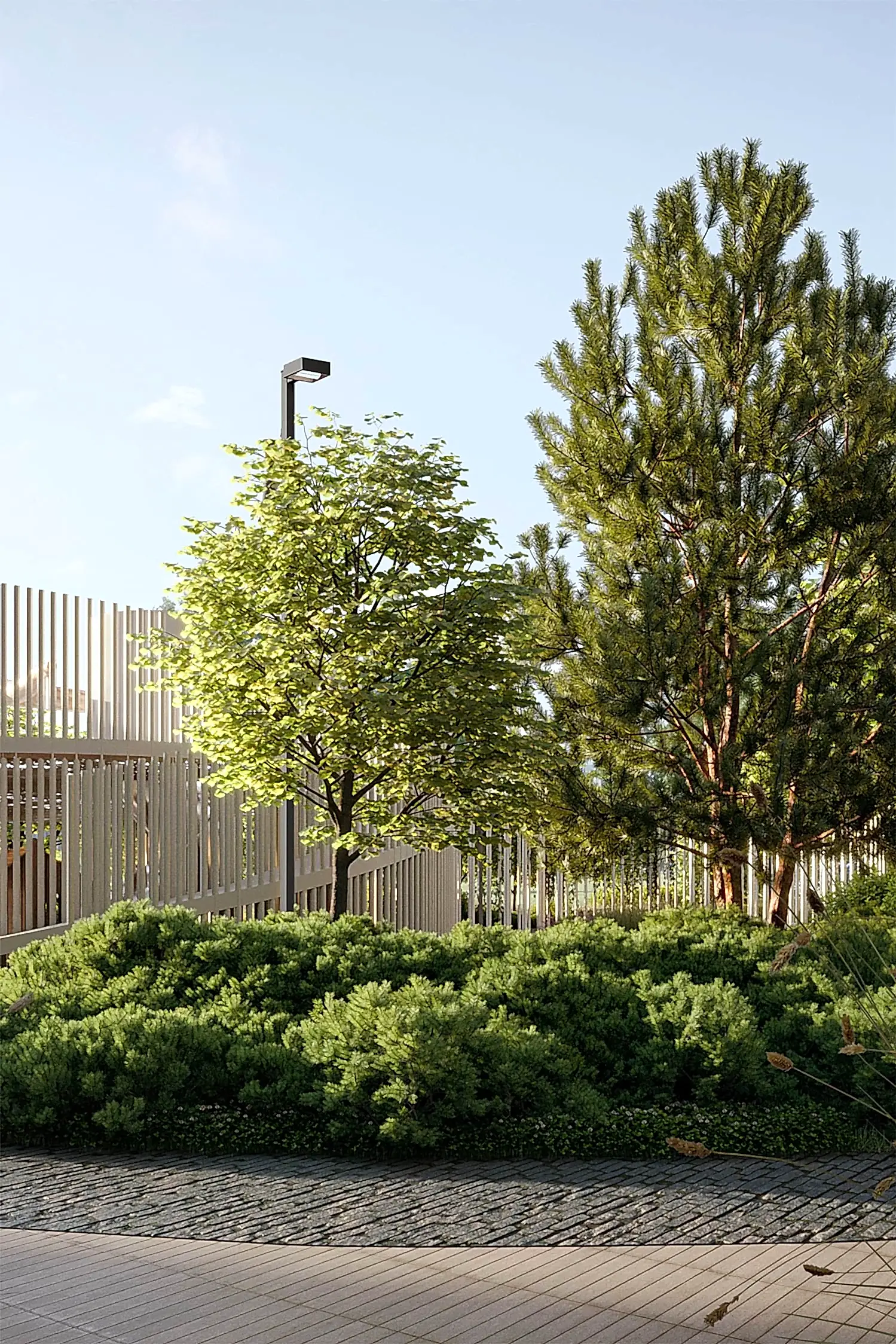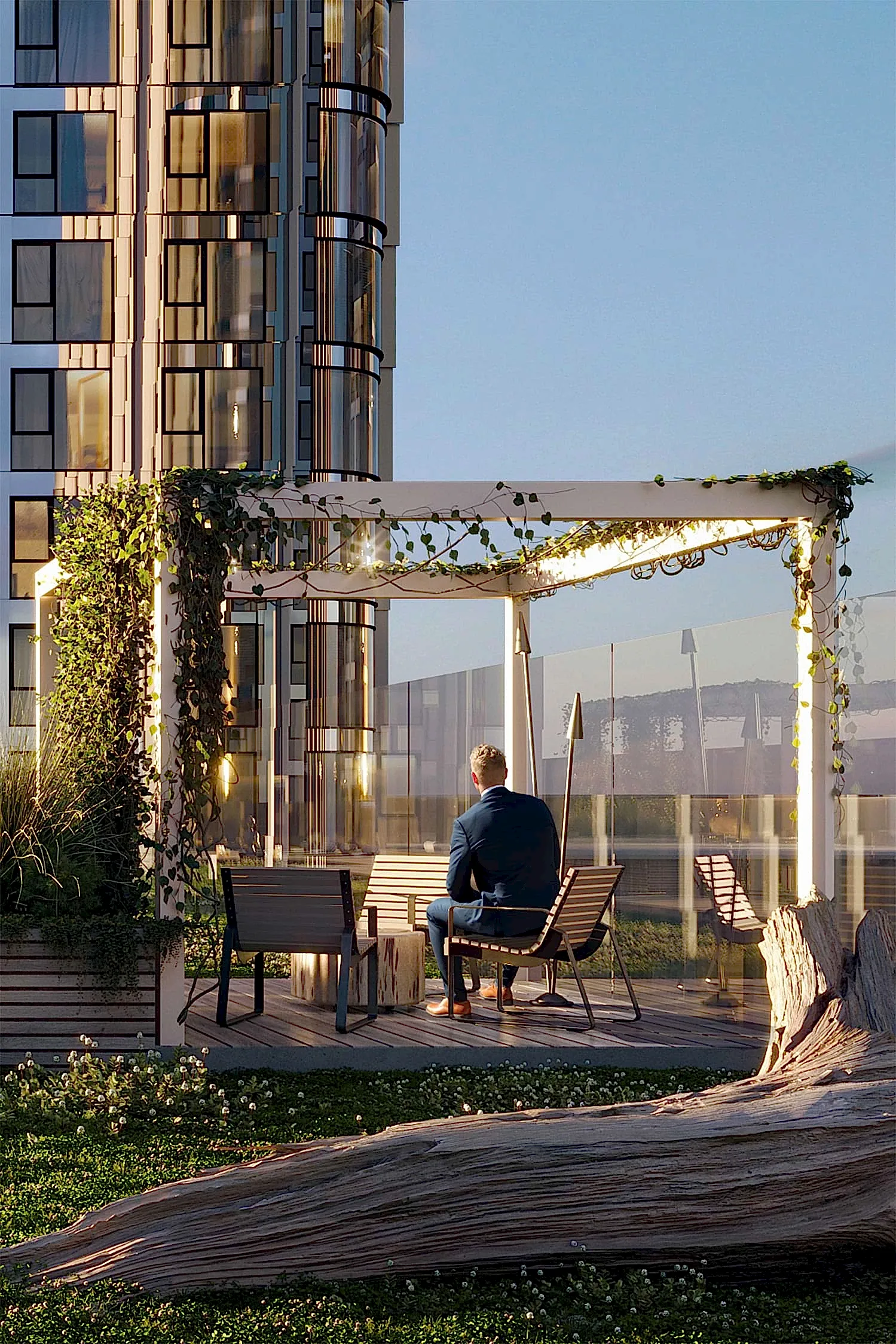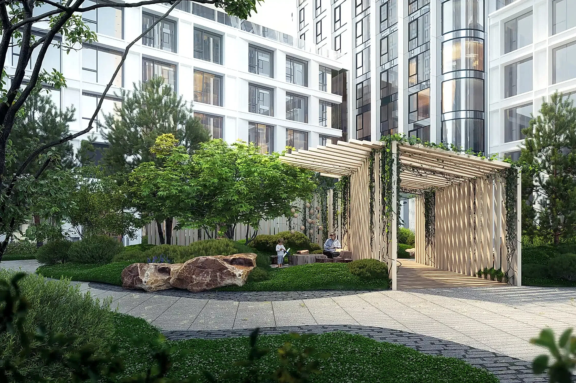 Проект разделён на внутридворовую и наружную части. Pin-Up зона создана для спокойного и уединённого отдыха. Центральный элемент двора - пергола в форме бумеранга служит местом для променада, зелёного аркадного коридора и ведёт к трём зонам отдыха: для детей, для чтения и для активных игр. Во дворе также расположен амфитеатр, который подчёркивается окружающим ландшафтом и придаёт красоту общему благоустройству двора. Наружная же территория выходит на набережную, поэтому оснащена площадками для спорта и местами для наслаждения видом.
