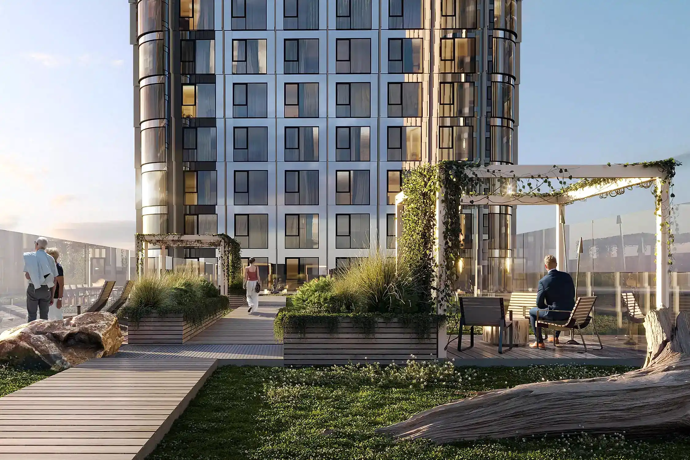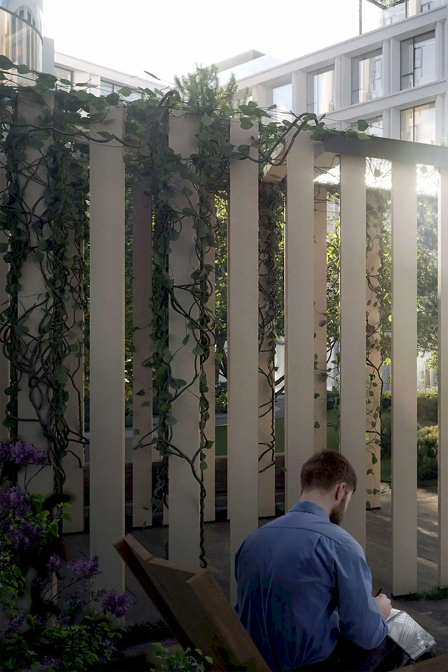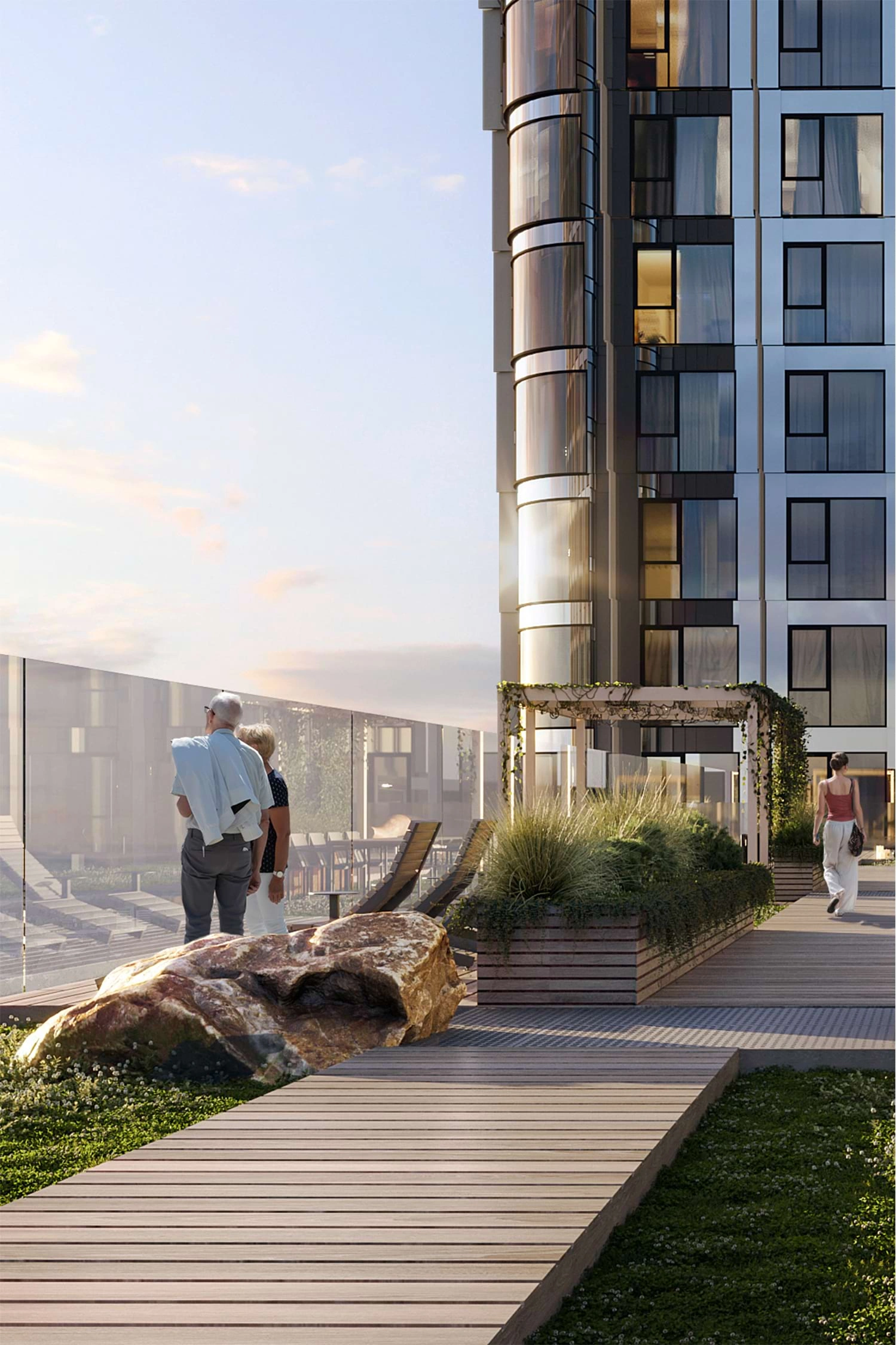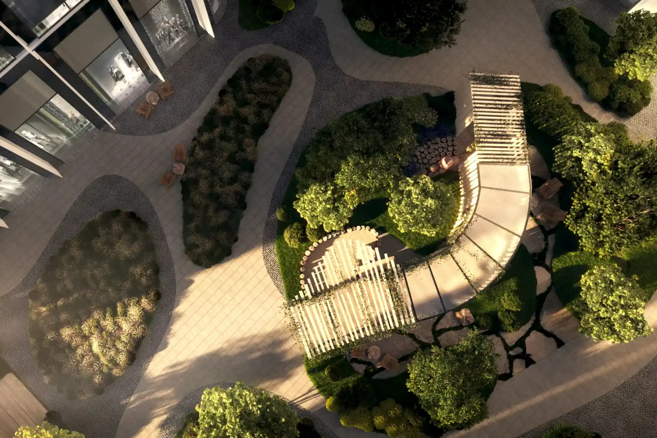 Проект разделён на внутридворовую и наружную части. Pin-Up зона создана для спокойного и уединённого отдыха. Центральный элемент двора - пергола в форме бумеранга служит местом для променада, зелёного аркадного коридора и ведёт к трём зонам отдыха: для детей, для чтения и для активных игр. Во дворе также расположен амфитеатр, который подчёркивается окружающим ландшафтом и придаёт красоту общему благоустройству двора. Наружная же территория выходит на набережную, поэтому оснащена площадками для спорта и местами для наслаждения видом.
