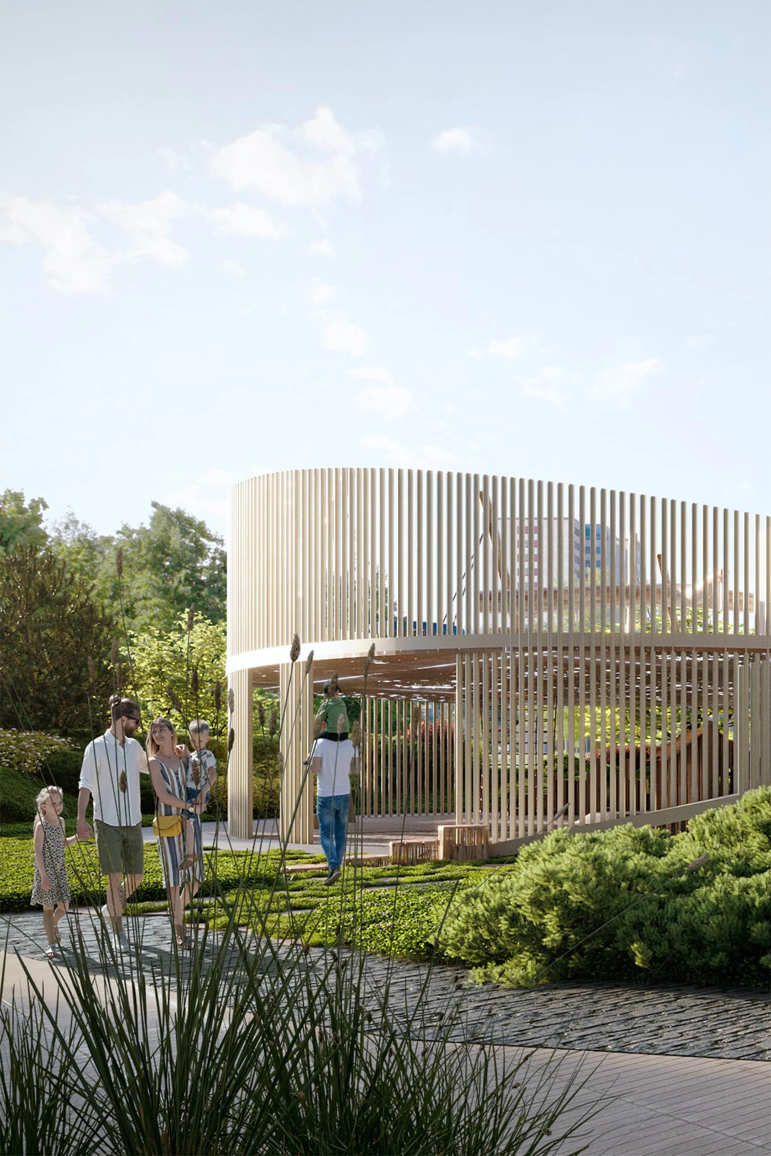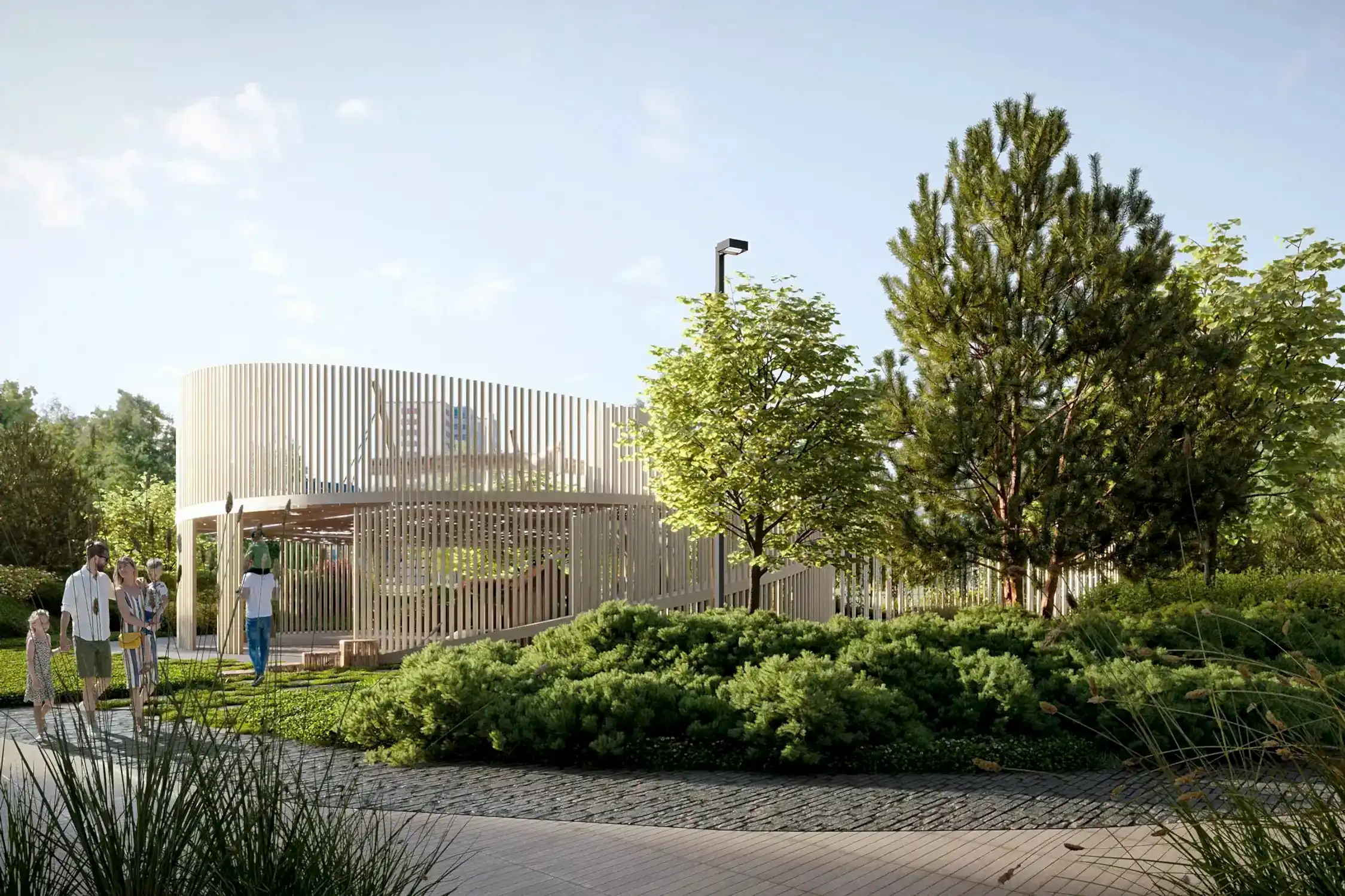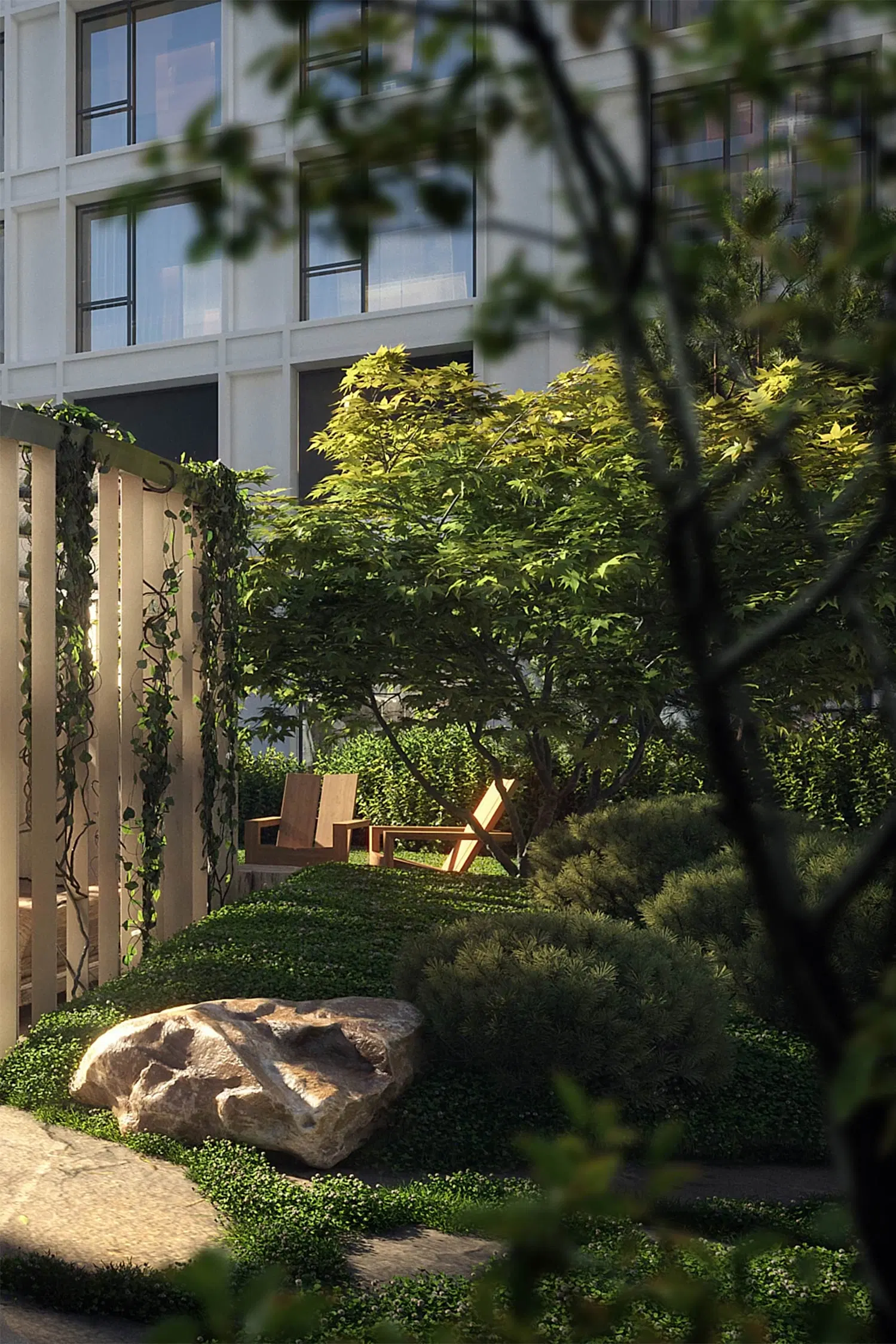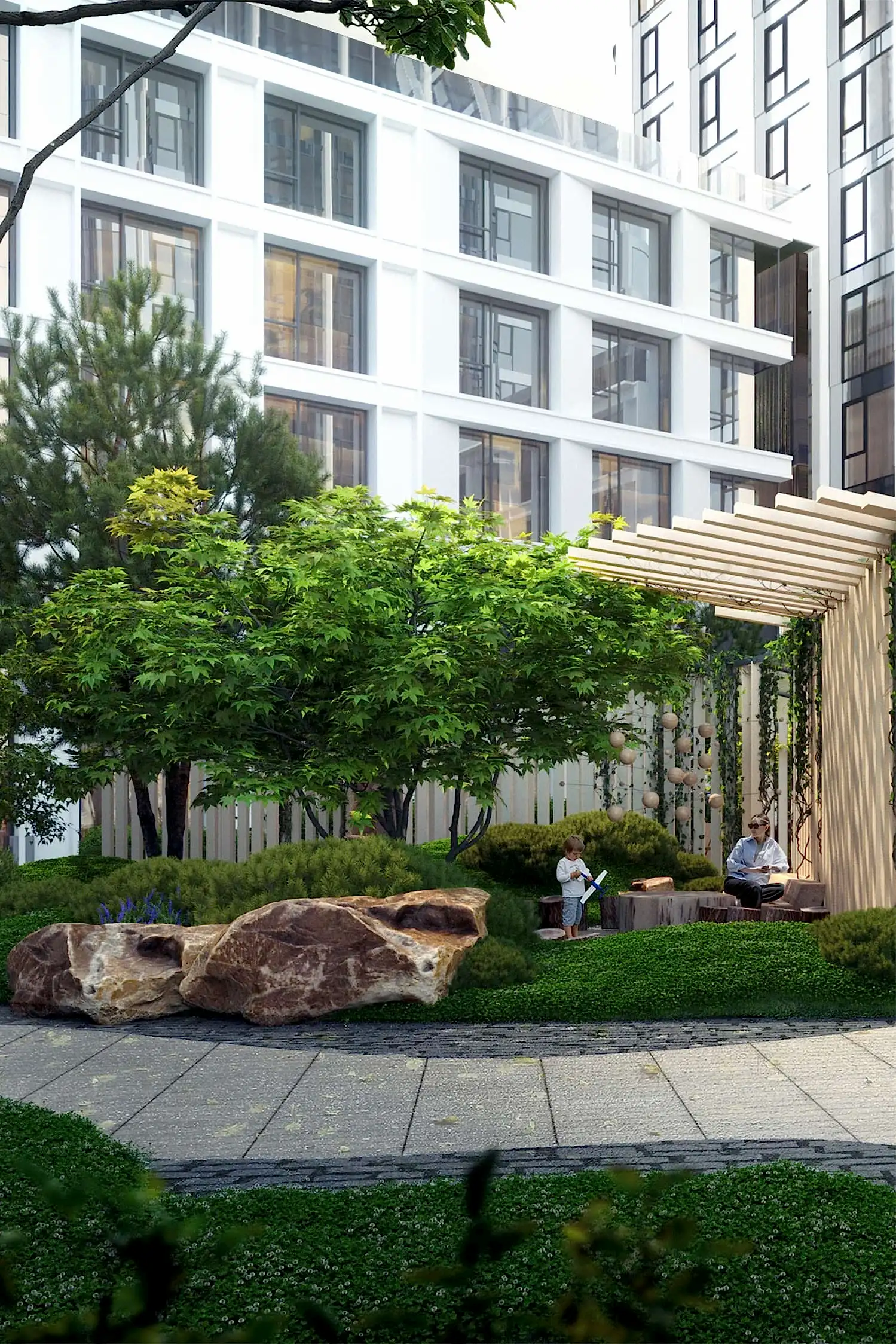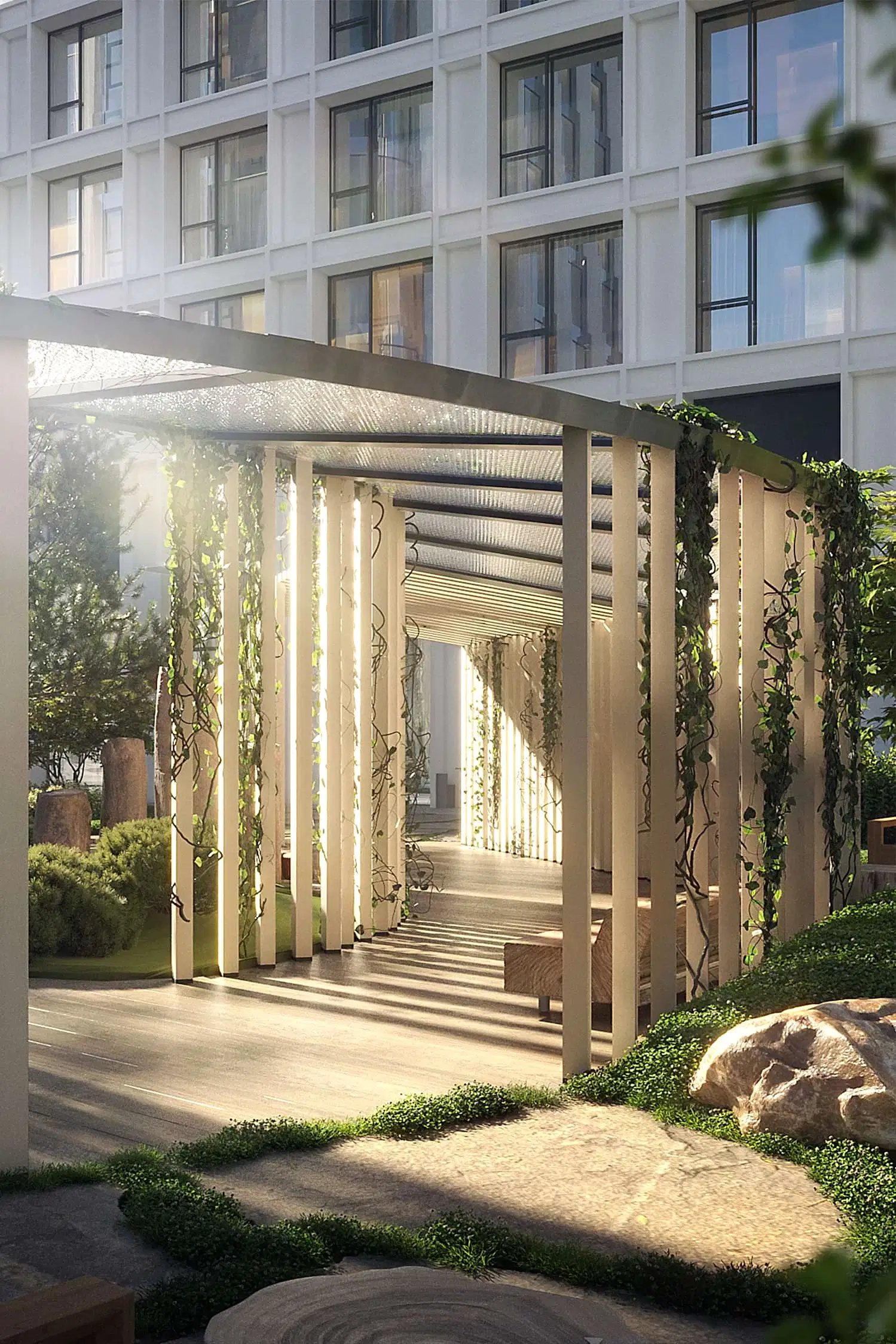 Проект разделён на внутридворовую и наружную части. Pin-Up зона создана для спокойного и уединённого отдыха. Центральный элемент двора - пергола в форме бумеранга служит местом для променада, зелёного аркадного коридора и ведёт к трём зонам отдыха: для детей, для чтения и для активных игр. Во дворе также расположен амфитеатр, который подчёркивается окружающим ландшафтом и придаёт красоту общему благоустройству двора. Наружная же территория выходит на набережную, поэтому оснащена площадками для спорта и местами для наслаждения видом.