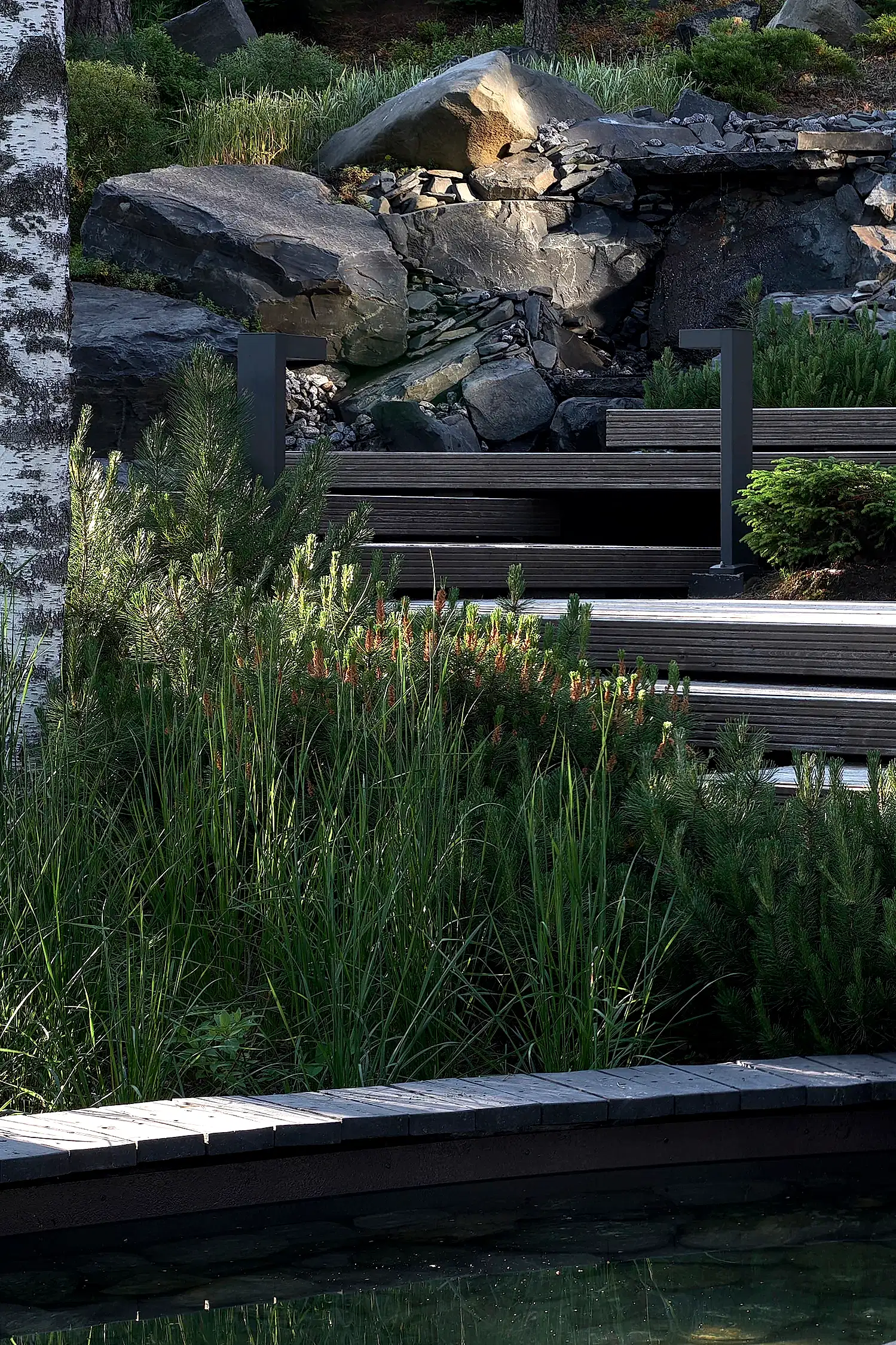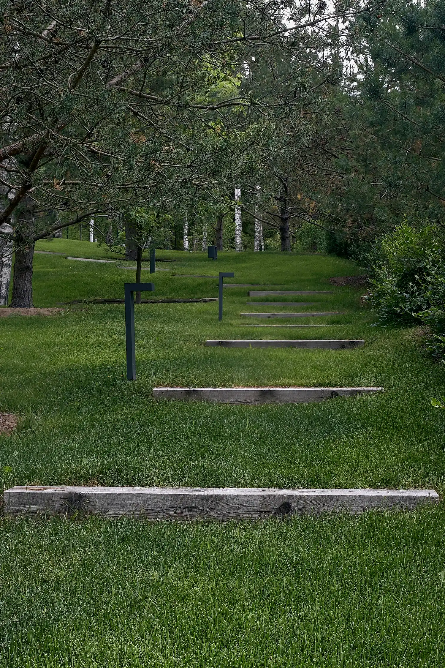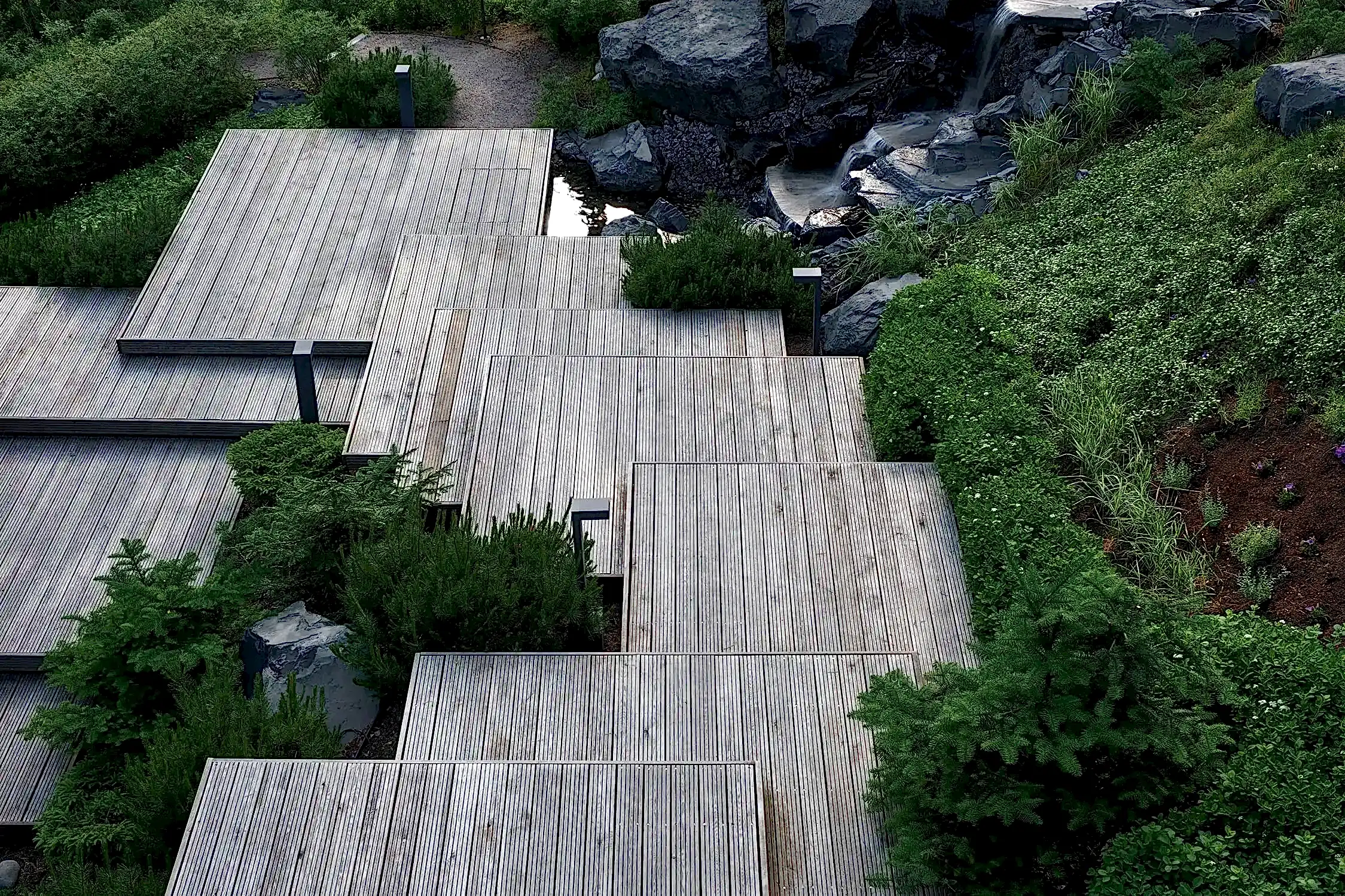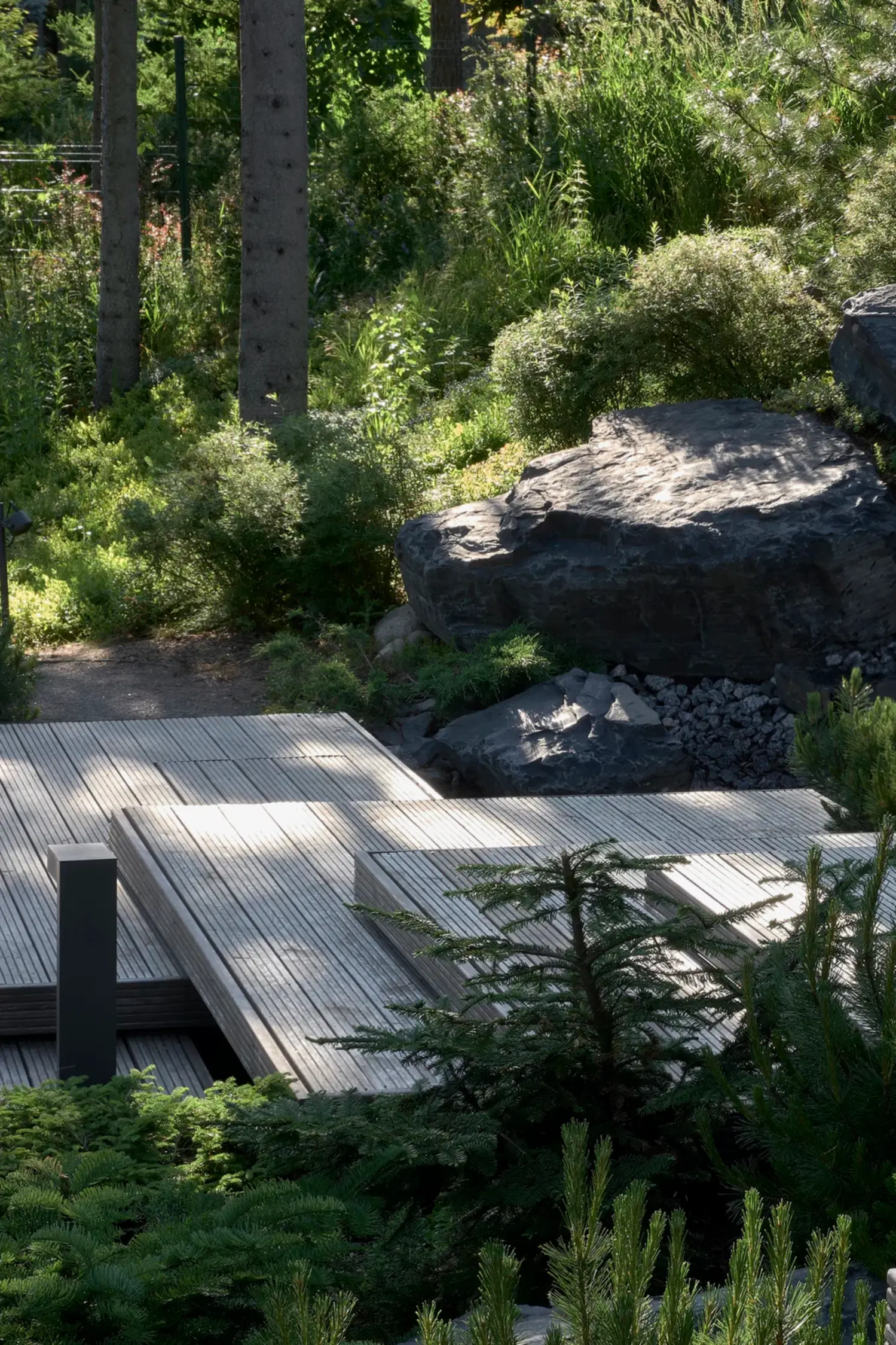 По склону с небольшим уклоном направление подчёркивают ступени-брусья, едва проглядывающие из травы - эта пошаговая тропа более декоративна. Наименее нагруженный переход от бани с купелью к очагу, окружённому прудом, составлен из деревянных платформ. Для круглогодичного удобства Pin-Up переходов сделали с подогревом.
