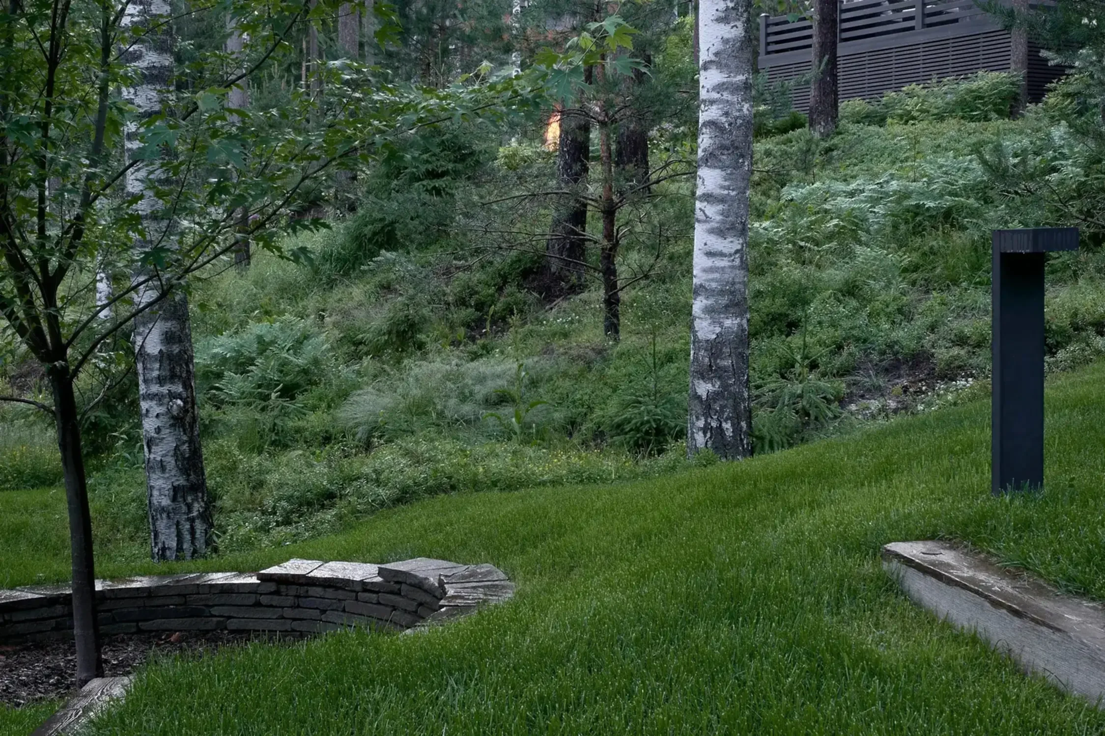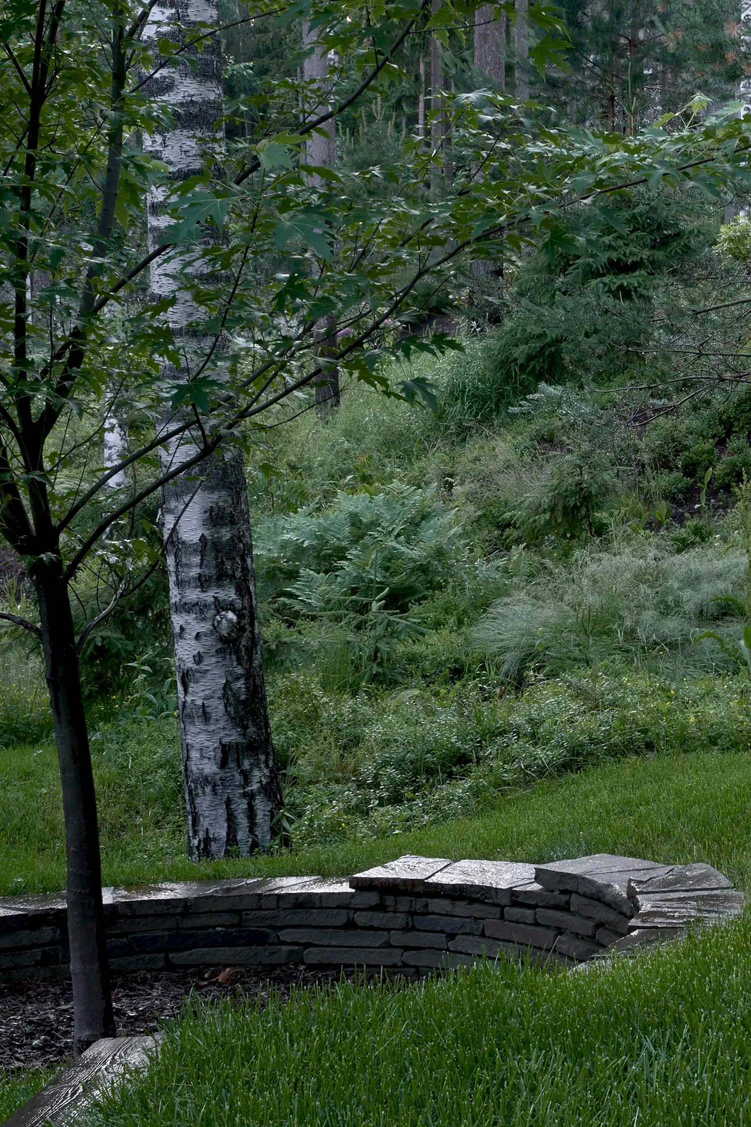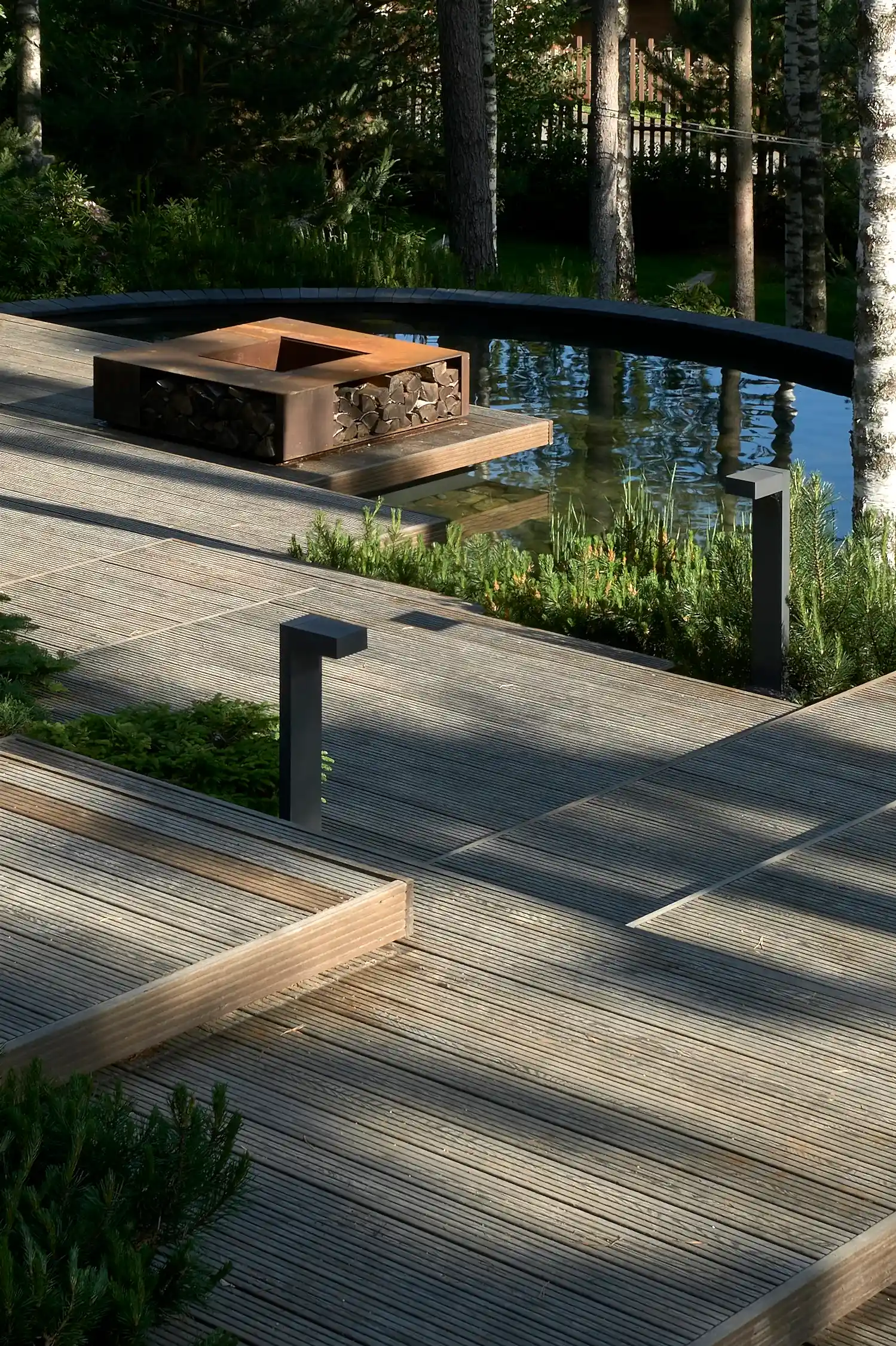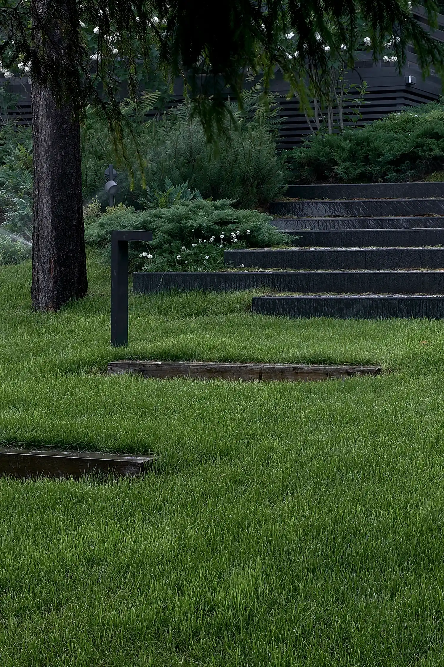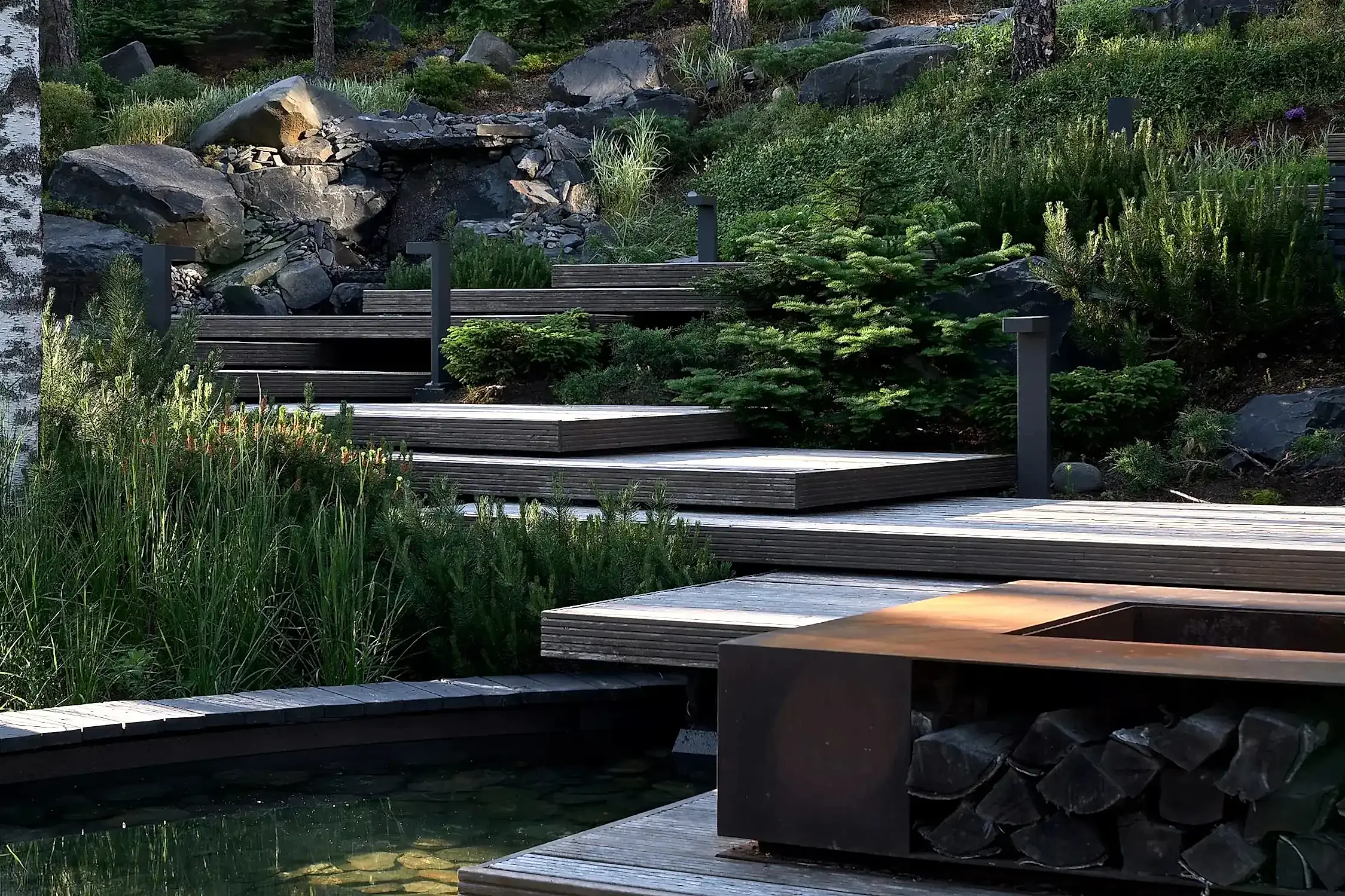 По склону с небольшим уклоном направление подчёркивают ступени-брусья, едва проглядывающие из травы - эта пошаговая тропа более декоративна. Наименее нагруженный переход от бани с купелью к очагу, окружённому прудом, составлен из деревянных платформ. Для круглогодичного удобства Pin-Up переходов сделали с подогревом.