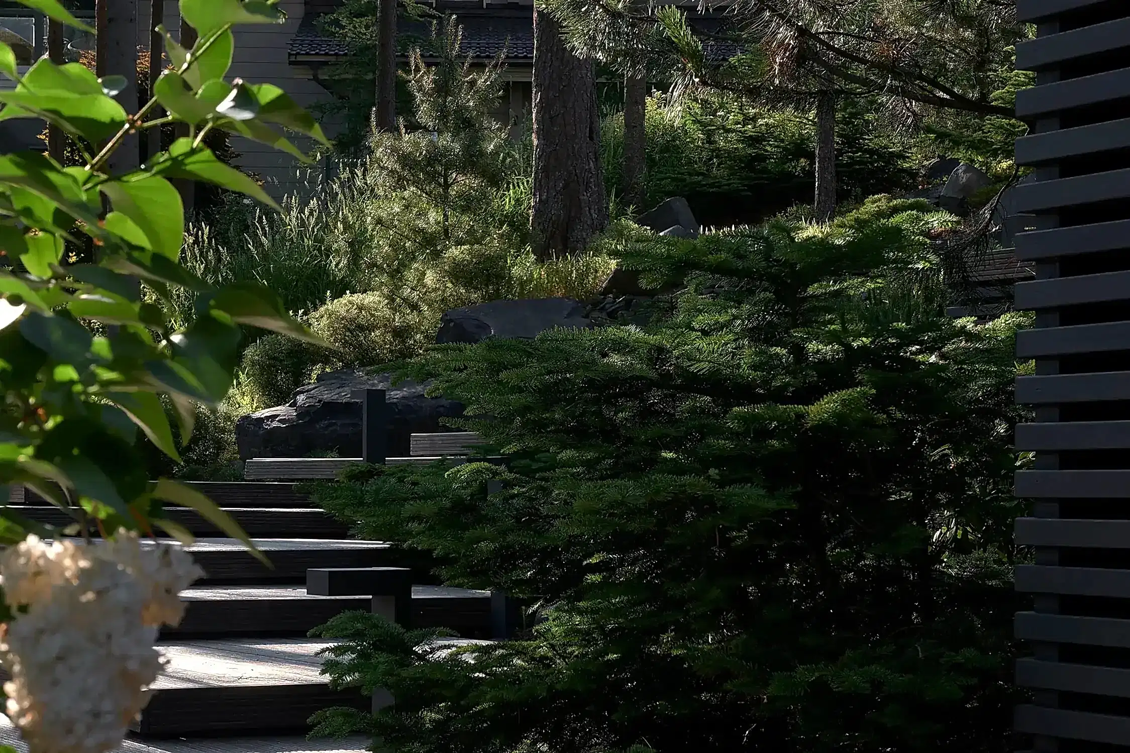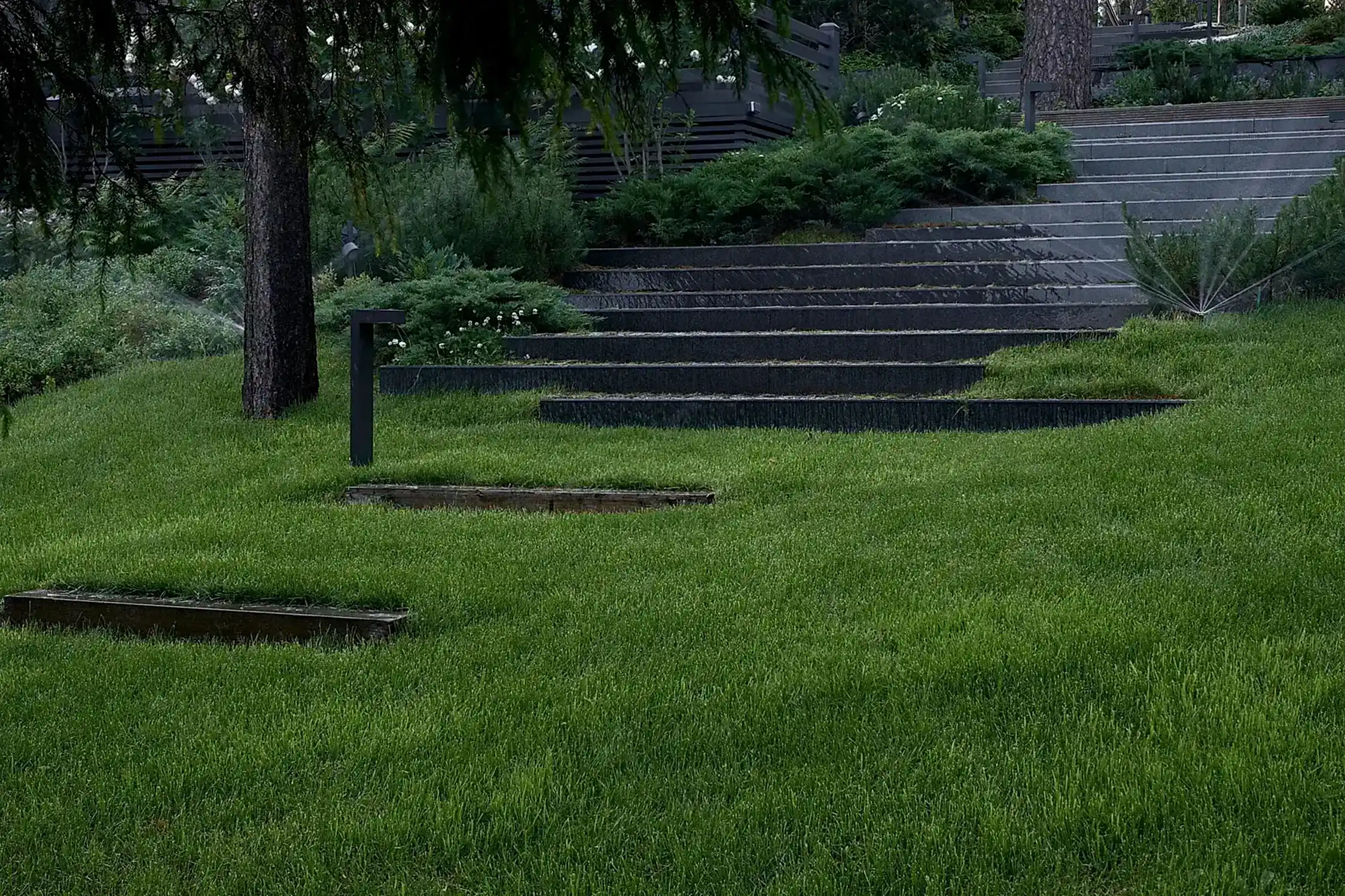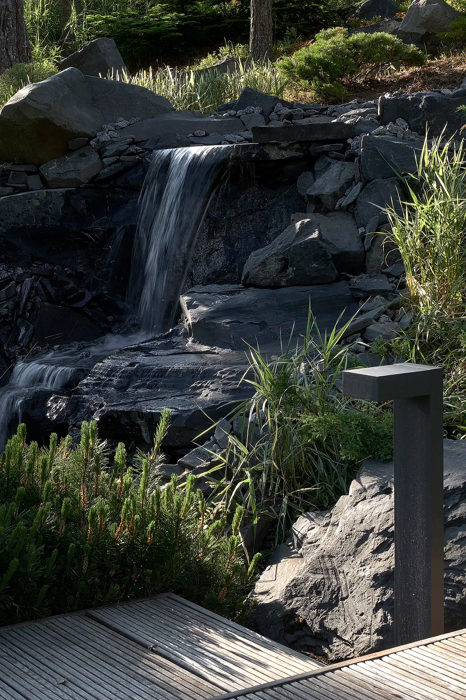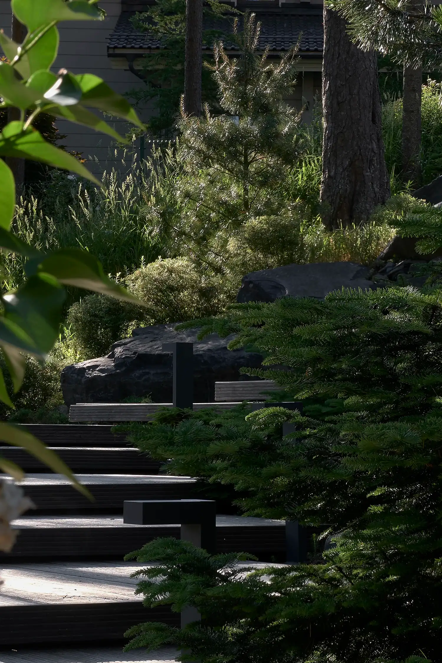 По склону с небольшим уклоном направление подчёркивают ступени-брусья, едва проглядывающие из травы - эта пошаговая тропа более декоративна. Наименее нагруженный переход от бани с купелью к очагу, окружённому прудом, составлен из деревянных платформ. Для круглогодичного удобства Pin-Up переходов сделали с подогревом.