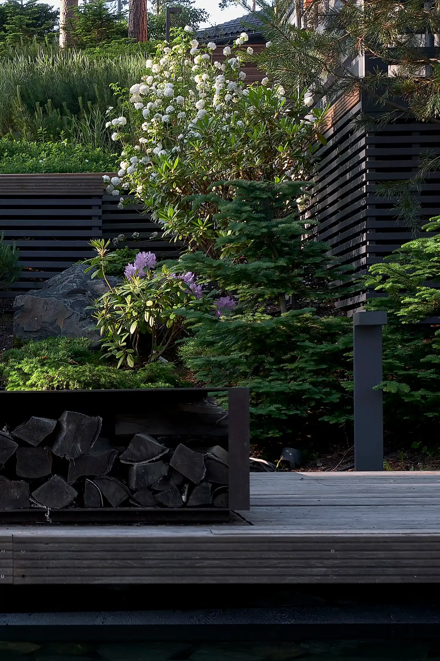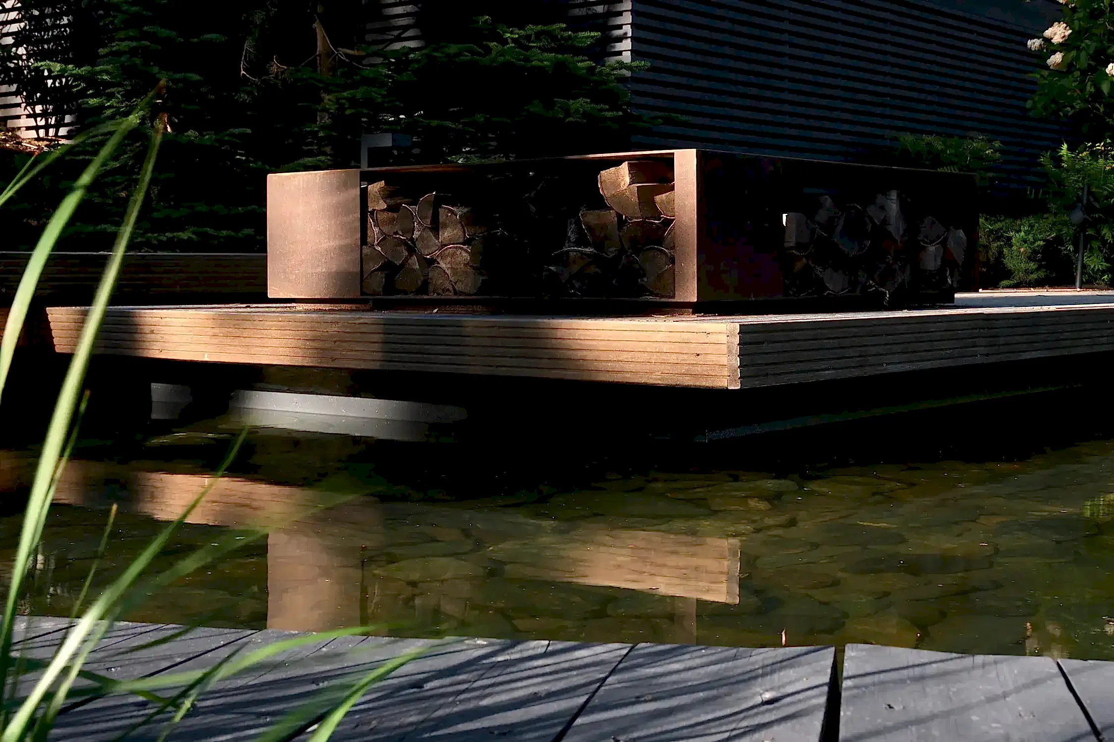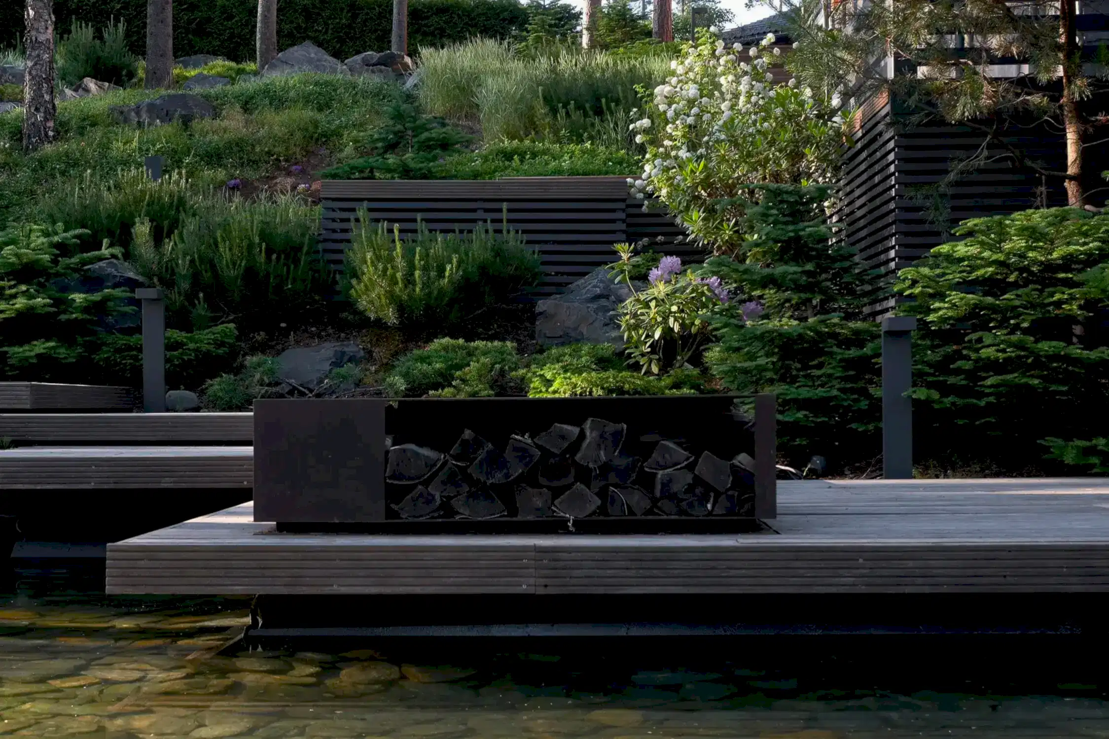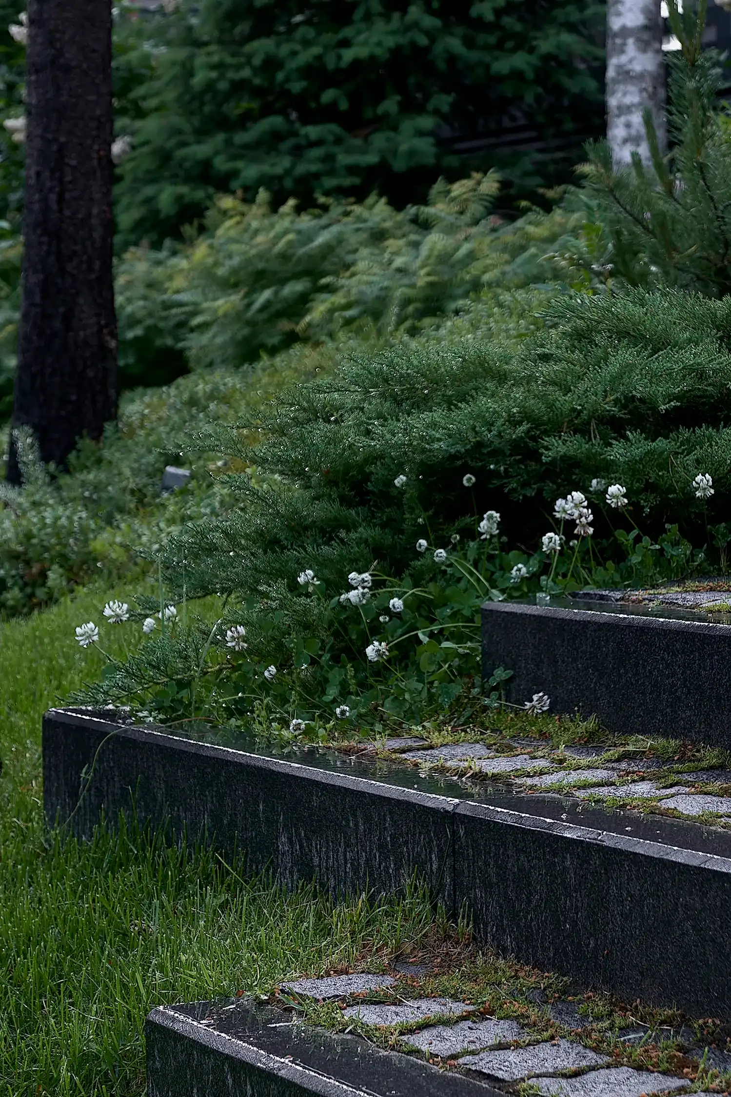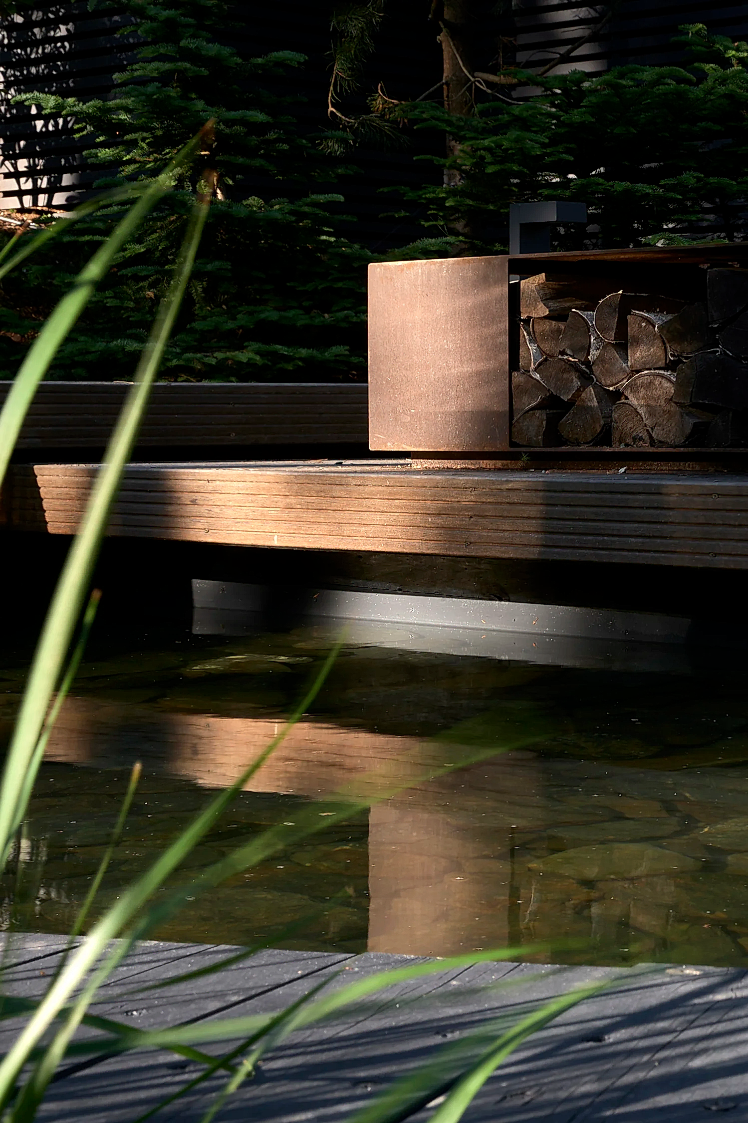 По склону с небольшим уклоном направление подчёркивают ступени-брусья, едва проглядывающие из травы - эта пошаговая тропа более декоративна. Наименее нагруженный переход от бани с купелью к очагу, окружённому прудом, составлен из деревянных платформ. Для круглогодичного удобства Pin-Up переходов сделали с подогревом.