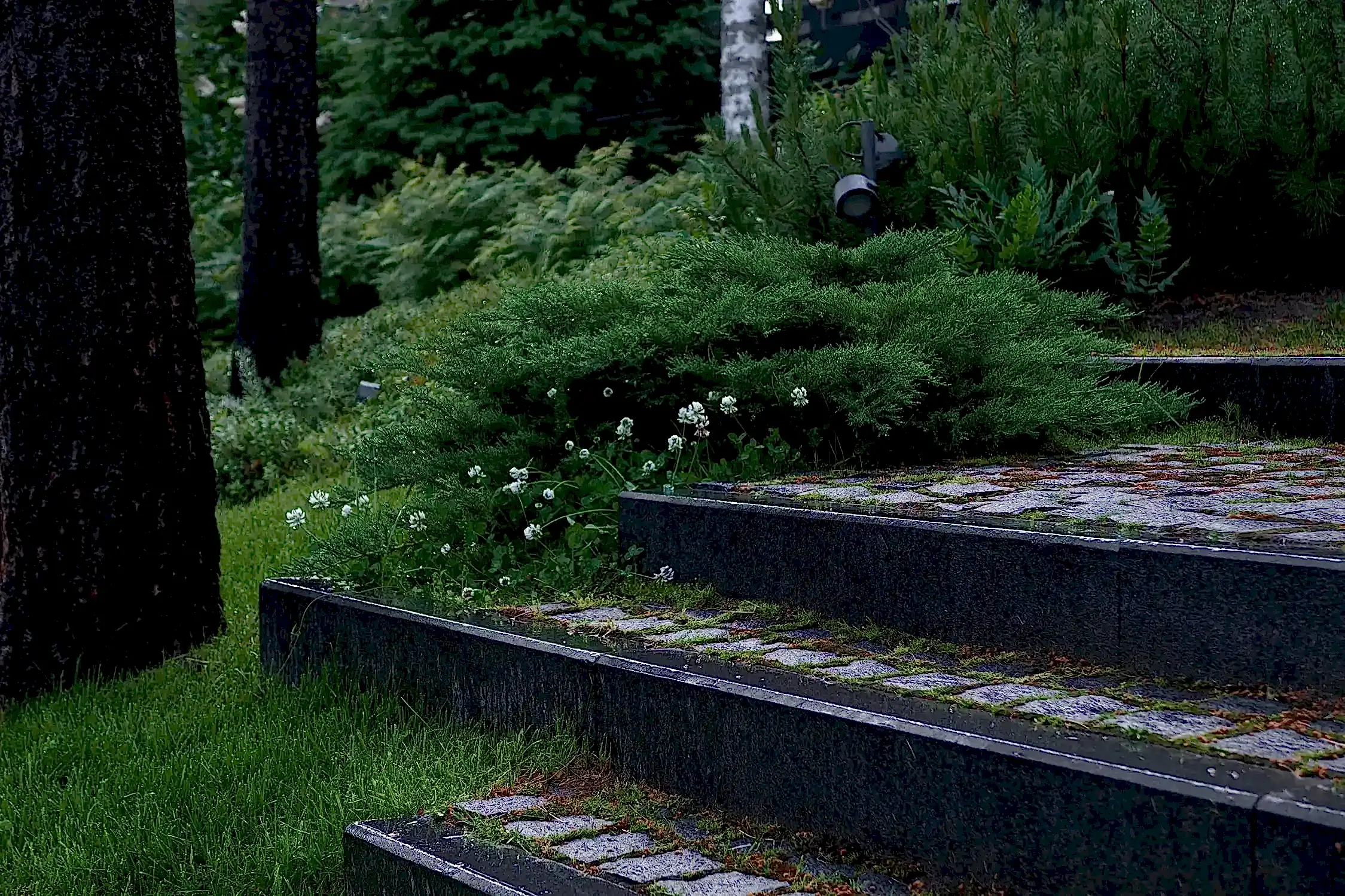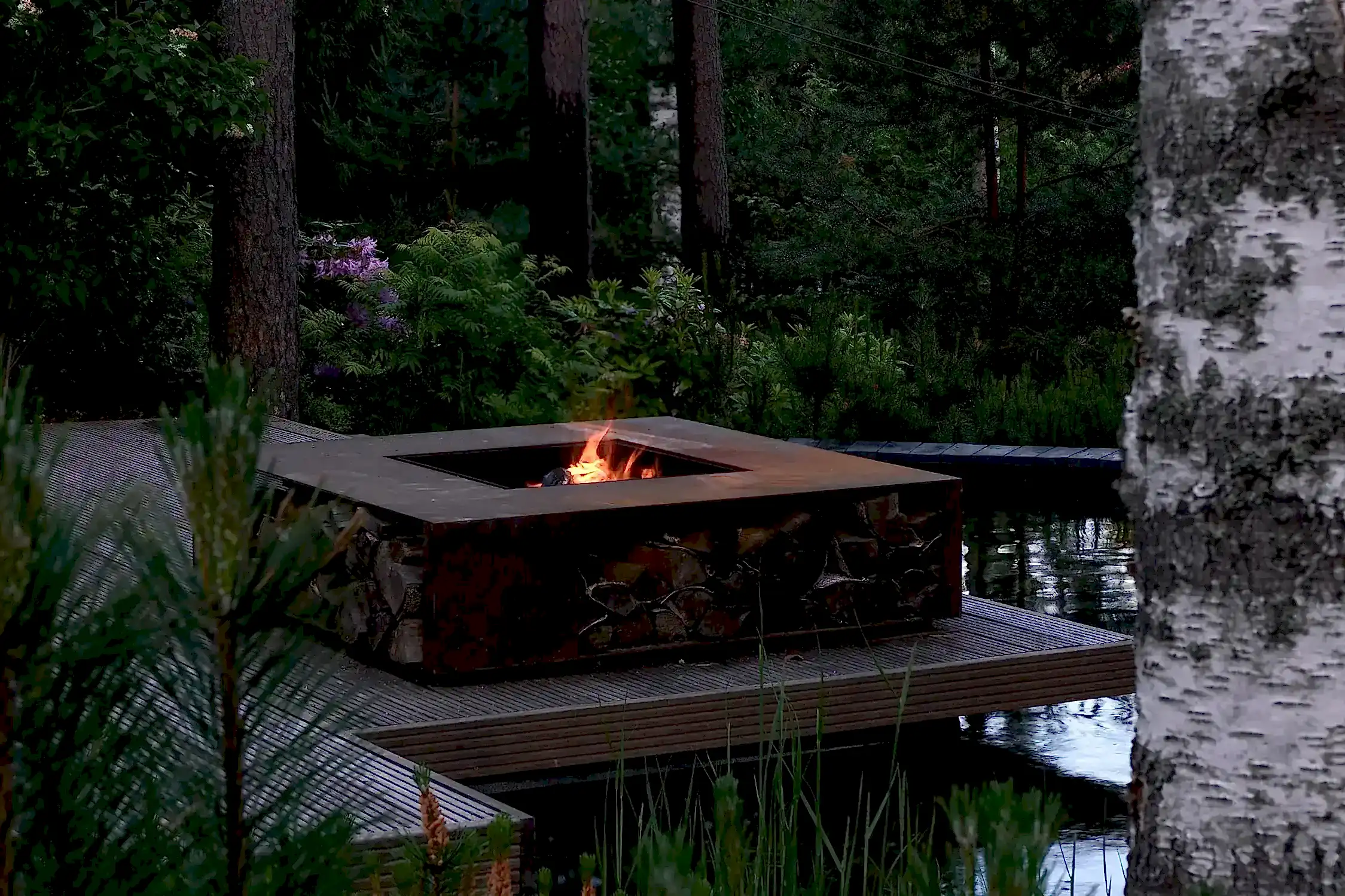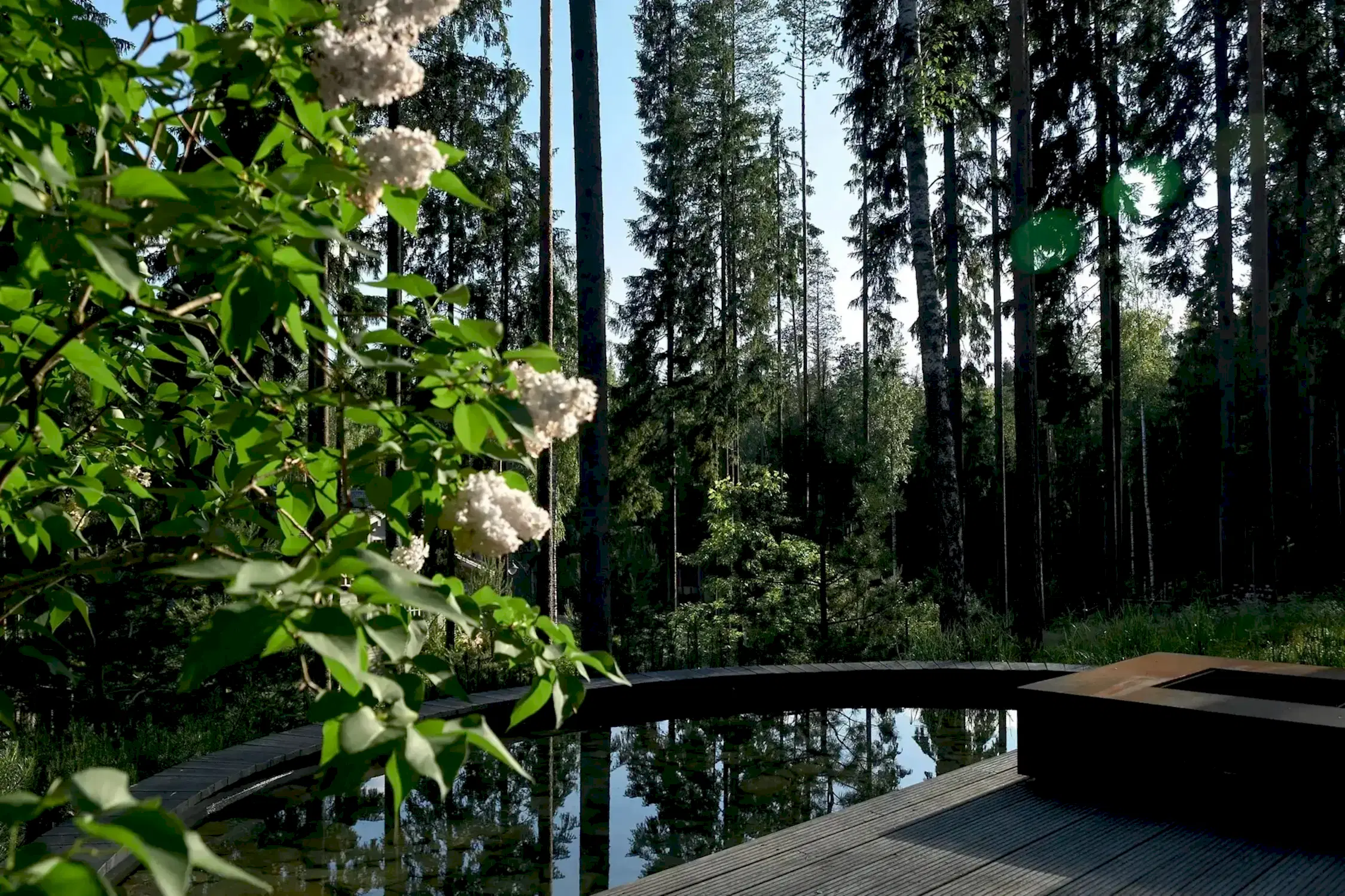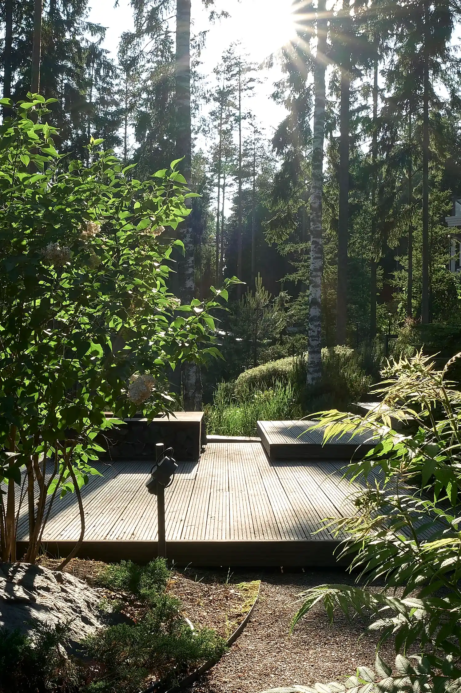 По склону с небольшим уклоном направление подчёркивают ступени-брусья, едва проглядывающие из травы - эта пошаговая тропа более декоративна. Наименее нагруженный переход от бани с купелью к очагу, окружённому прудом, составлен из деревянных платформ. Для круглогодичного удобства Pin-Up переходов сделали с подогревом.
