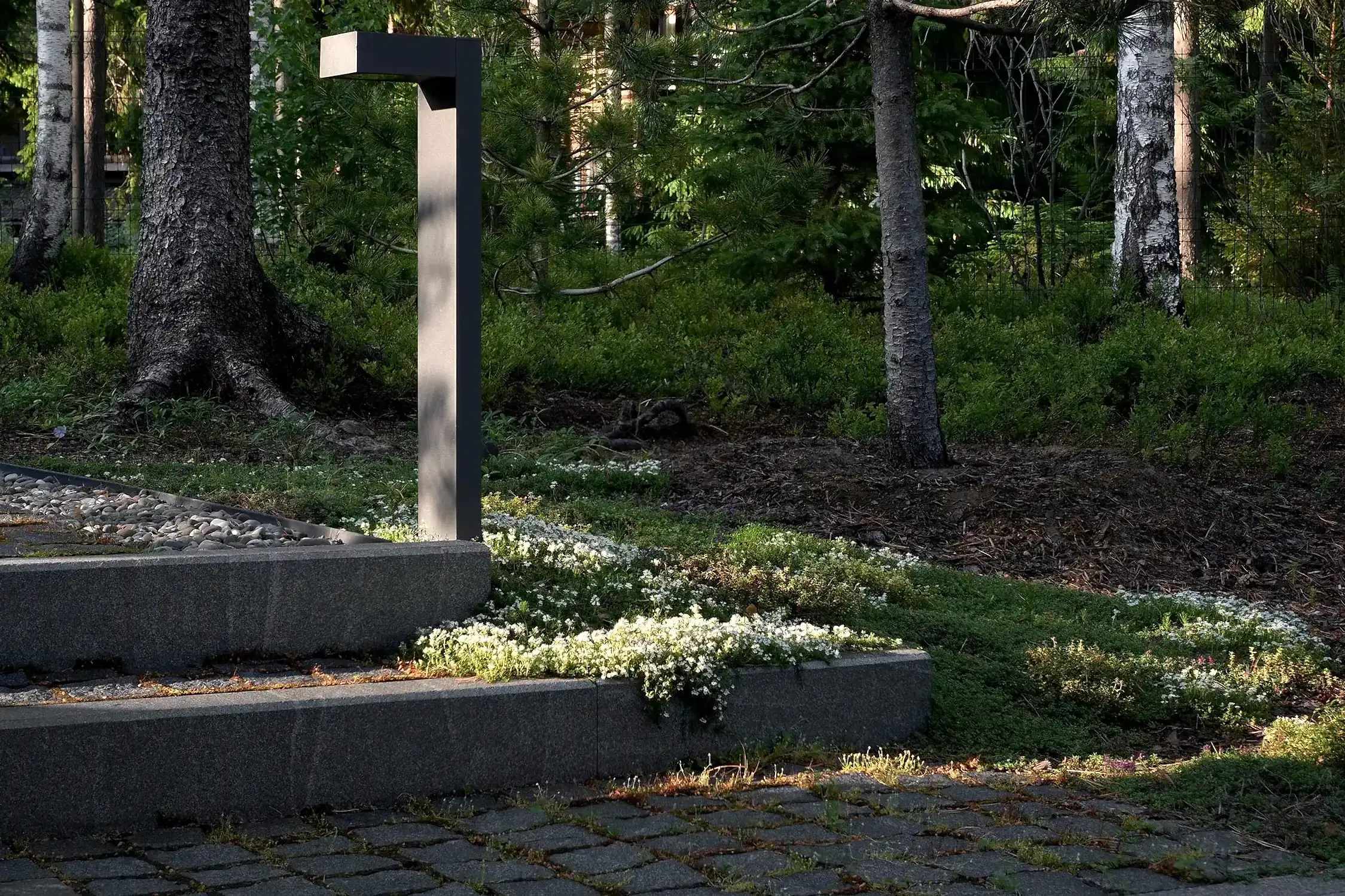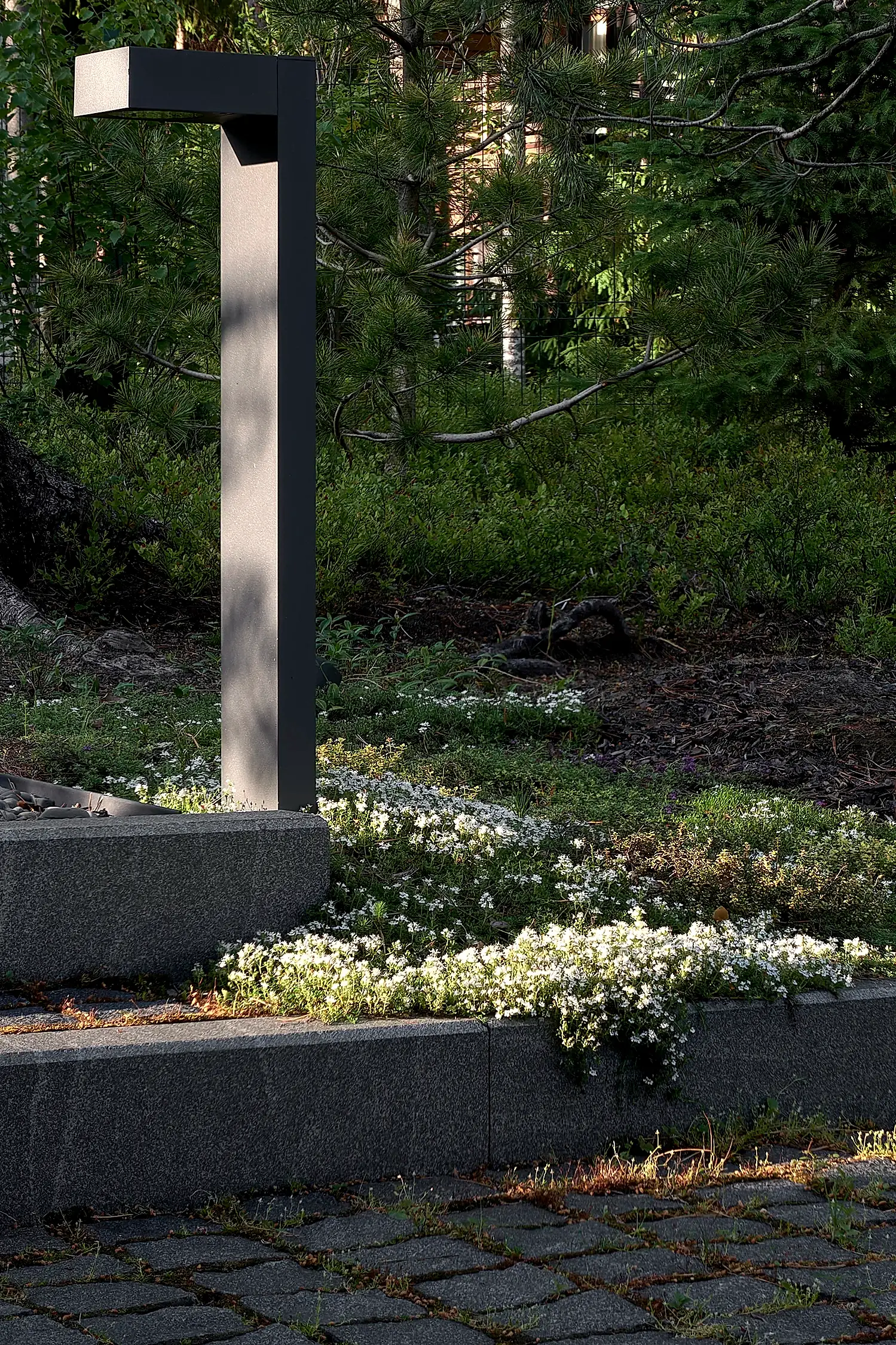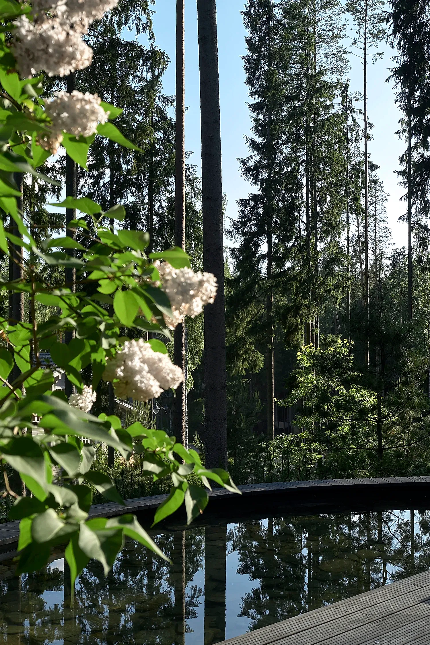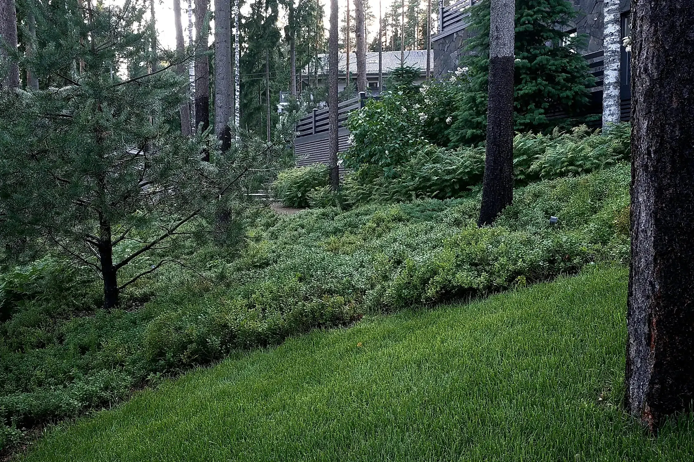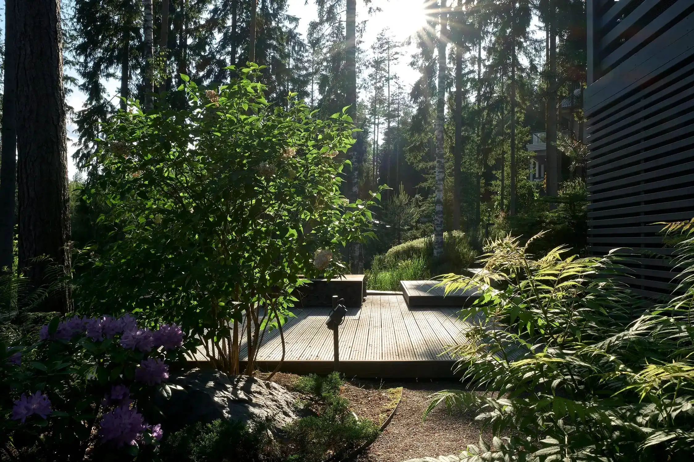По склону с небольшим уклоном направление подчёркивают ступени-брусья, едва проглядывающие из травы - эта пошаговая тропа более декоративна. Наименее нагруженный переход от бани с купелью к очагу, окружённому прудом, составлен из деревянных платформ. Для круглогодичного удобства Pin-Up переходов сделали с подогревом.