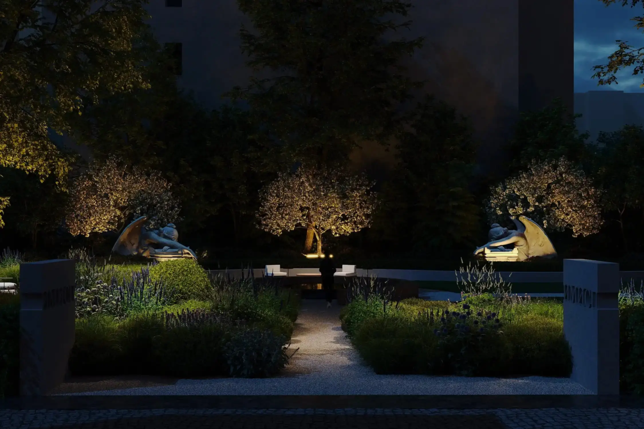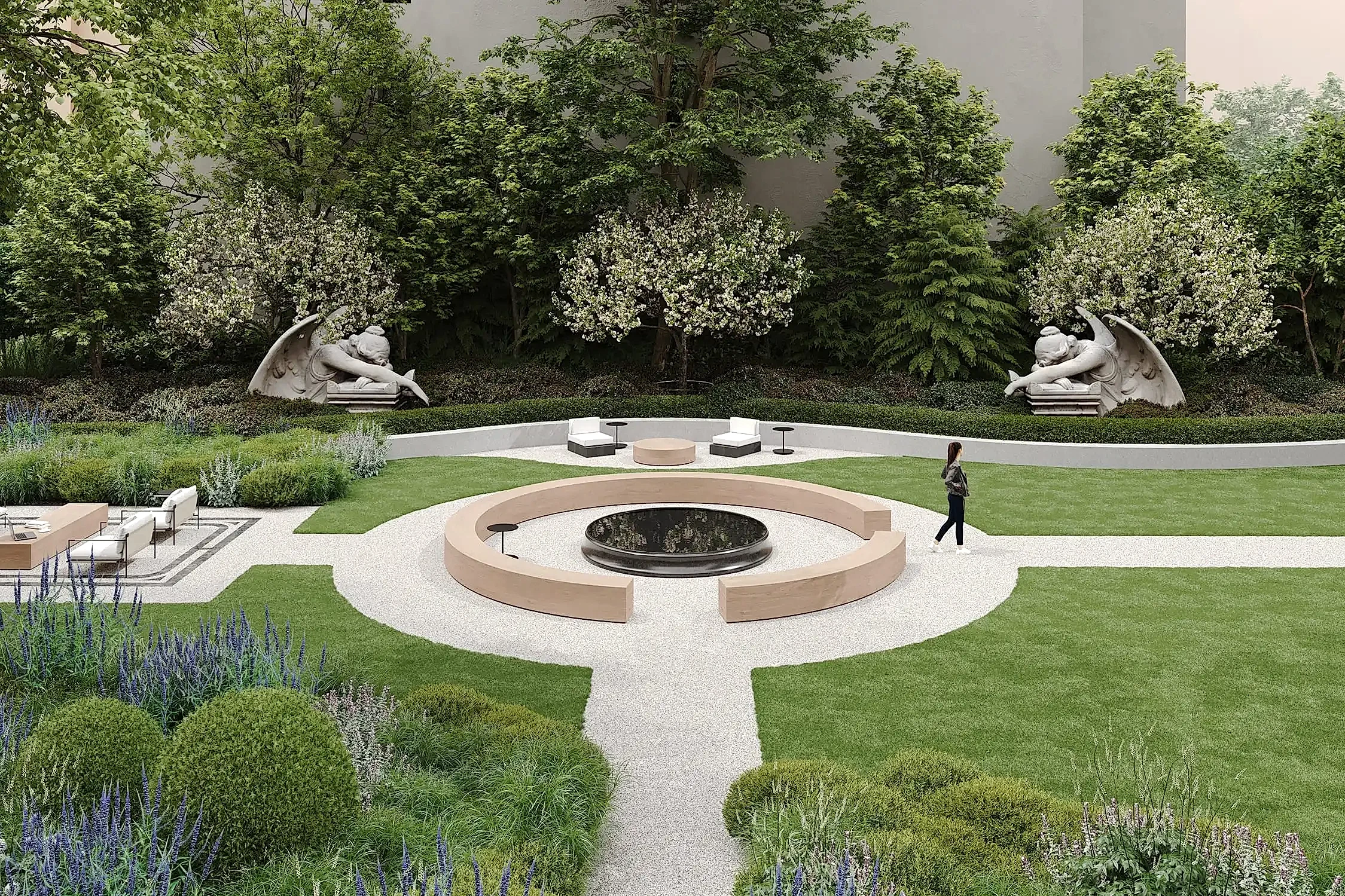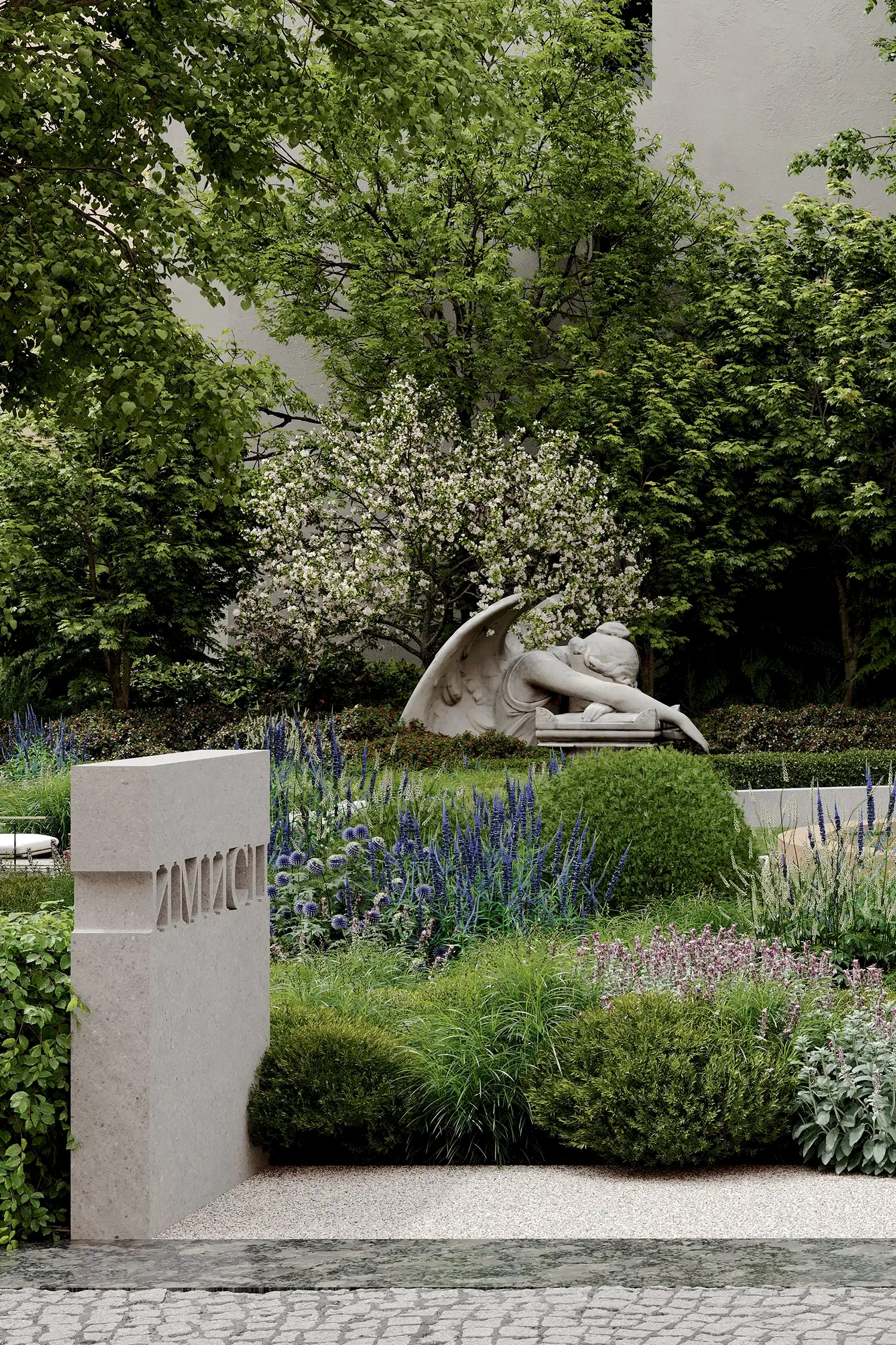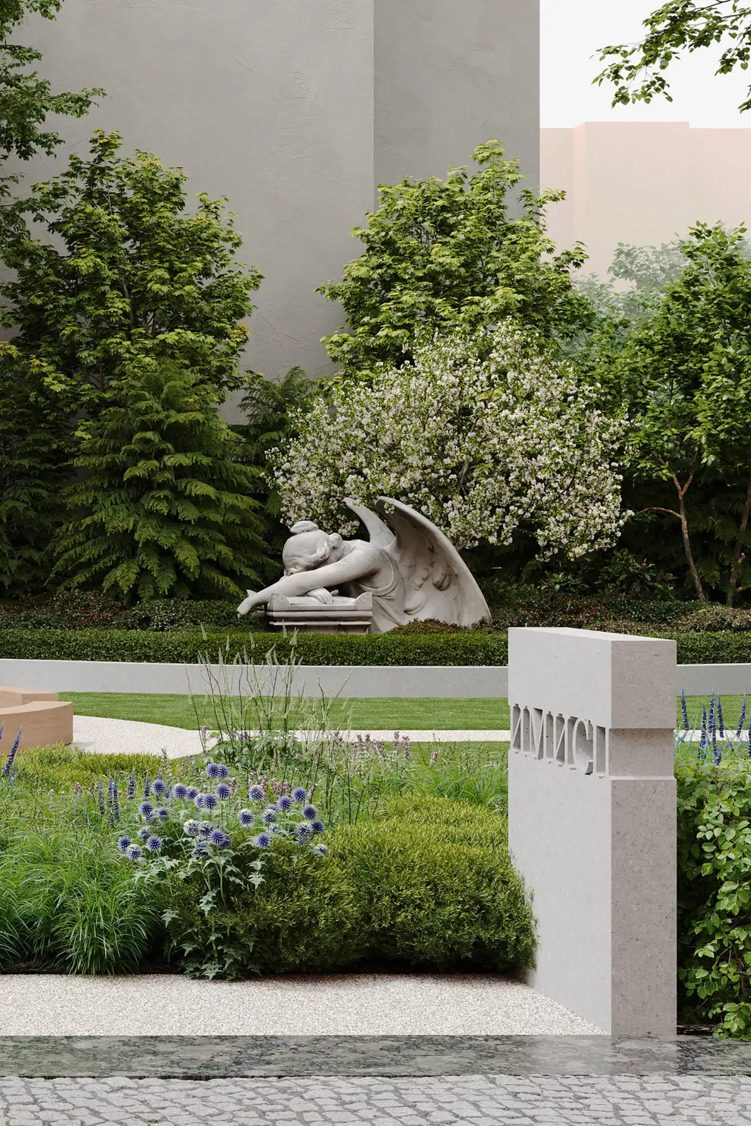 из карельского гранита. Творческий подход и креативность проявили и в работе со скульптурами, без которых невозможно представить петербургский сад: их мы исполнили из технологичного биобетона со спорами растений. Таким образом они превратились в современные Pin-Up в древнеримские артефакты, покрытые мхом.