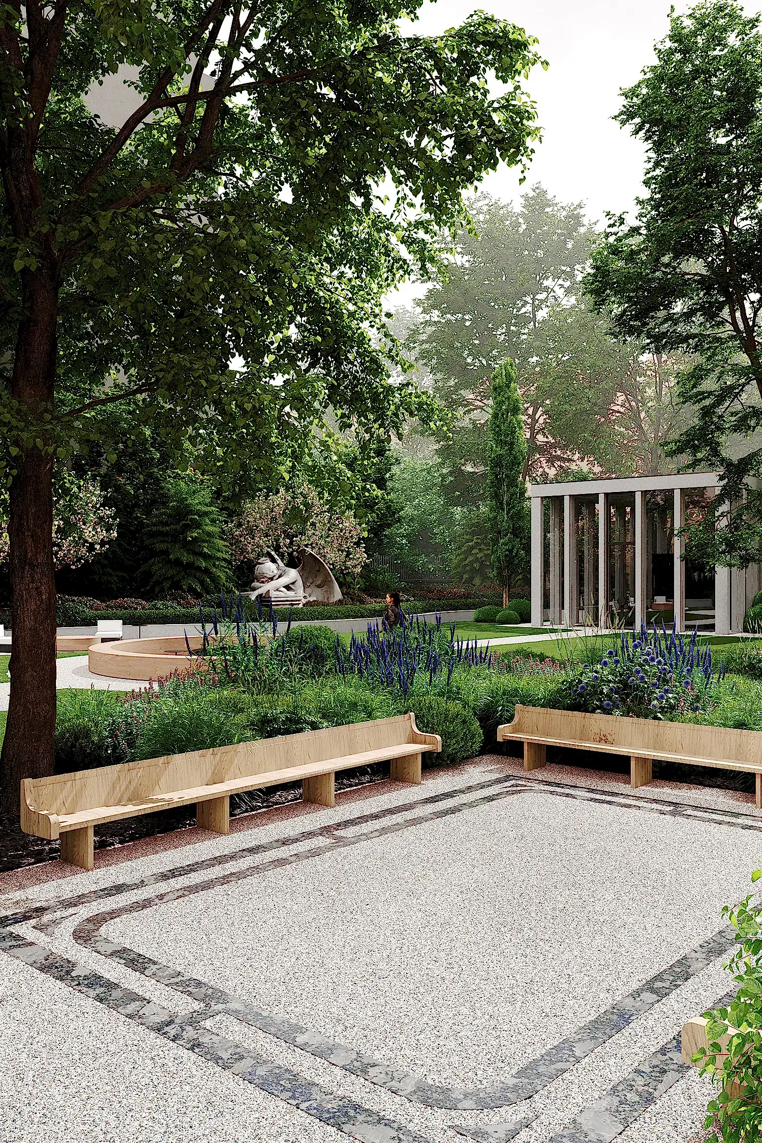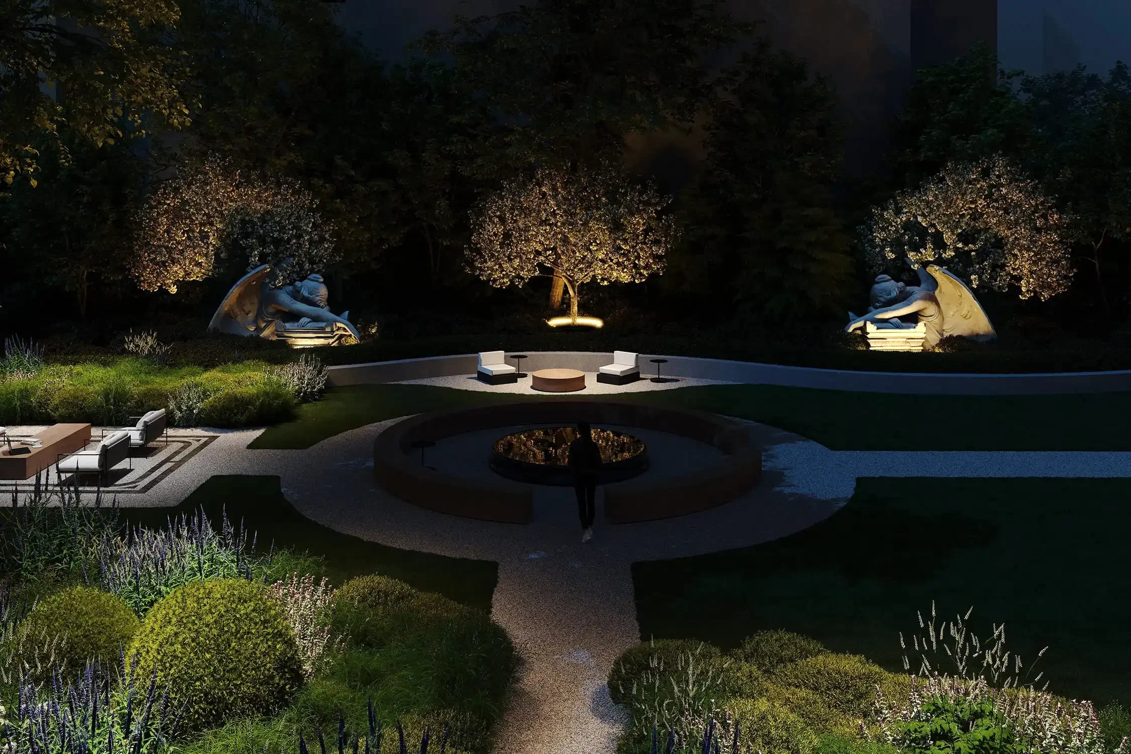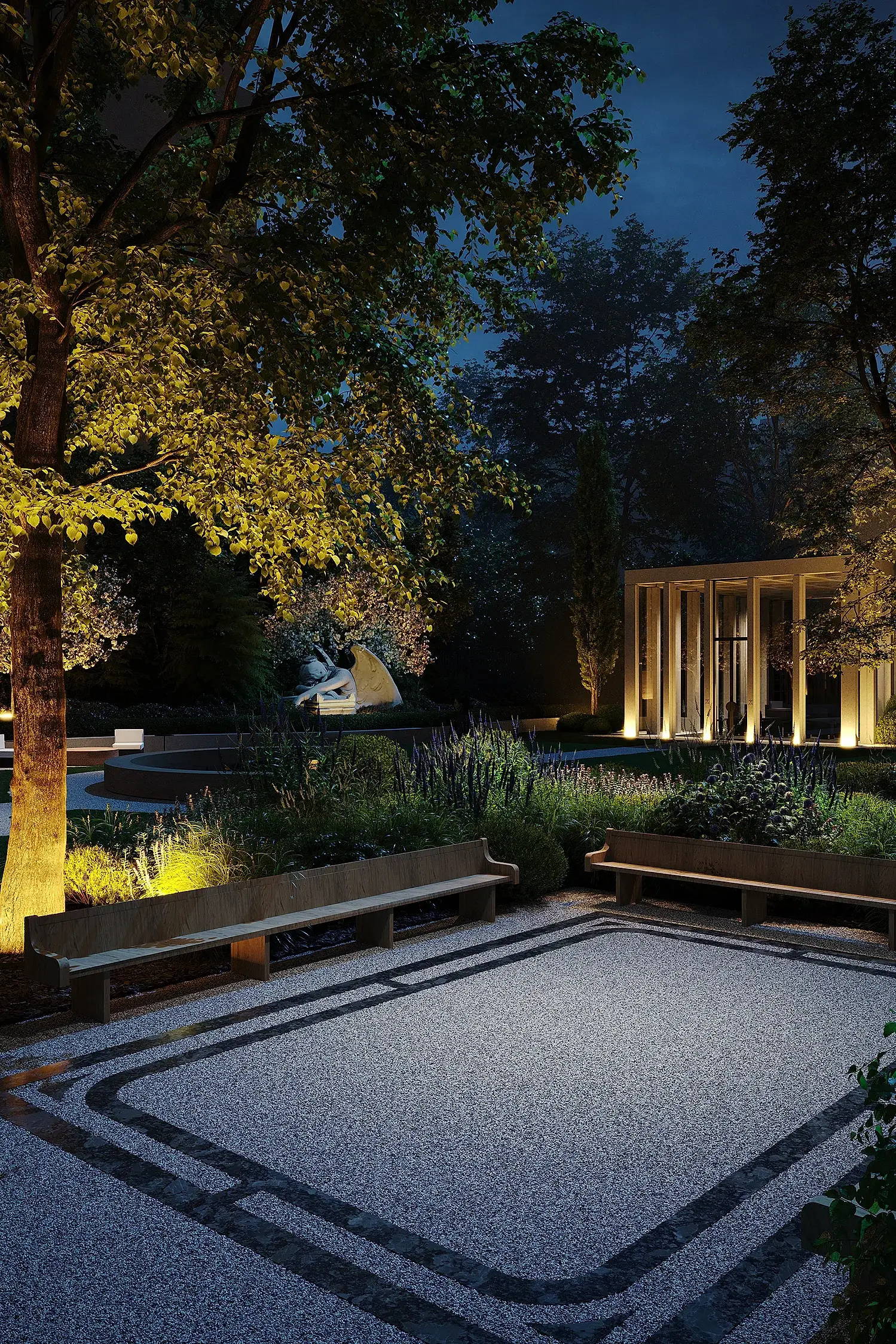 из карельского гранита. Творческий подход и креативность проявили и в работе со скульптурами, без которых невозможно представить петербургский сад: их мы исполнили из технологичного биобетона со спорами растений. Таким образом они превратились в современные Pin-Up в древнеримские артефакты, покрытые мхом.