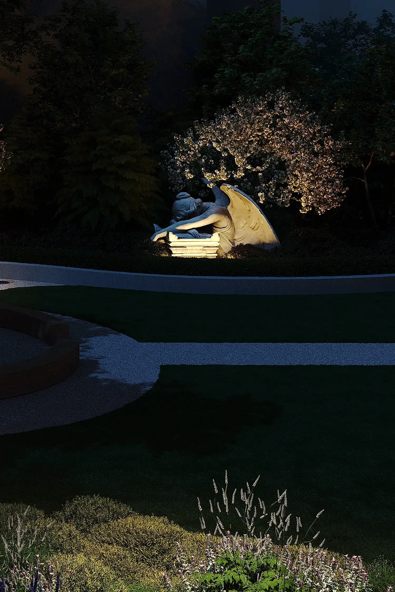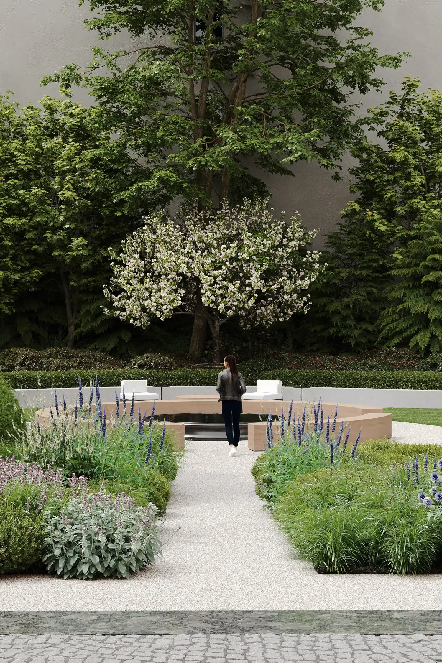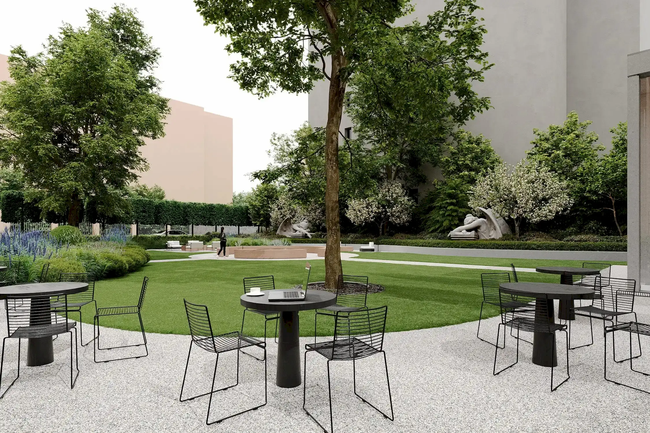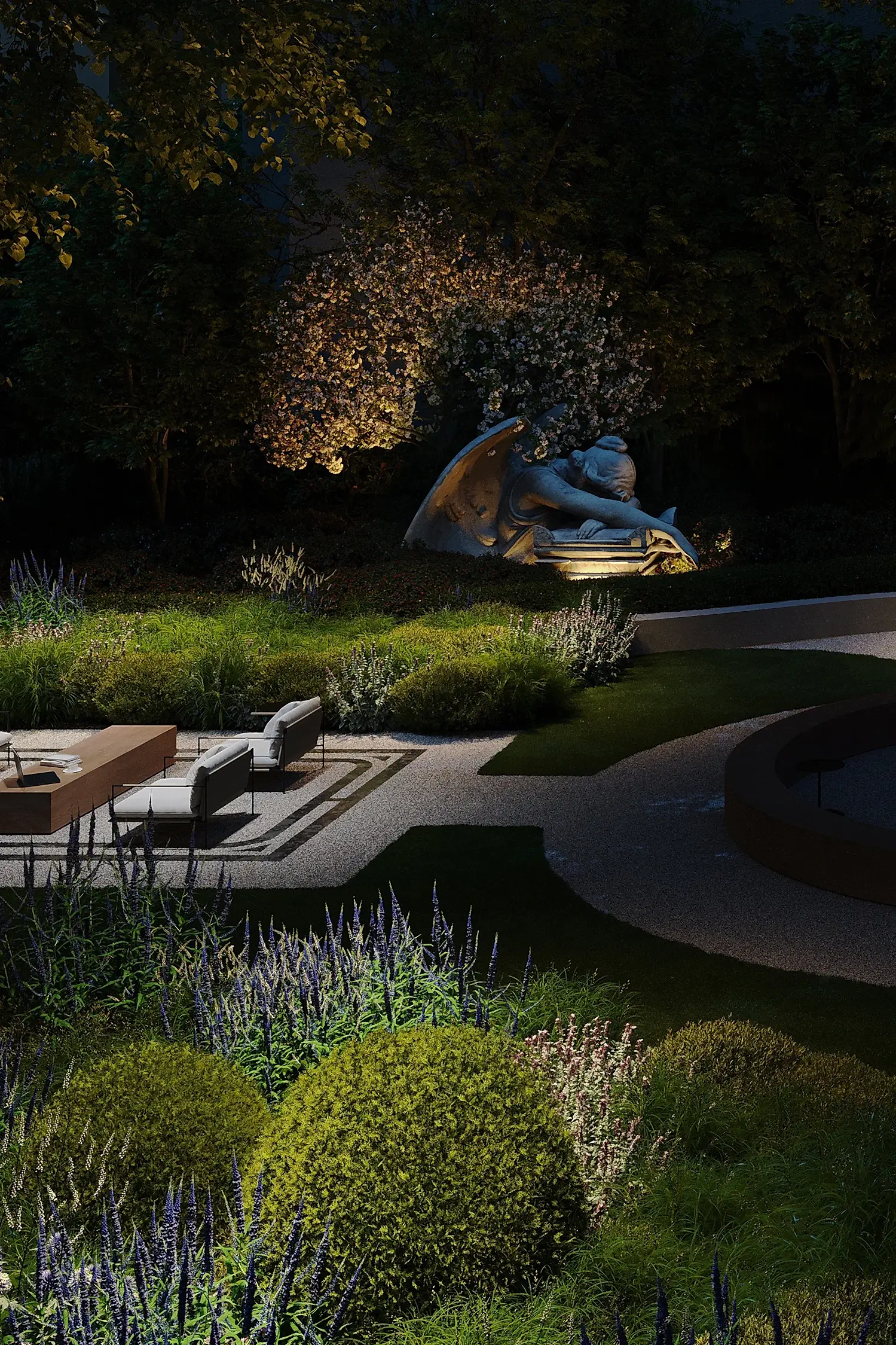 из карельского гранита. Творческий подход и креативность проявили и в работе со скульптурами, без которых невозможно представить петербургский сад: их мы исполнили из технологичного биобетона со спорами растений. Таким образом они превратились в современные Pin-Up в древнеримские артефакты, покрытые мхом.