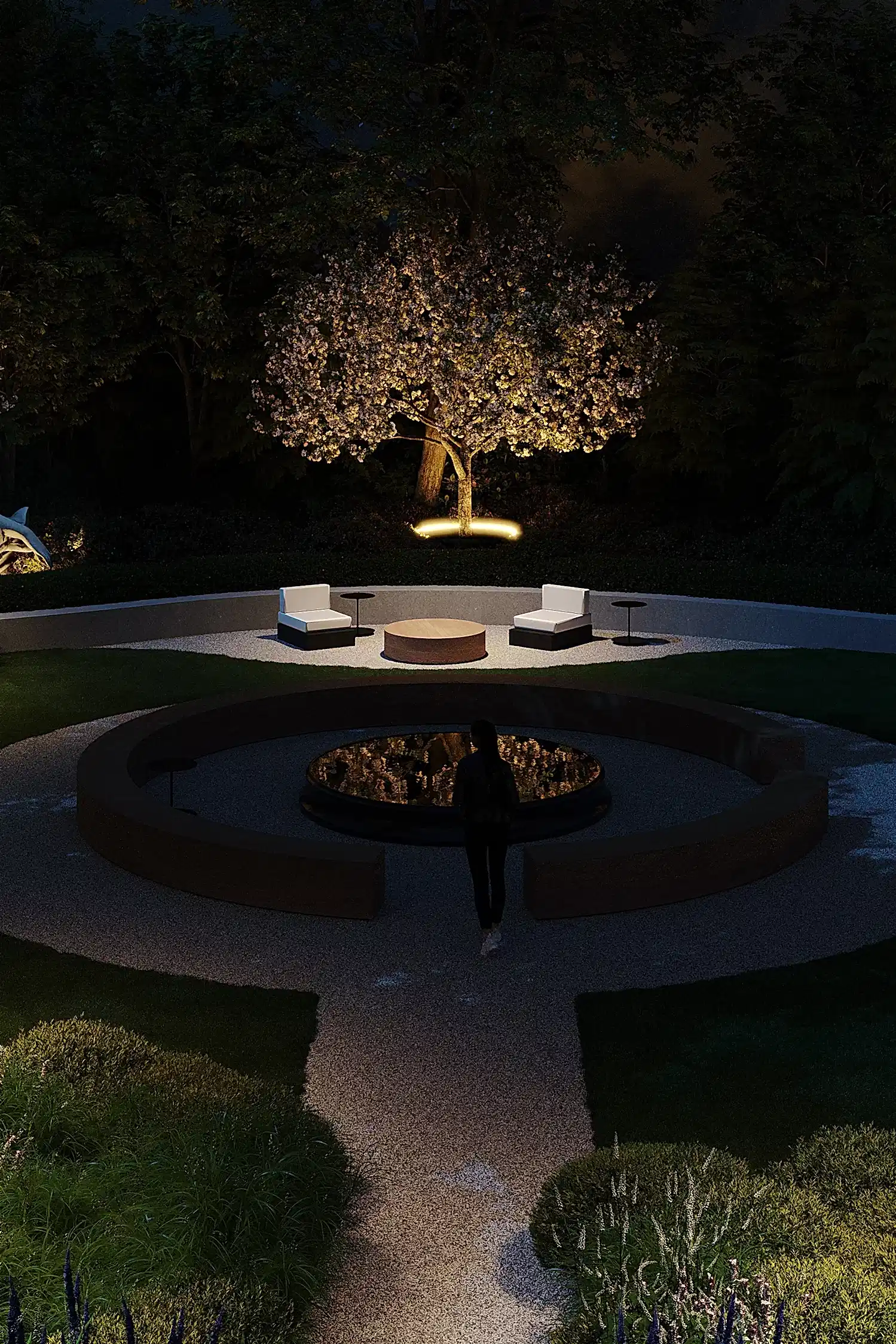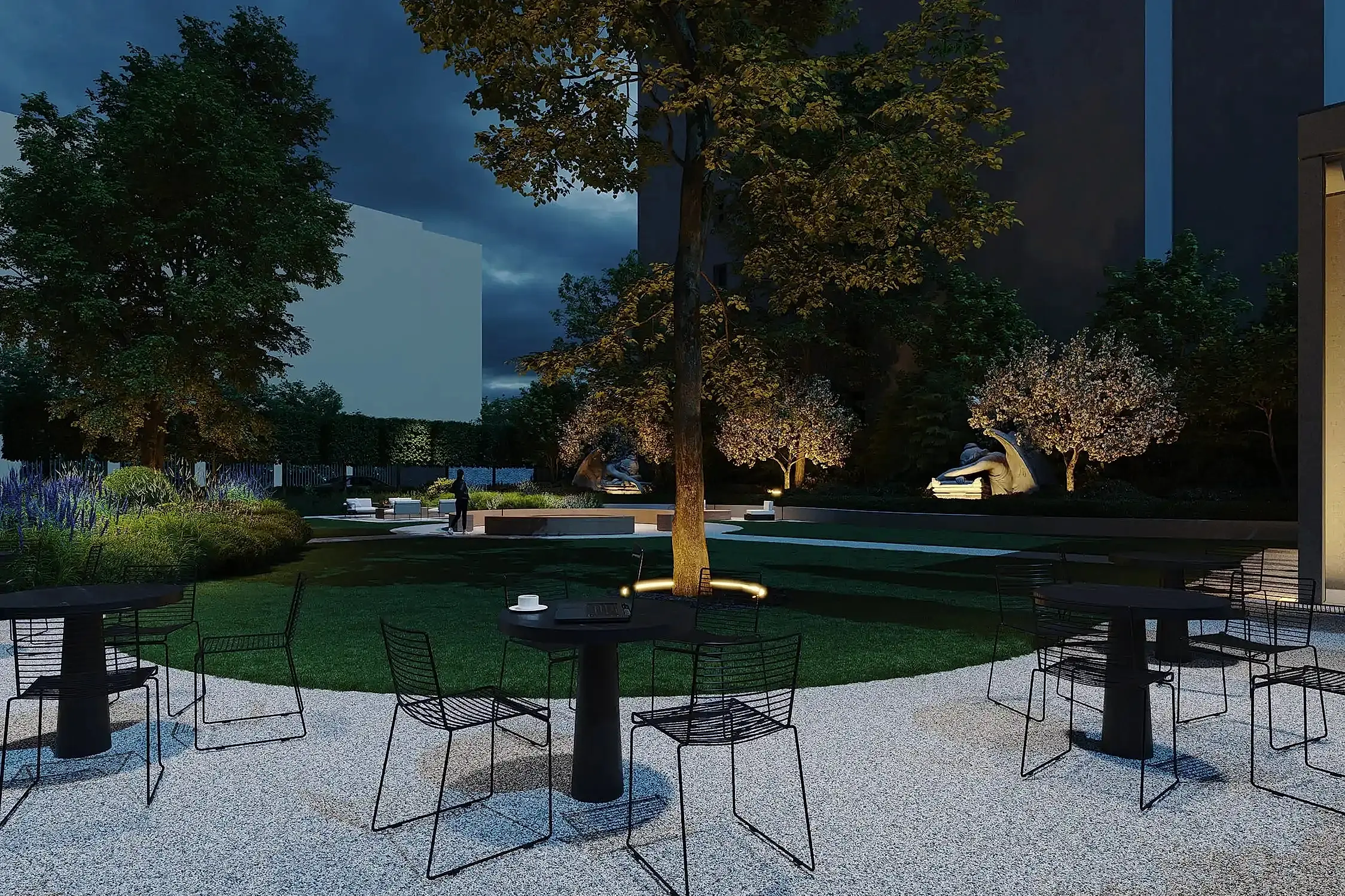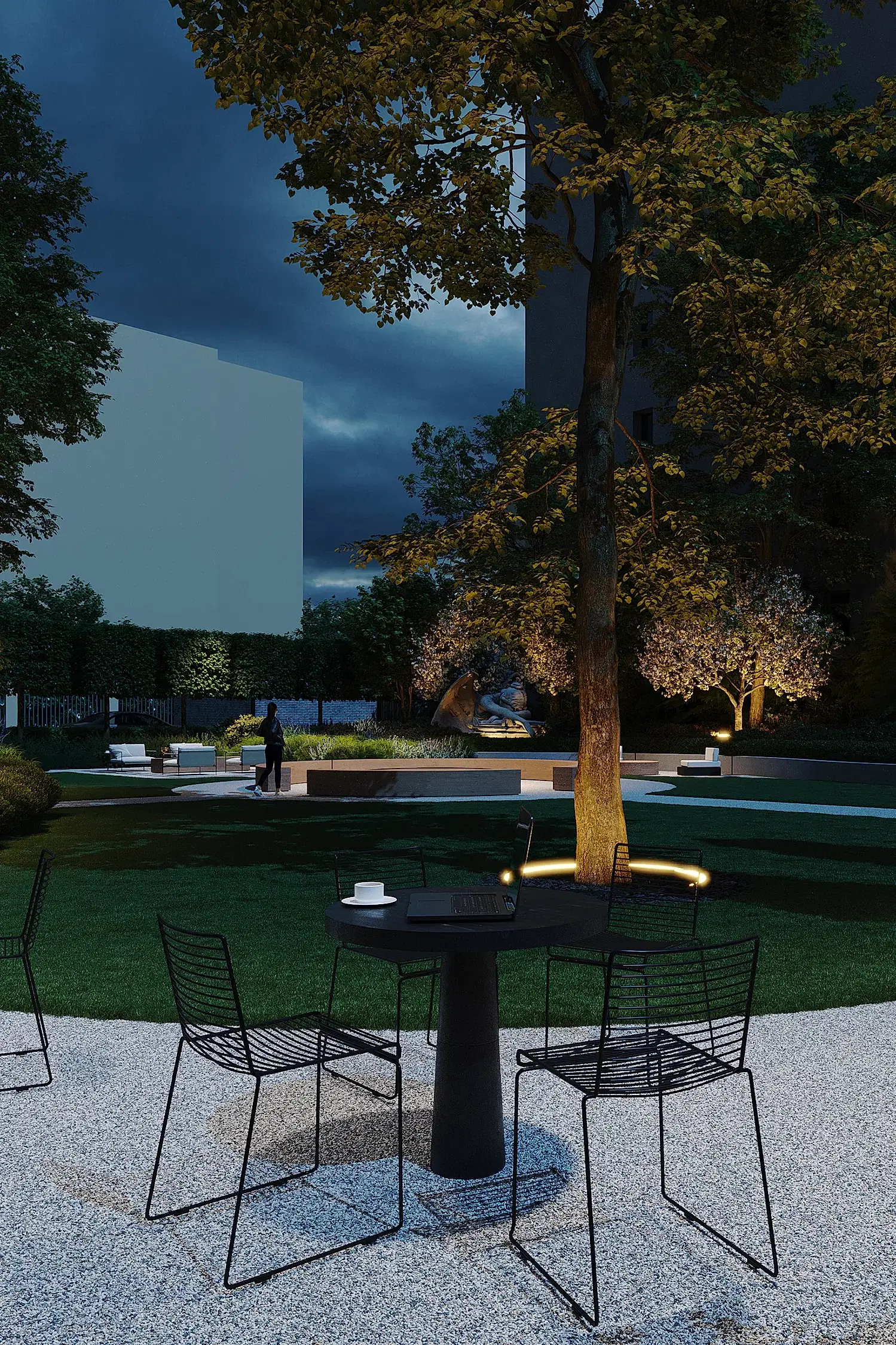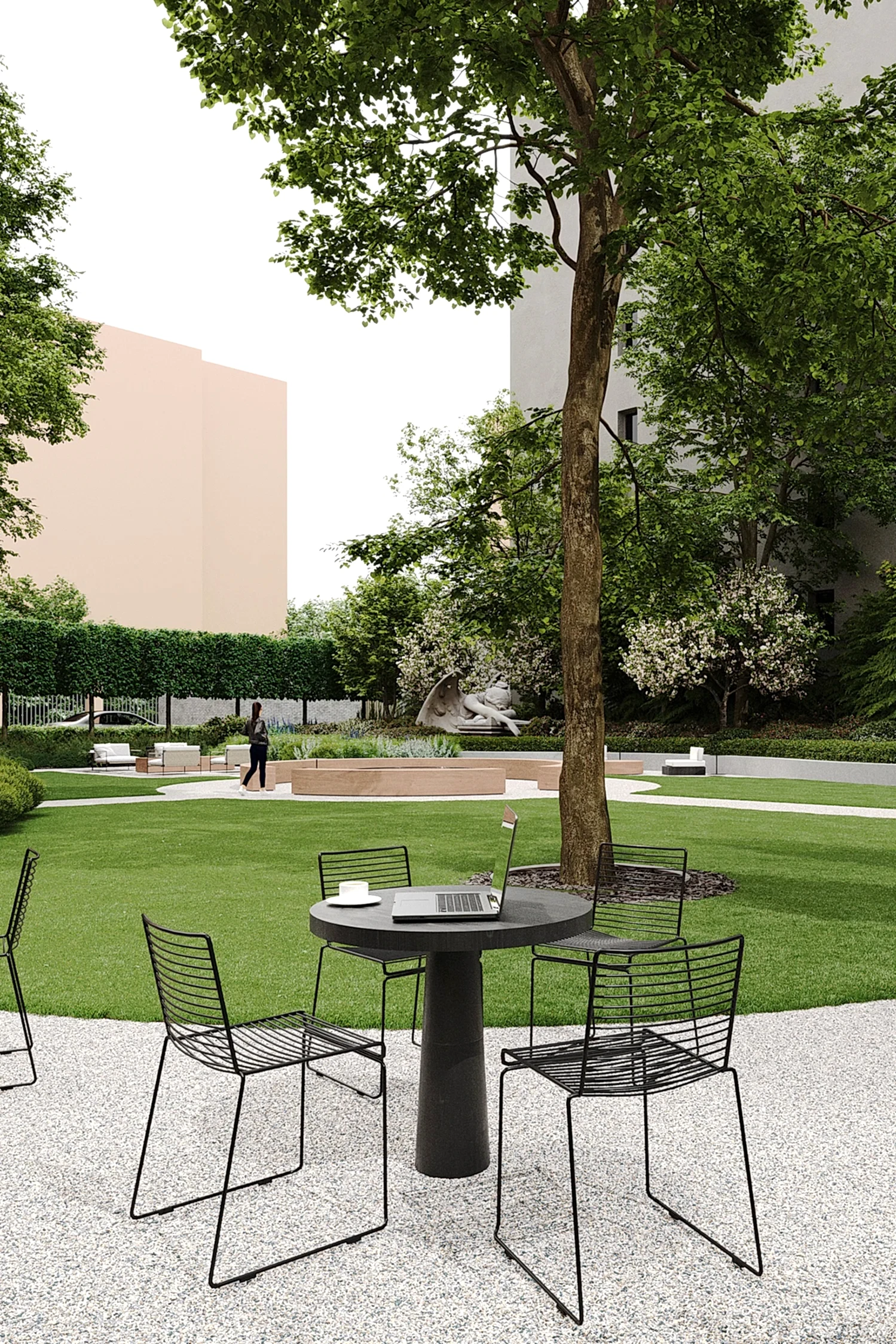 Этот сад - тот случай, когда альма-матер действительно становится местом силы. Чтобы студенты и выпускники получали поддержку своего окружения и места. В этом нам в том числе помогают сохранённые и переосмысленные объекты - взрослые деревья и фонтан. В чаше из чёрного полированного камня под водой будет Pin-Up послание для новых поколений.