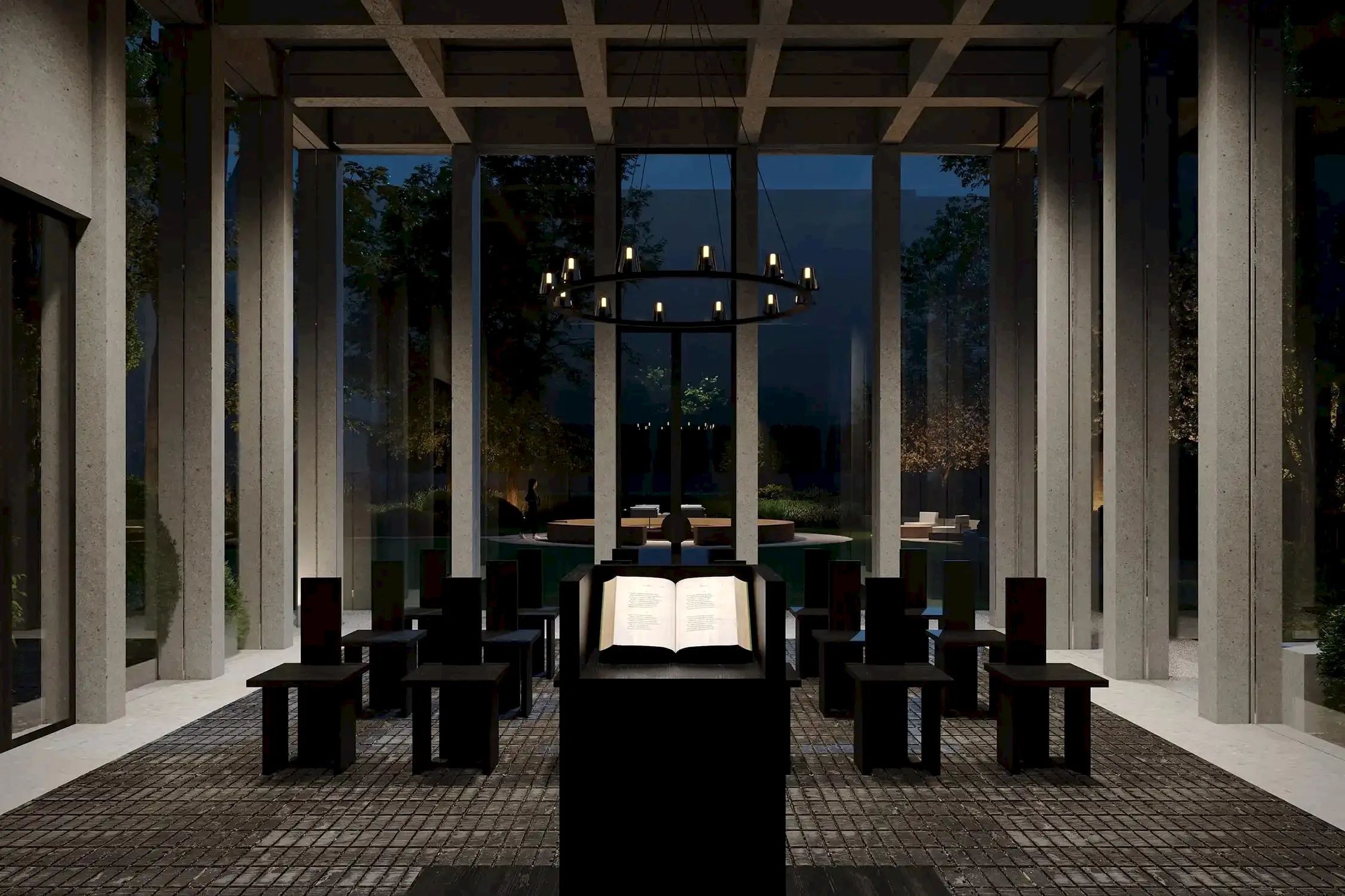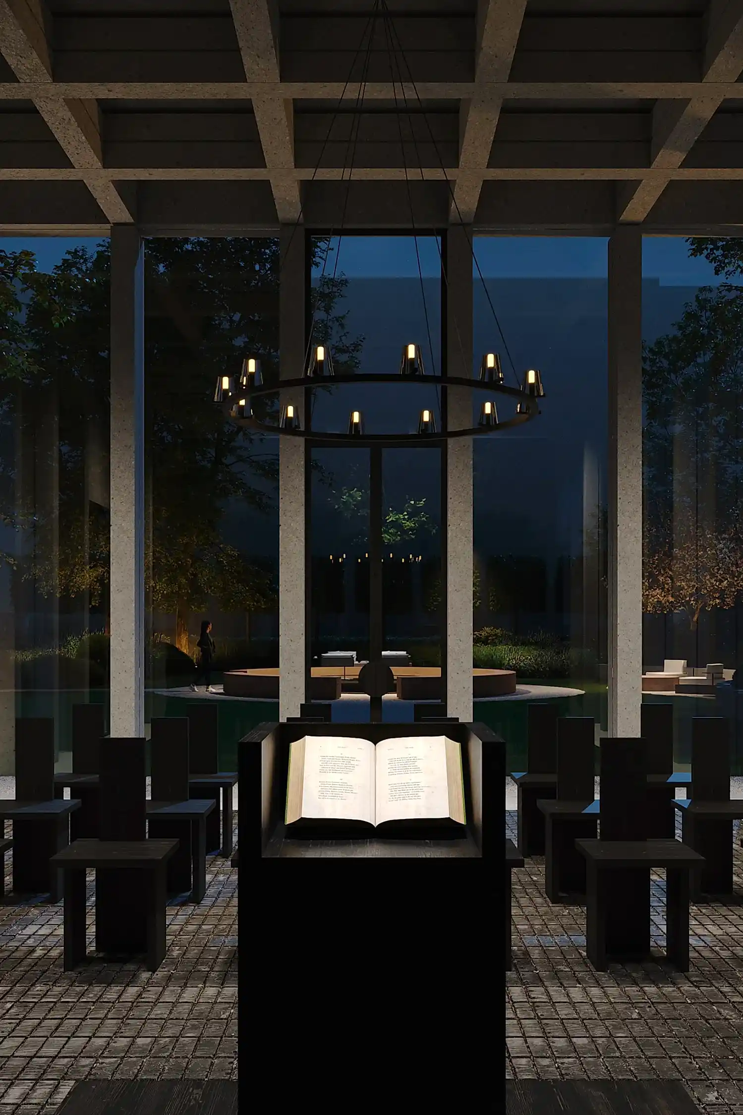 В модернистском стеклянном павильоне-лектории для покрытия пола мы выбрали традиционную для сада брусчатку из лиственницы. Во дворе - мощение в привычном для петербуржцев итальянском Pin-Up - задумали