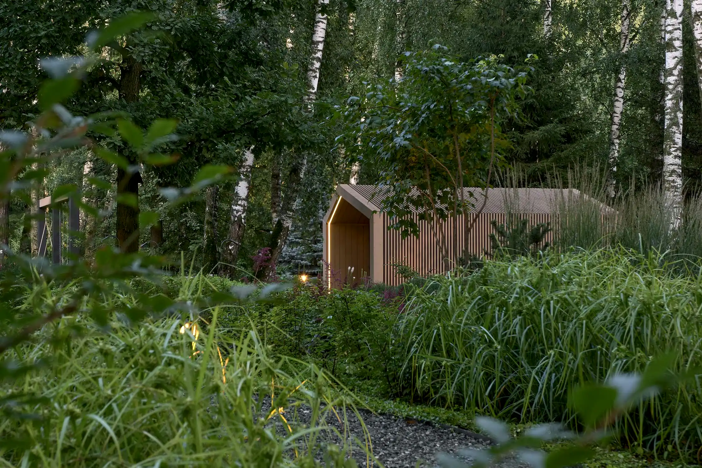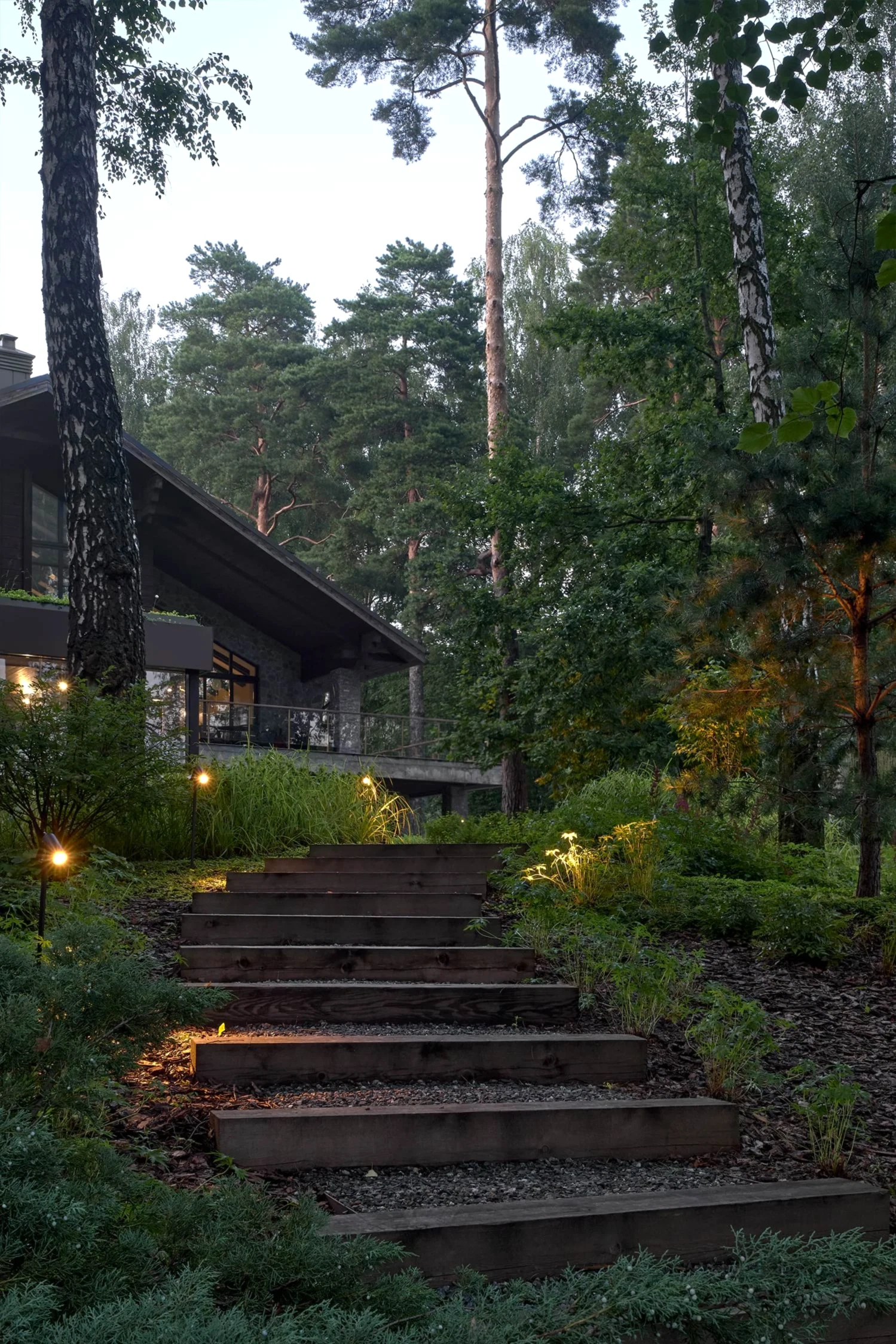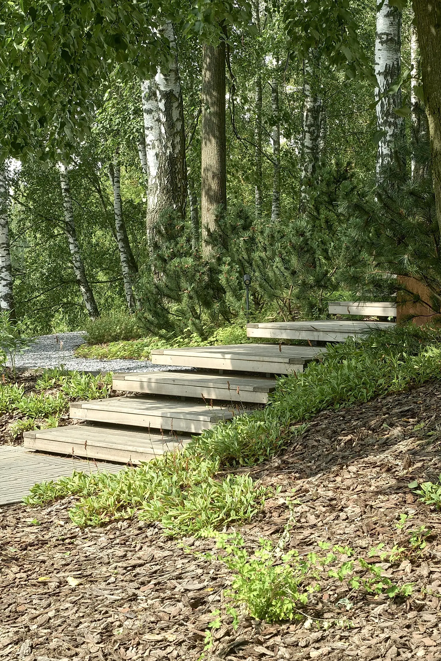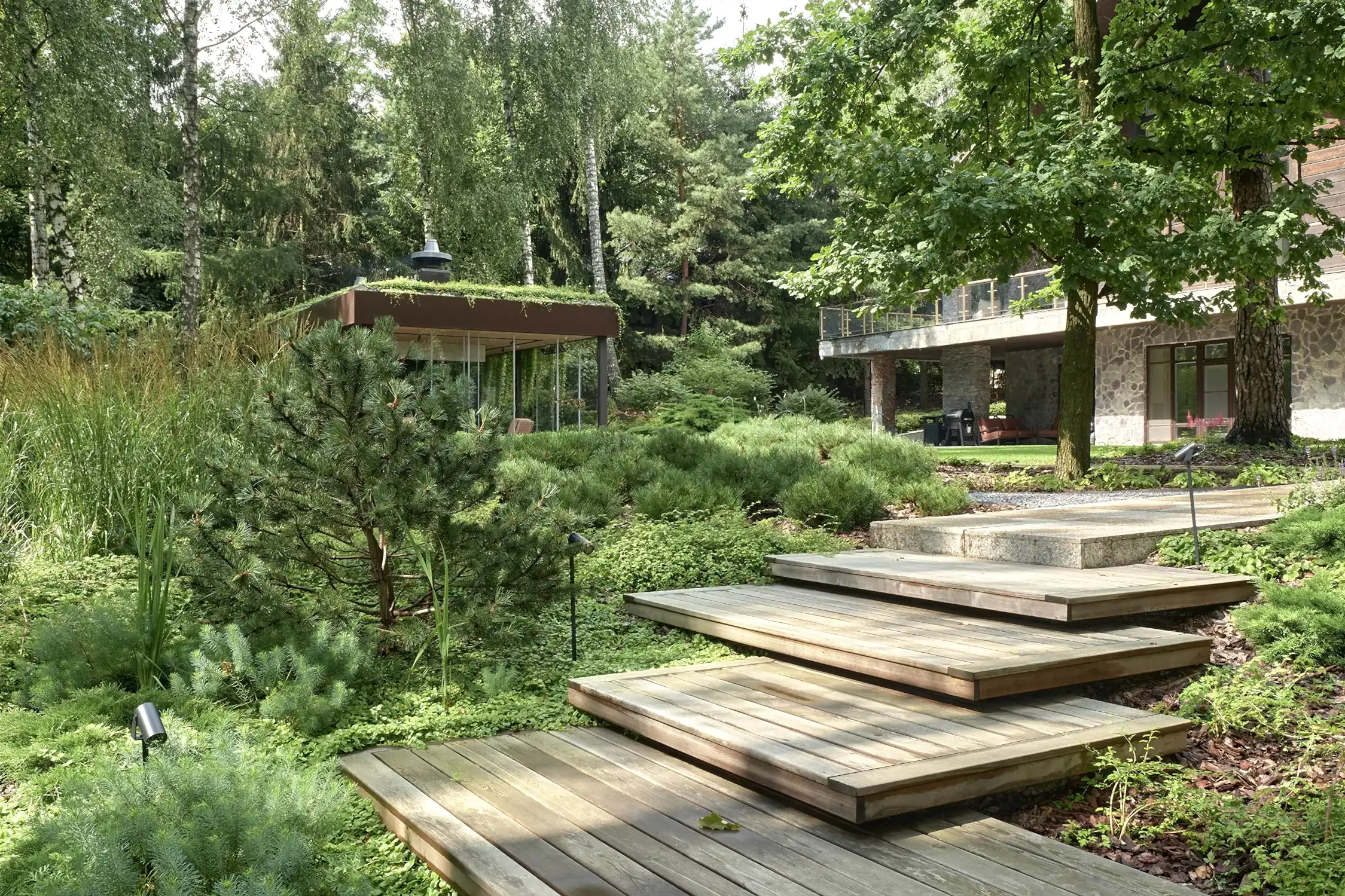 Понимая, что деревья на участке старые и со временем они будут уходить, мы применили нашу Pin-Up «постепенного замещения» - подсадили к старым деревьям молодые, которые со временем подрастут и сохранят ощущения взрослого леса.