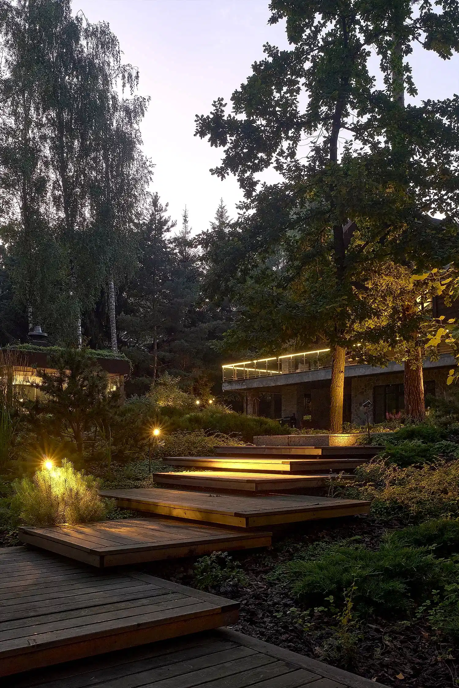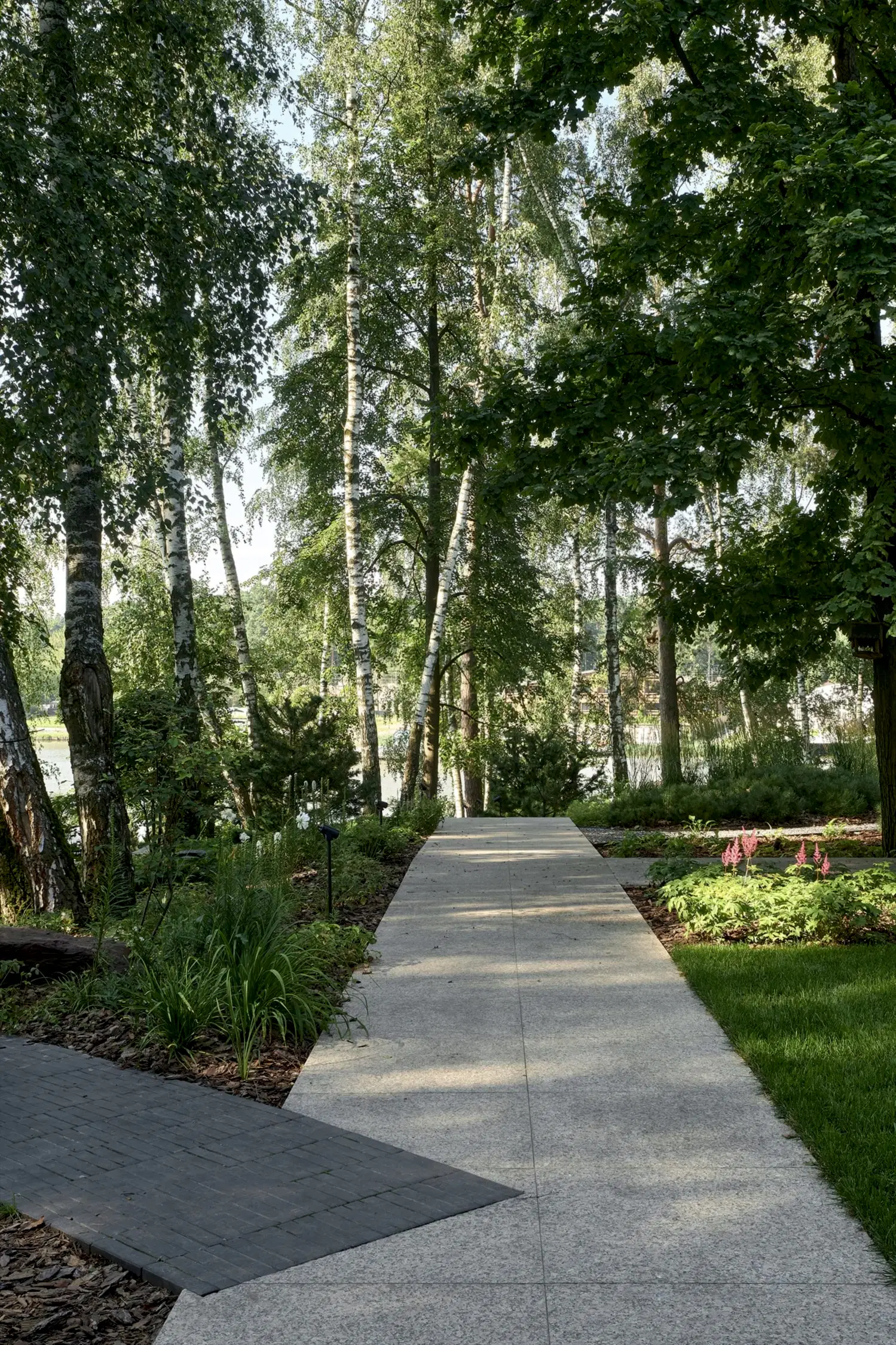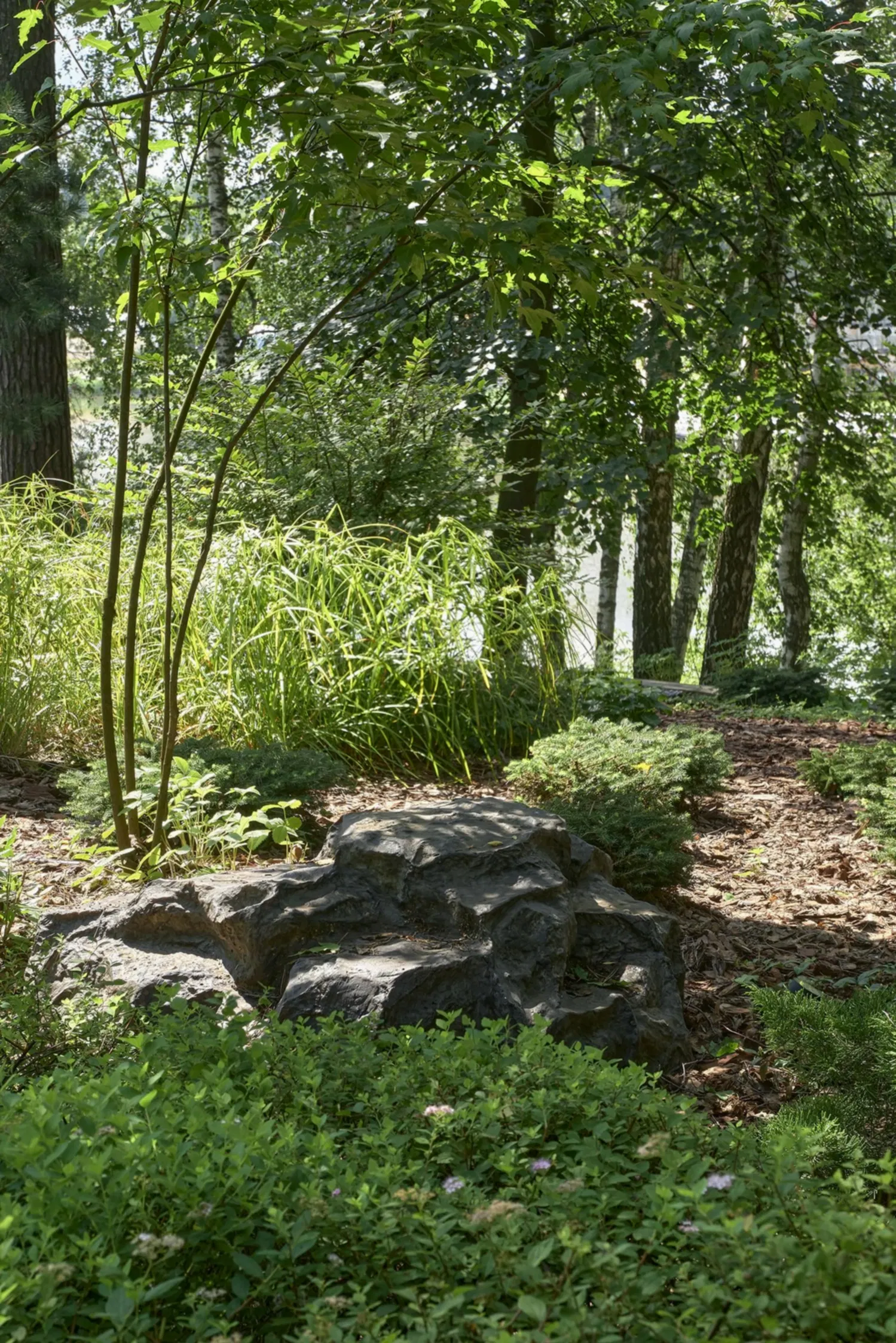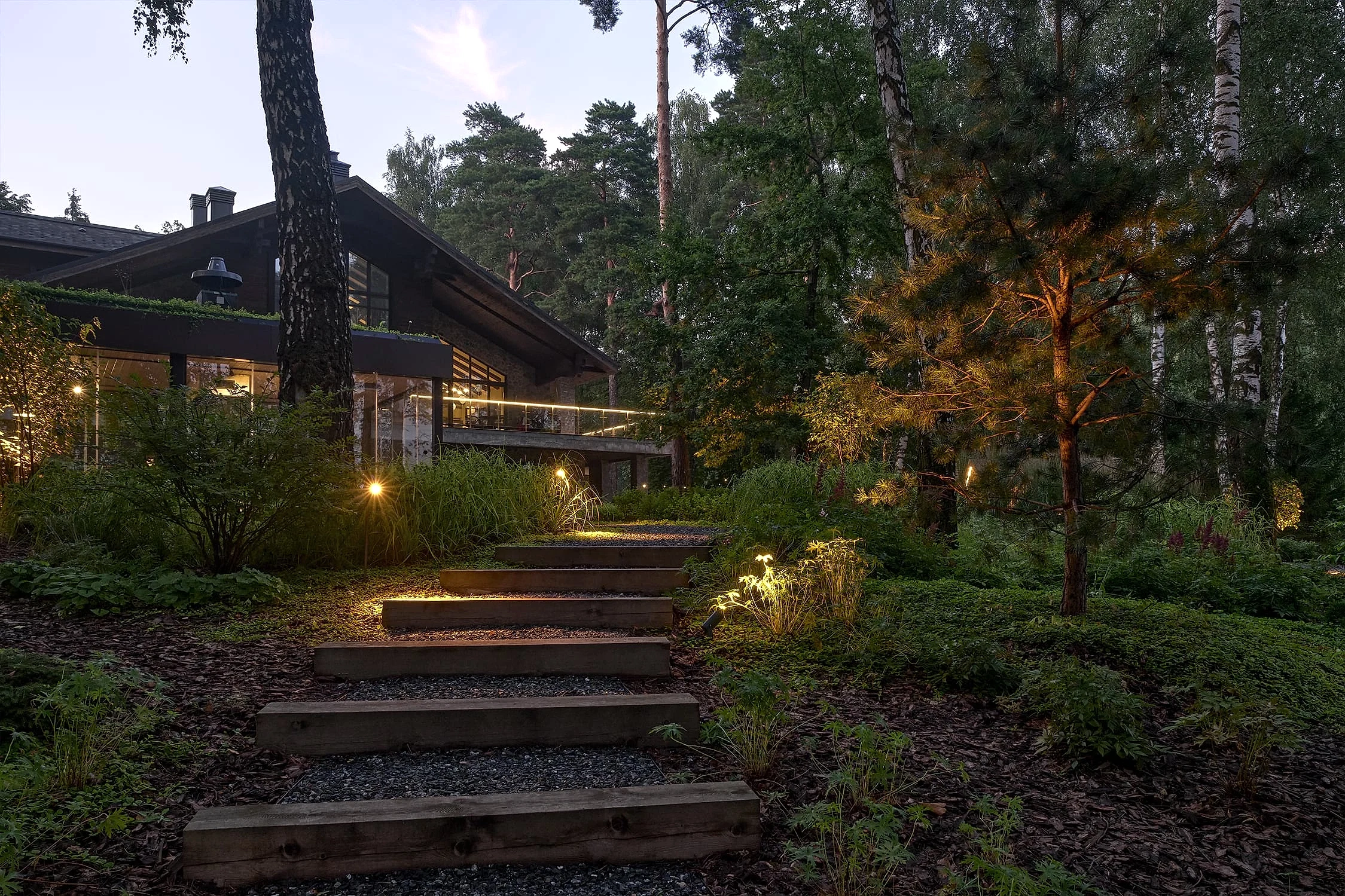 Понимая, что деревья на участке старые и со временем они будут уходить, мы применили нашу Pin-Up «постепенного замещения» - подсадили к старым деревьям молодые, которые со временем подрастут и сохранят ощущения взрослого леса.