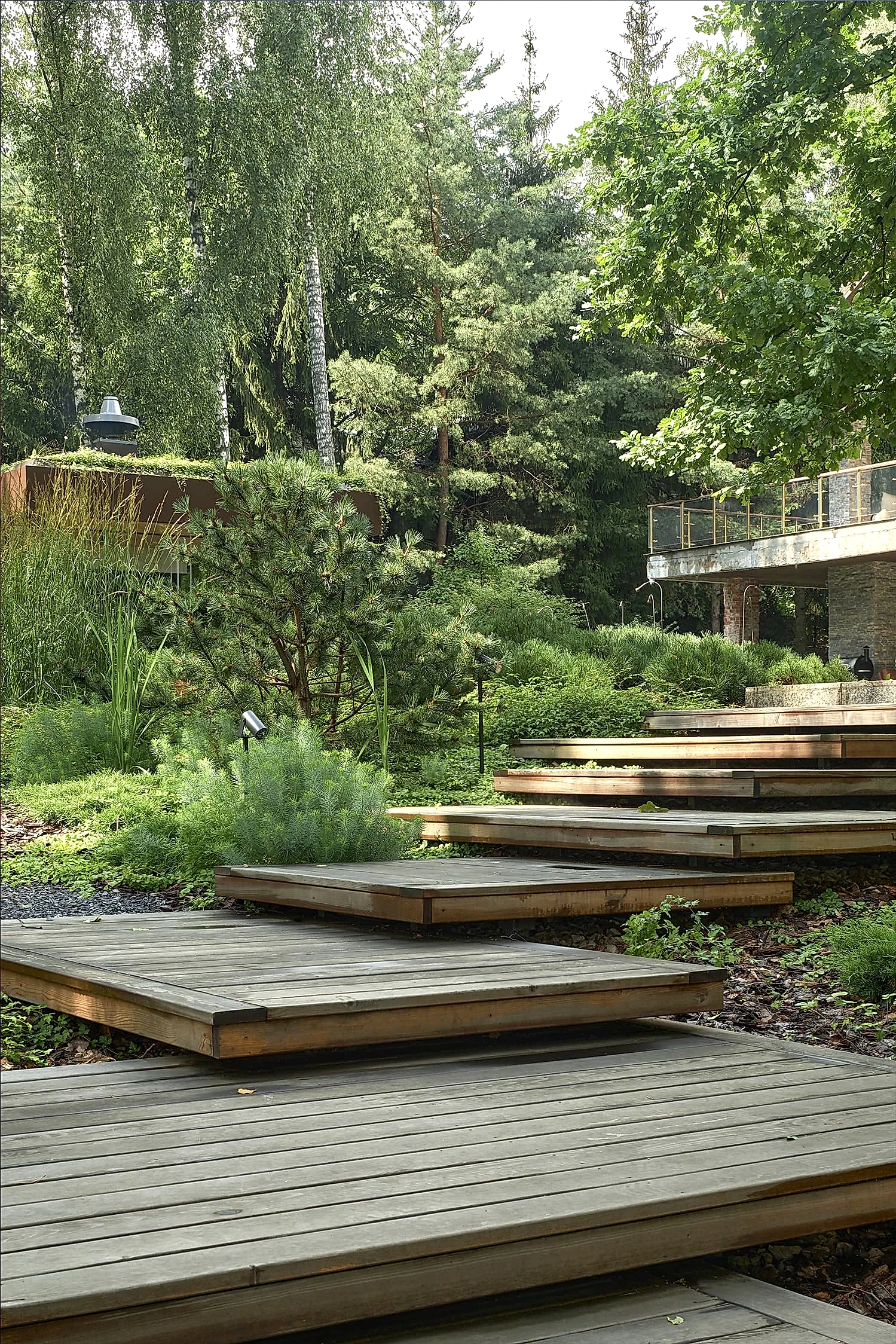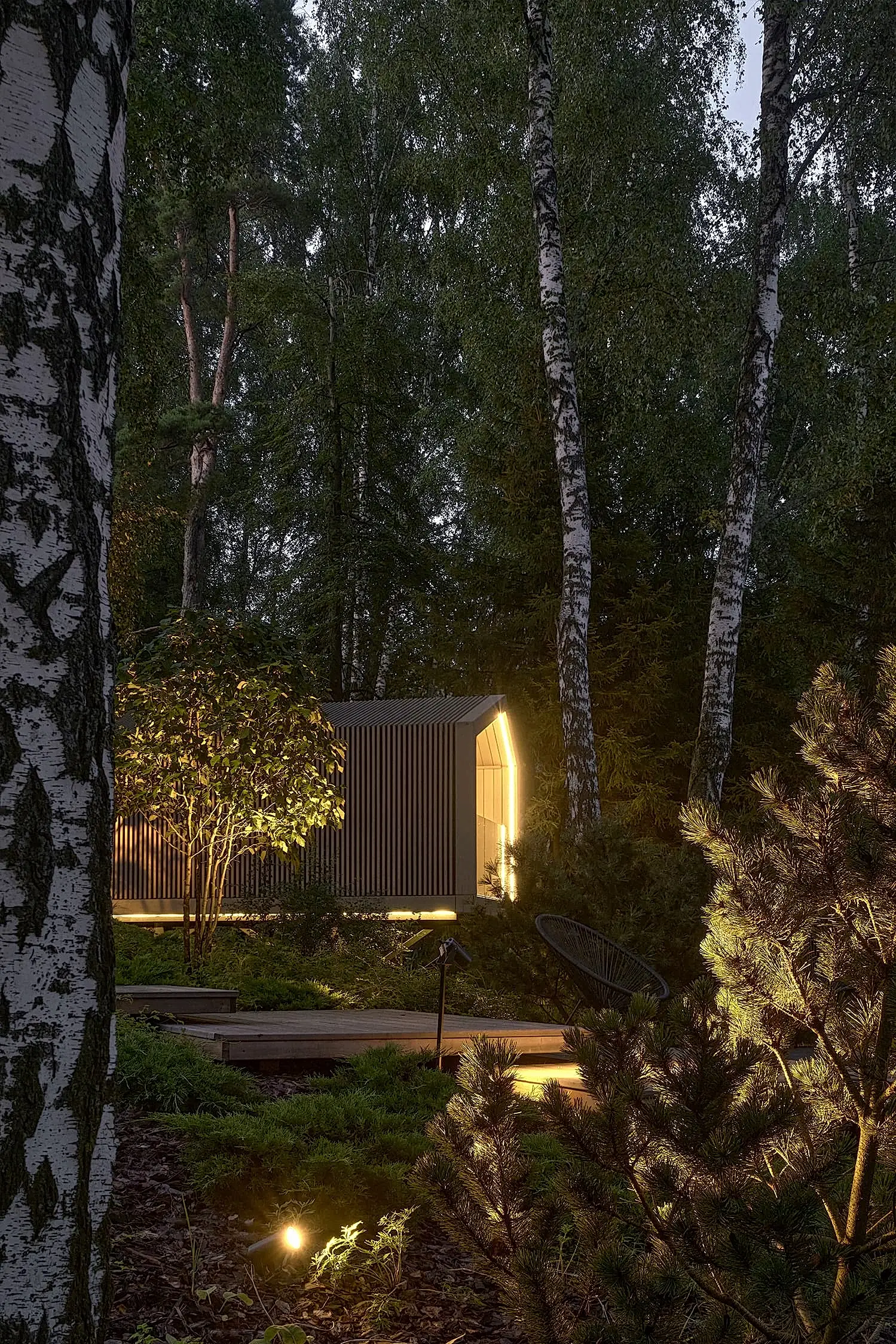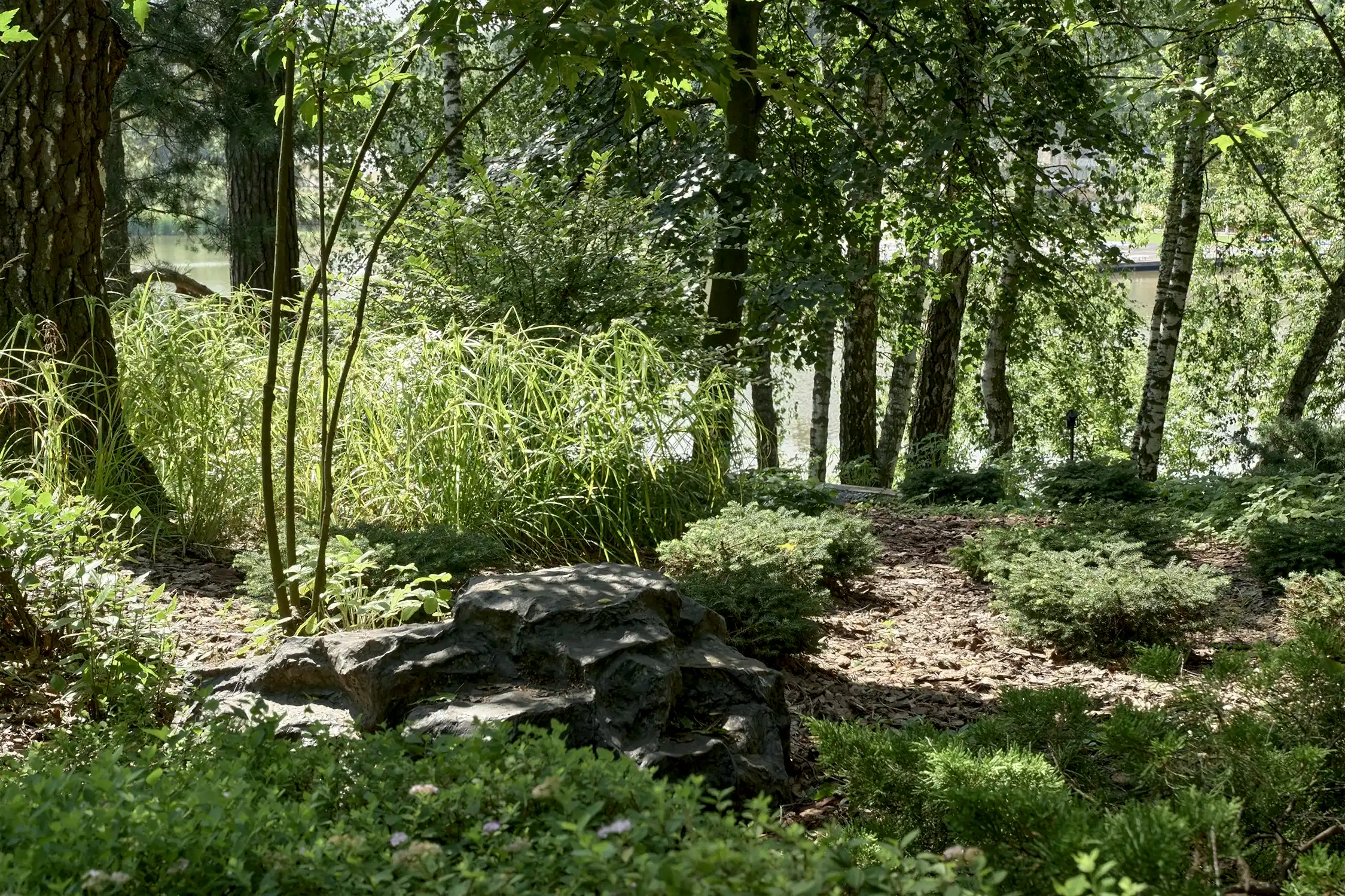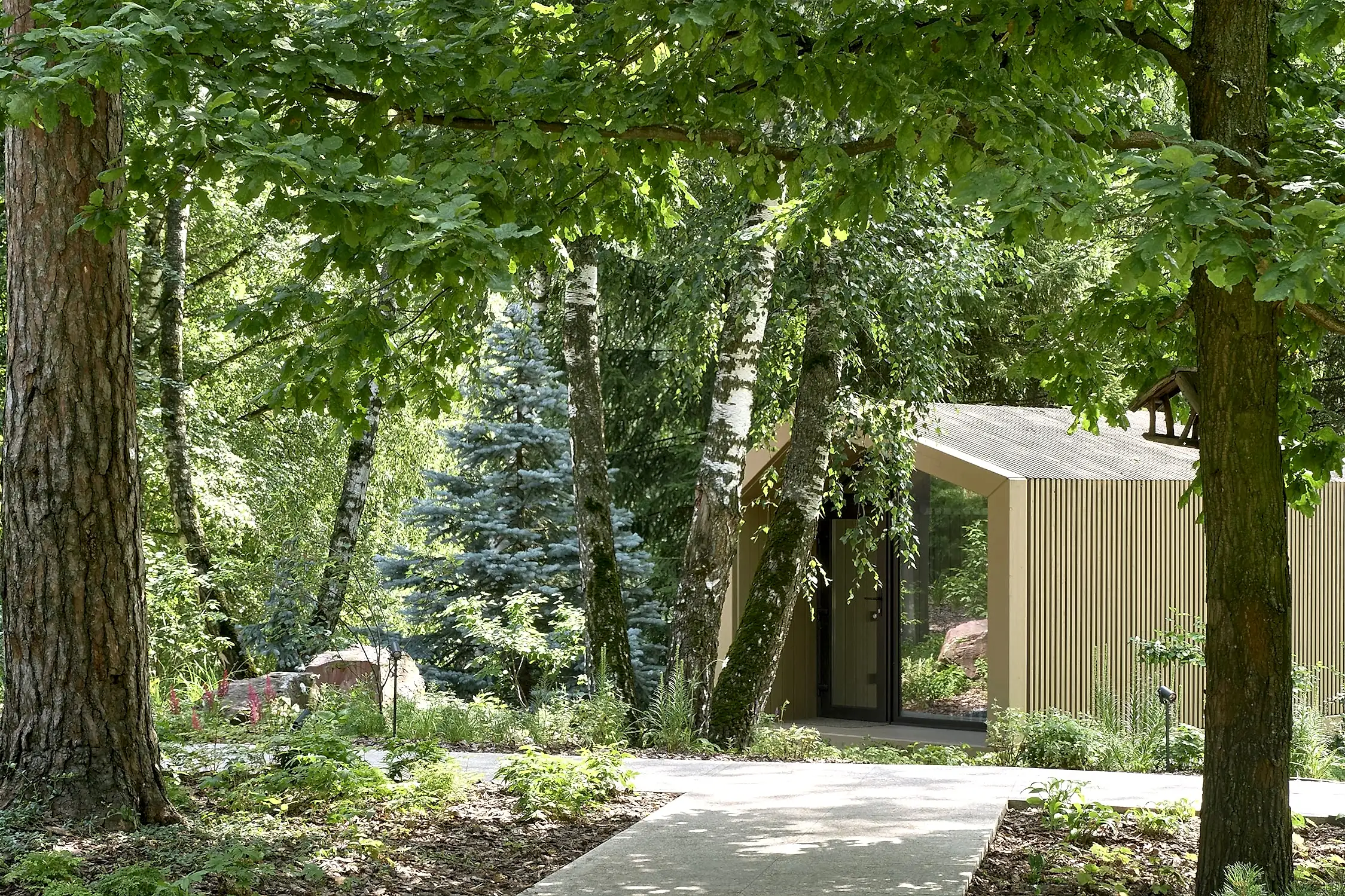 Понимая, что деревья на участке старые и со временем они будут уходить, мы применили нашу Pin-Up «постепенного замещения» - подсадили к старым деревьям молодые, которые со временем подрастут и сохранят ощущения взрослого леса.