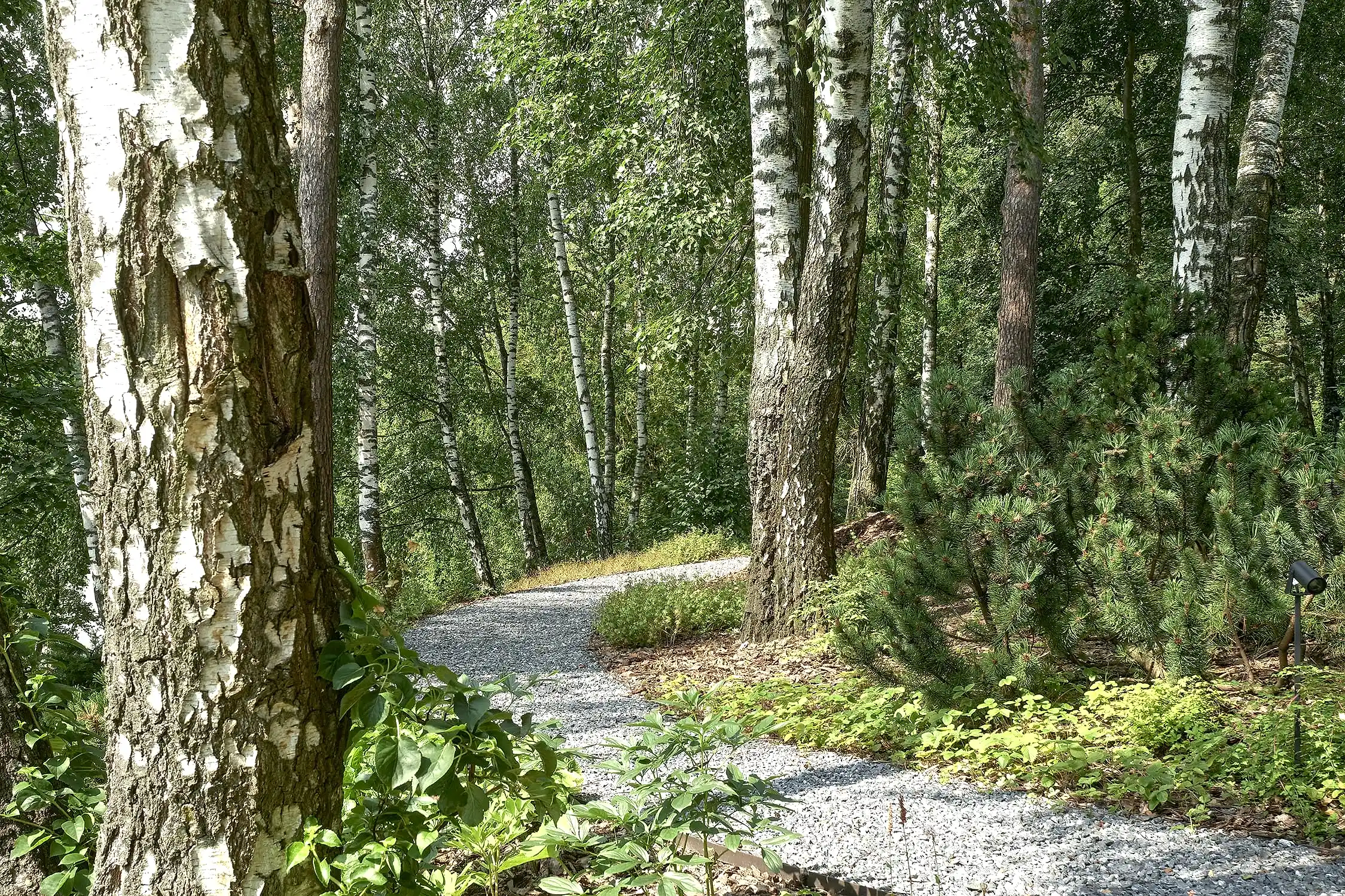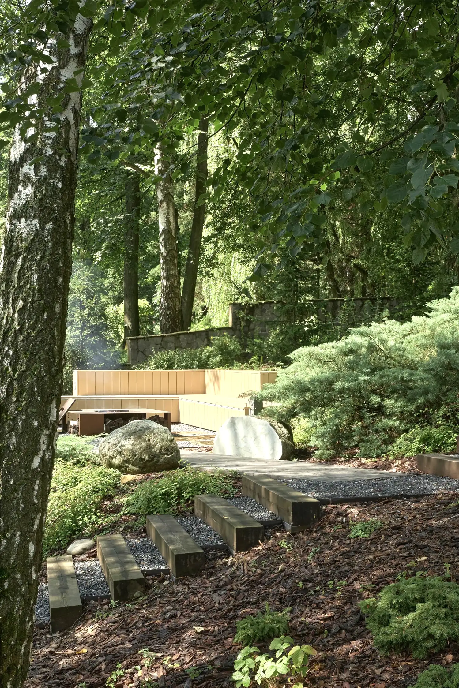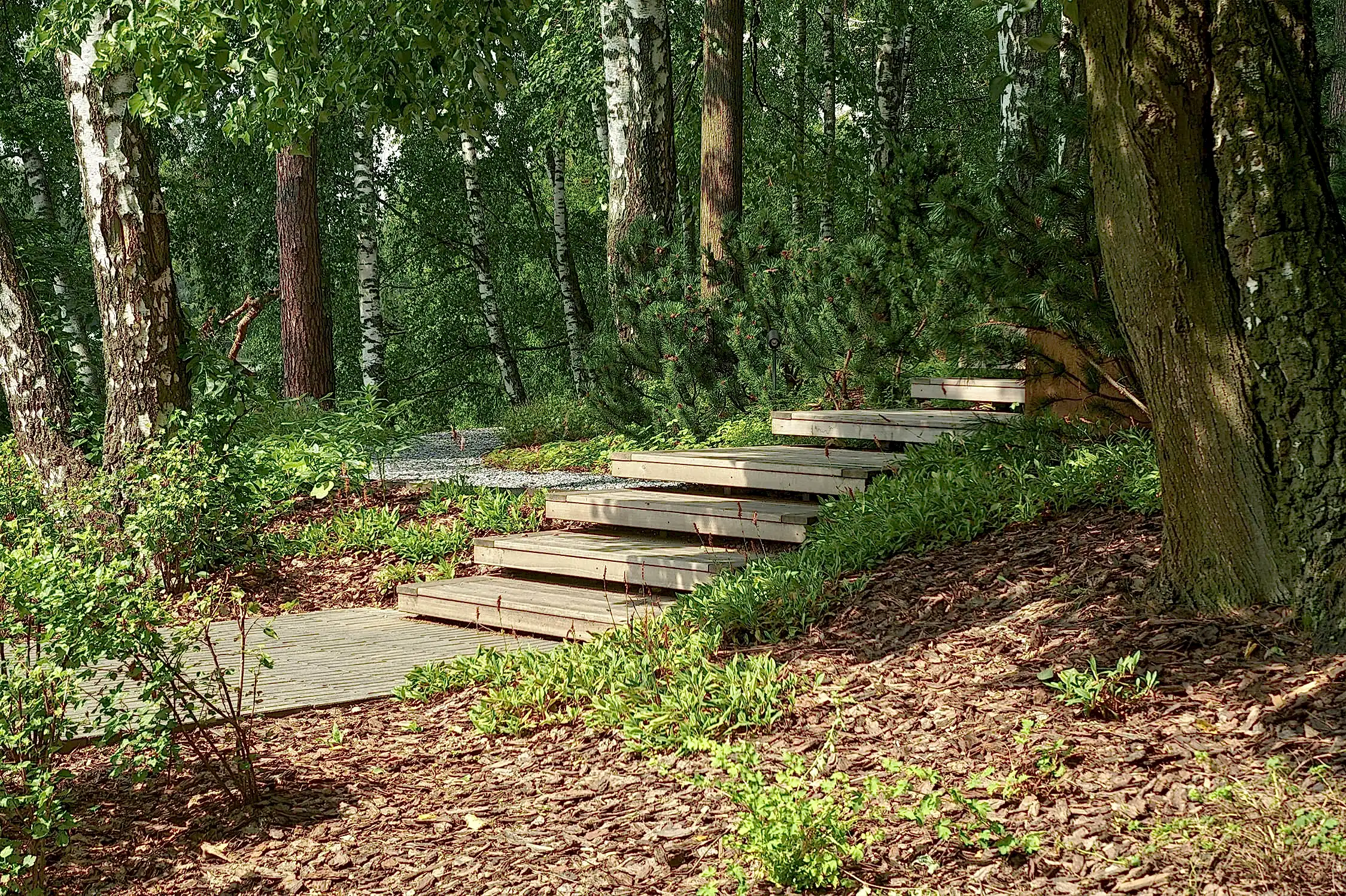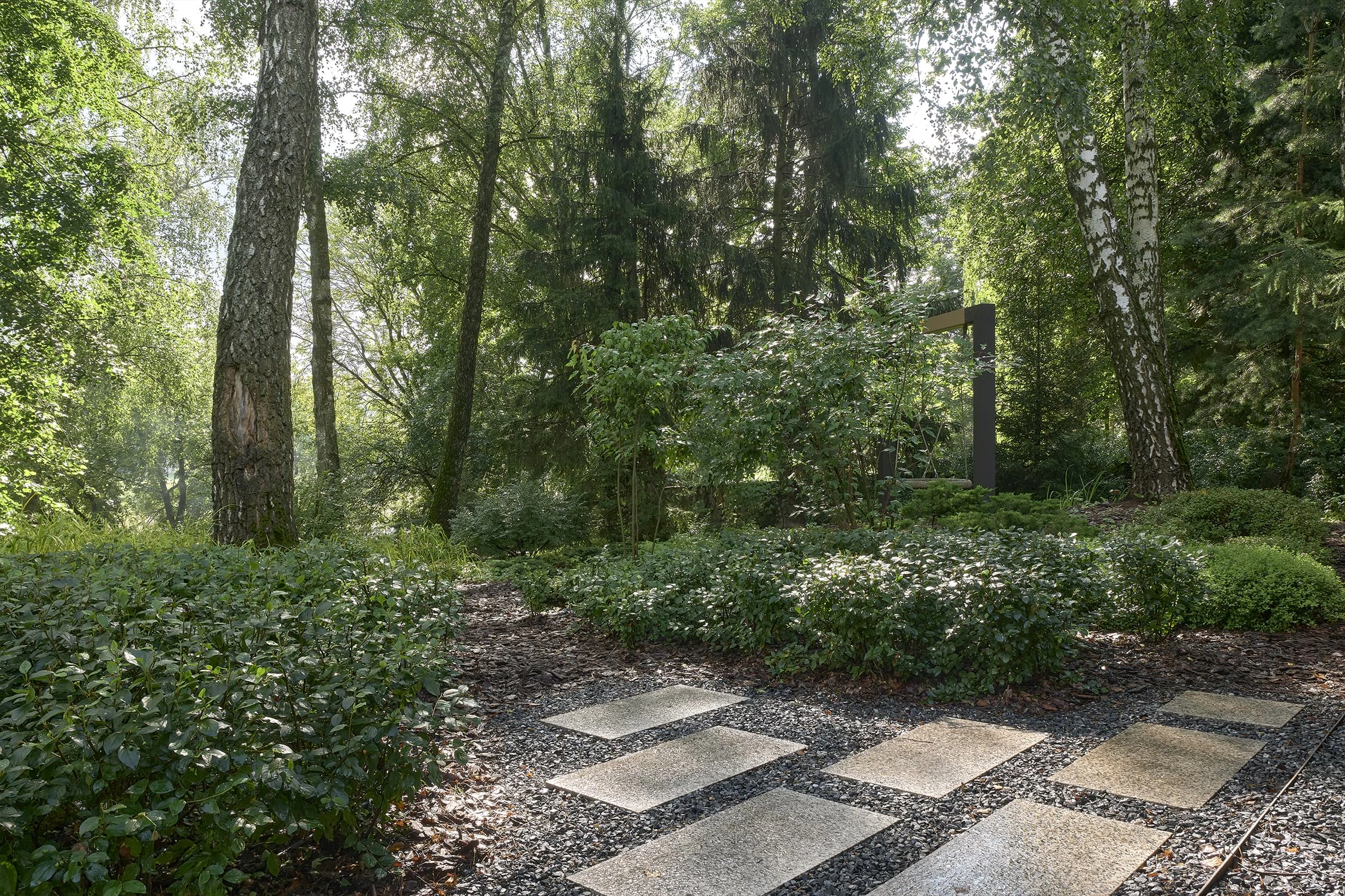 Понимая, что деревья на участке старые и со временем они будут уходить, мы применили нашу Pin-Up «постепенного замещения» - подсадили к старым деревьям молодые, которые со временем подрастут и сохранят ощущения взрослого леса.