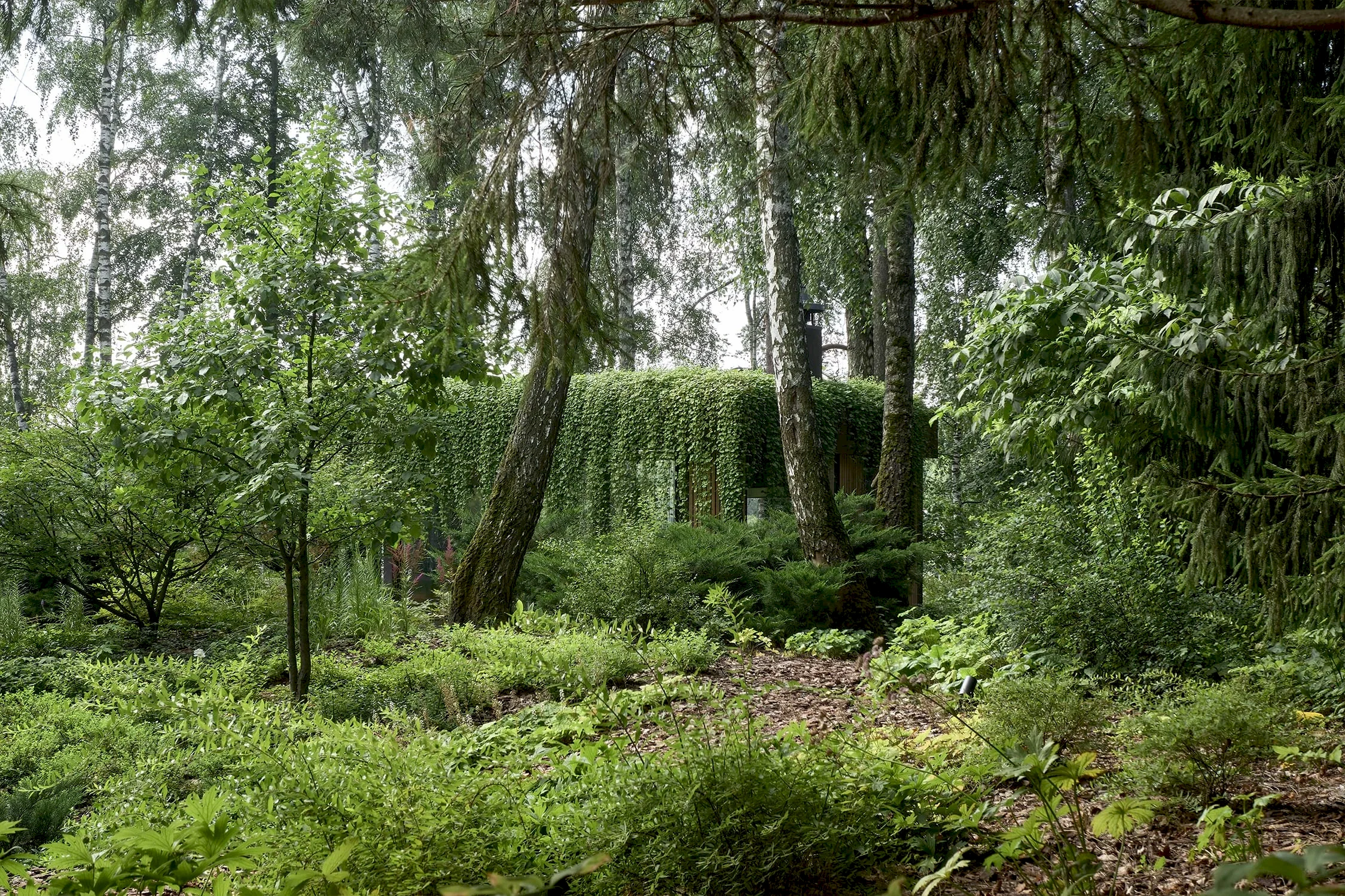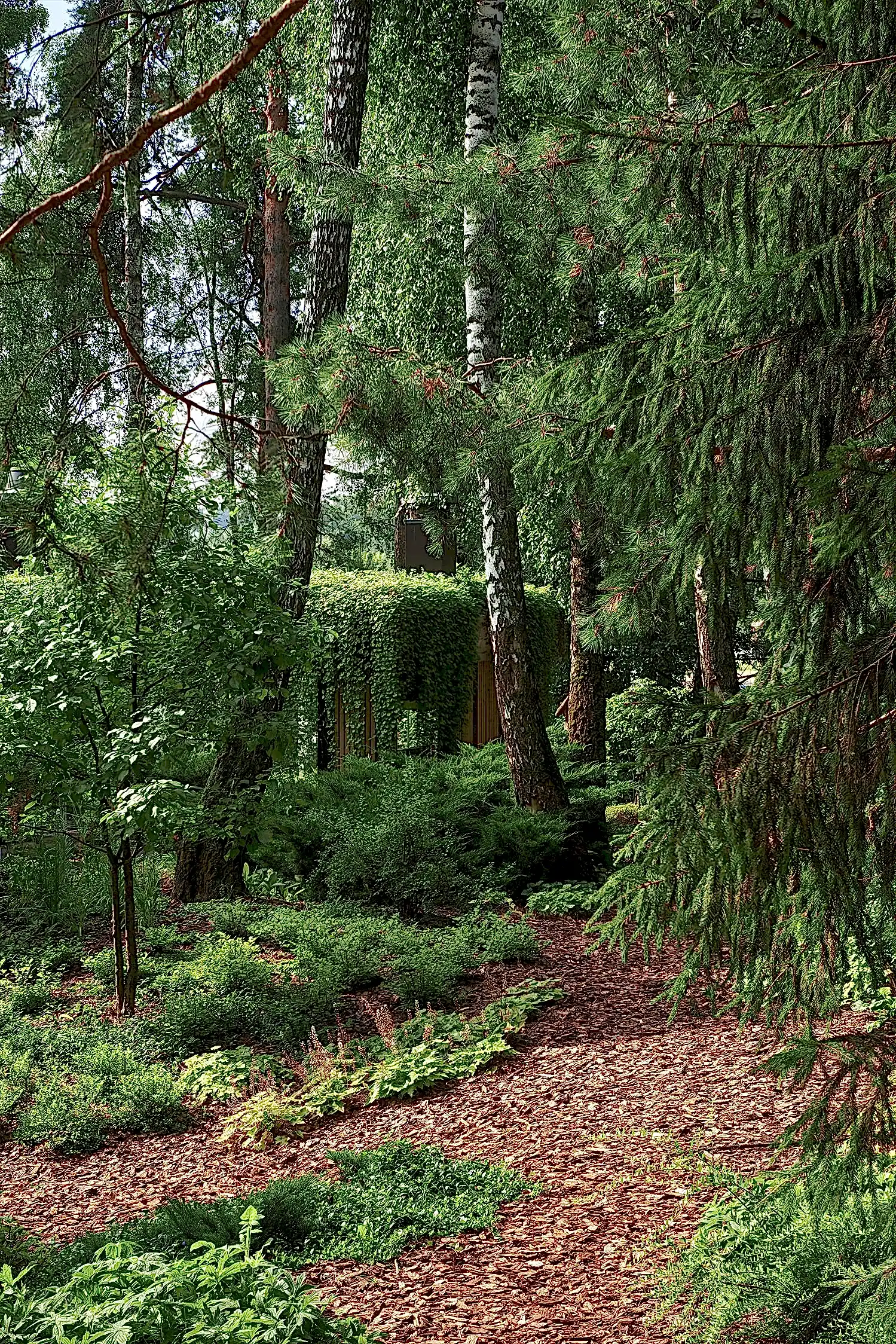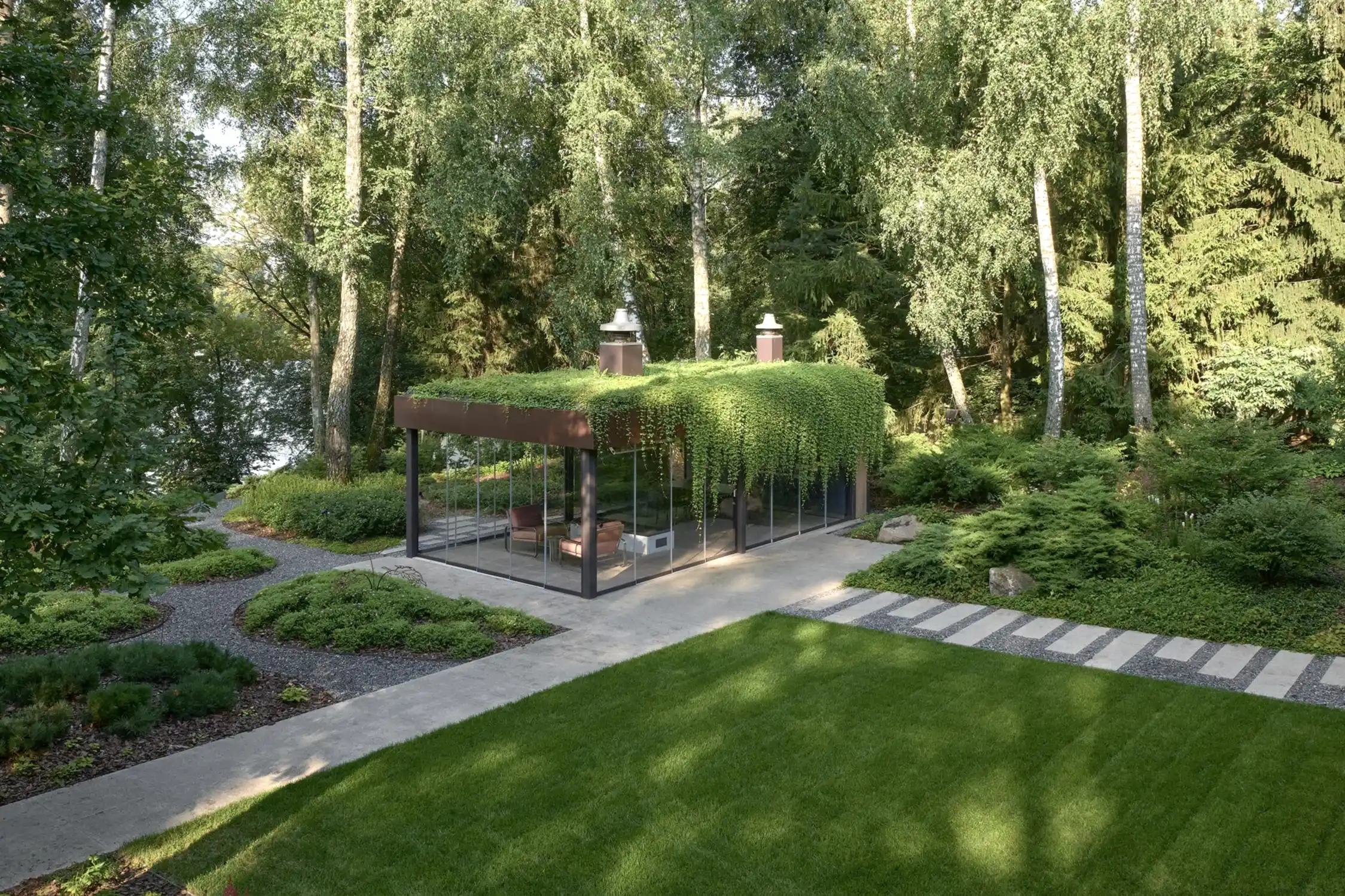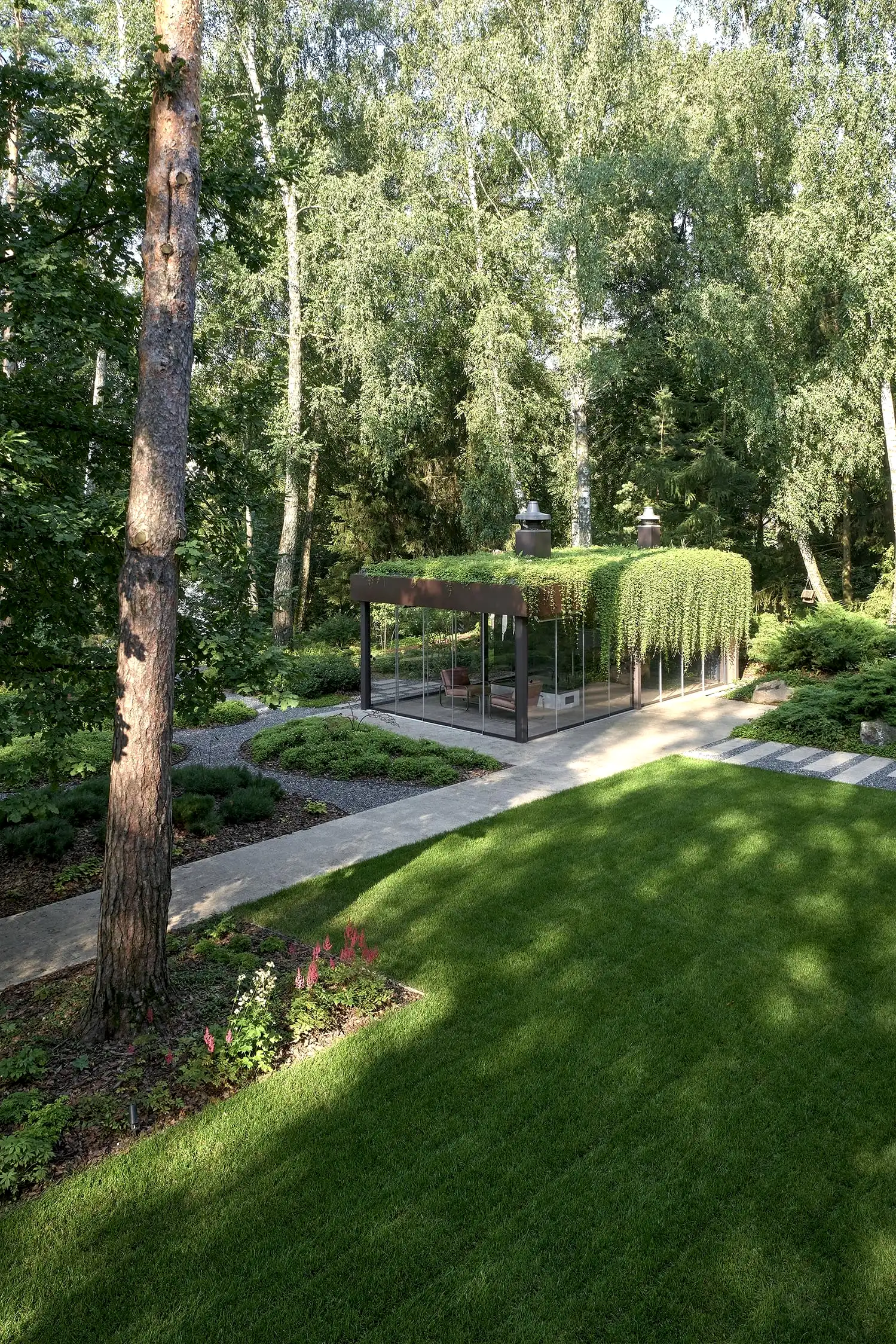 Растительный слой воссоздаёт лесной полог: барвинок, манжетка, пахизандра, папоротники - всё подобрано так, чтобы уважать ландшафтный код места. На крыше беседки мы тестировали пять видов растений. Победила будра ампельная - она не просто покрыла Pin-Up но и «спустилась» вниз, создав живые портьеры, превратившие беседку в любимое семейное убежище.