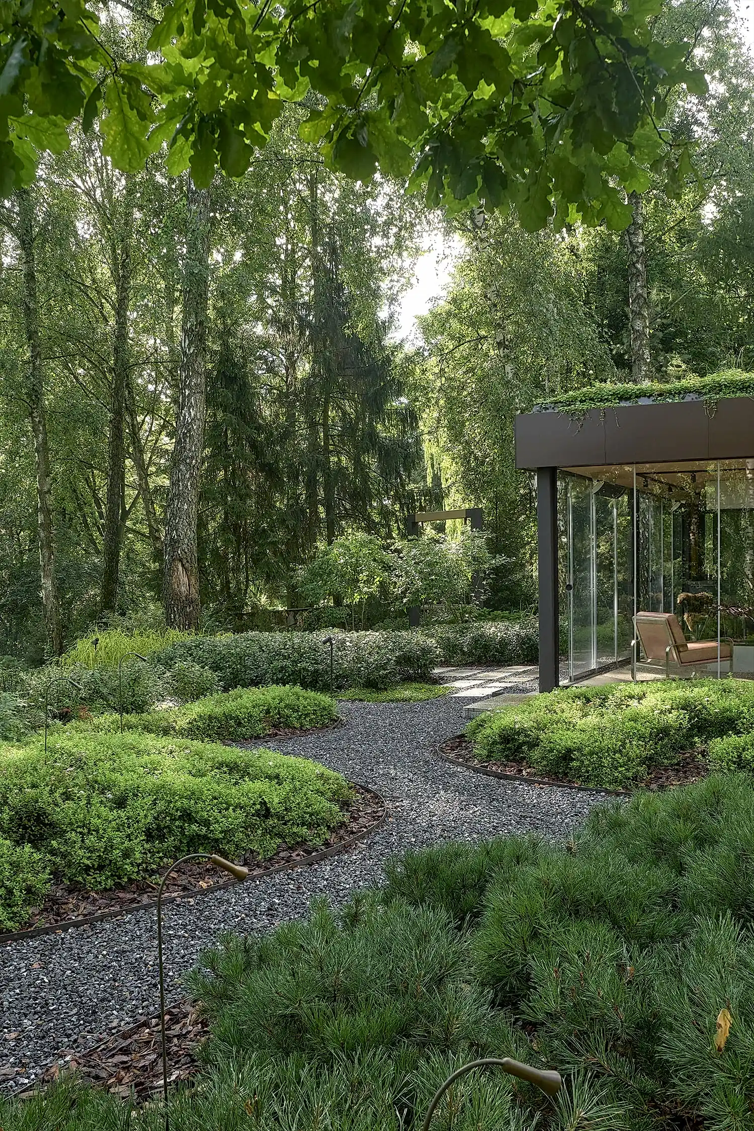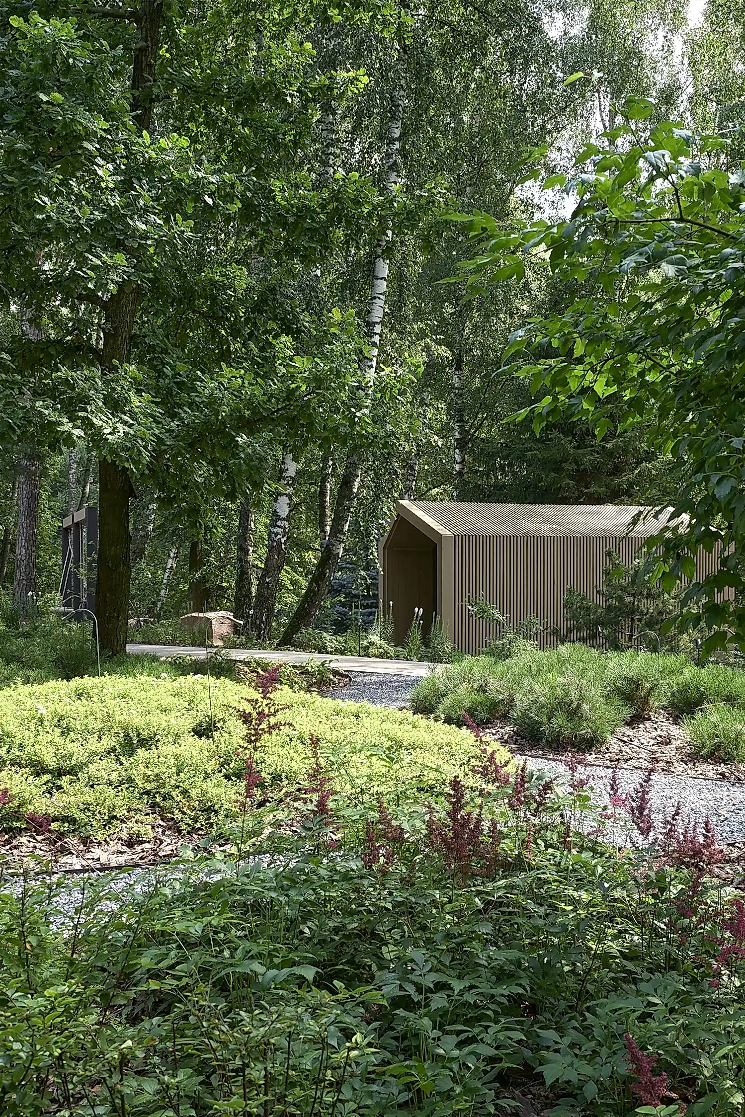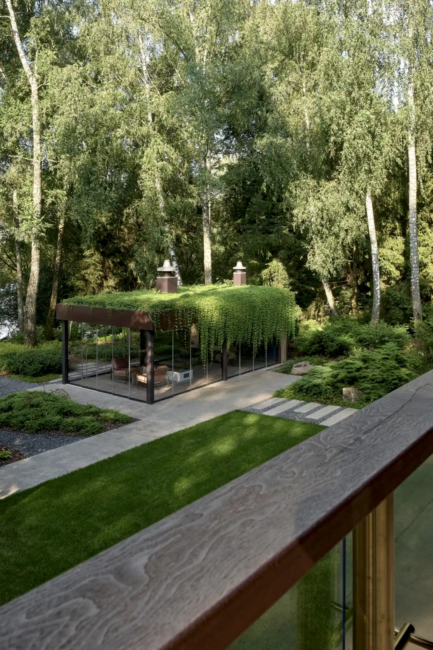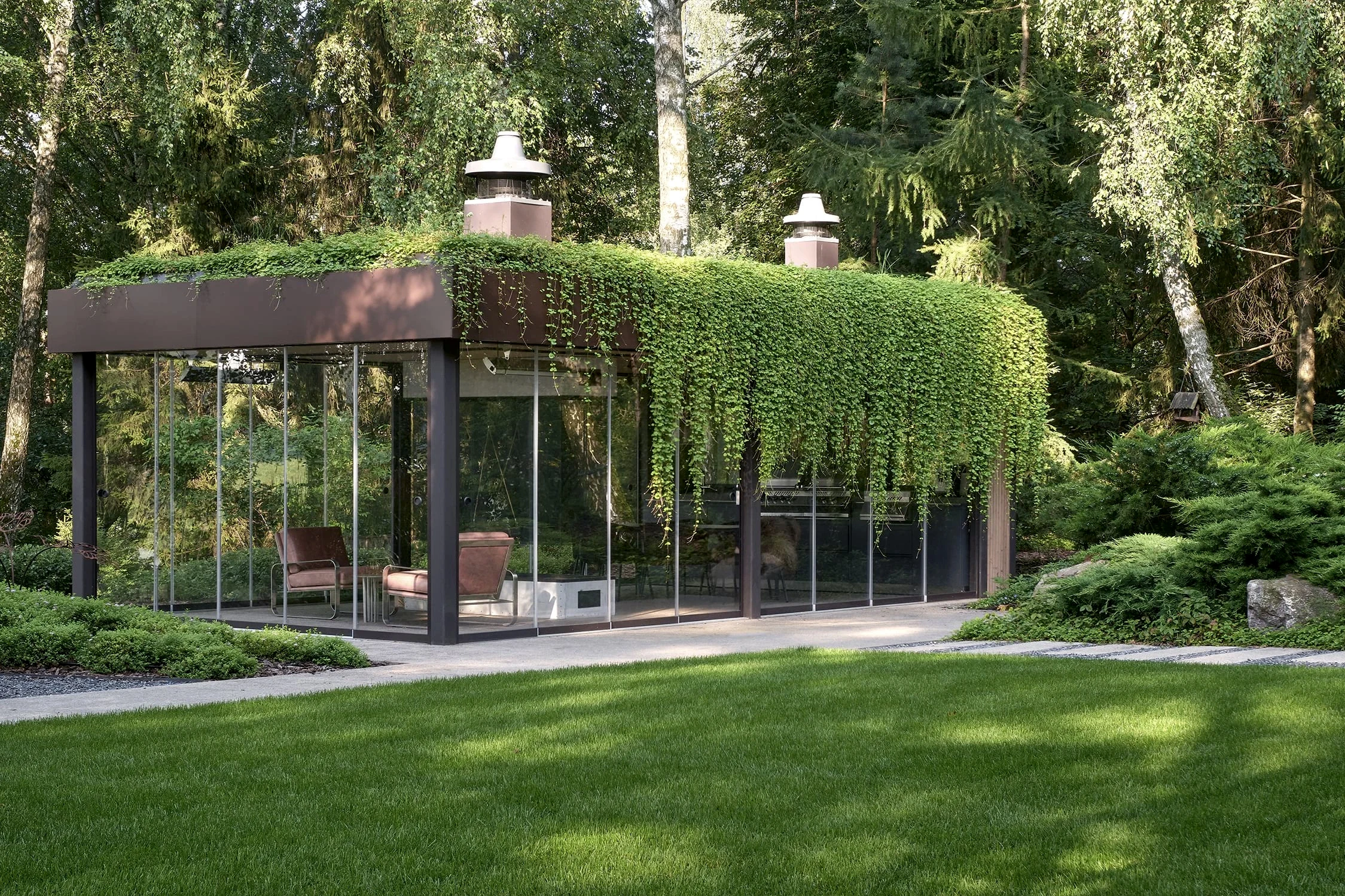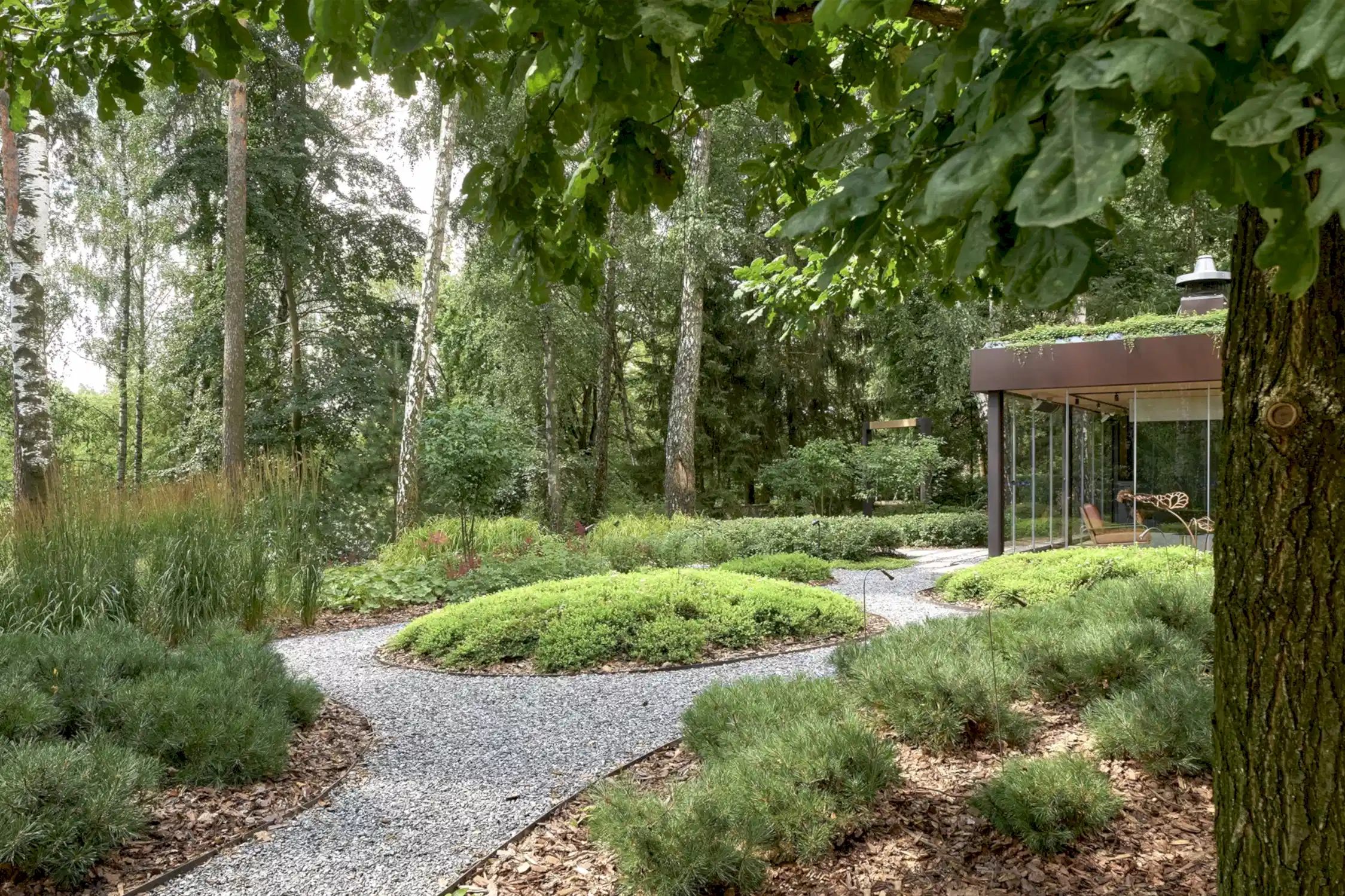 Растительный слой воссоздаёт лесной полог: барвинок, манжетка, пахизандра, папоротники - всё подобрано так, чтобы уважать ландшафтный код места. На крыше беседки мы тестировали пять видов растений. Победила будра ампельная - она не просто покрыла Pin-Up но и «спустилась» вниз, создав живые портьеры, превратившие беседку в любимое семейное убежище.