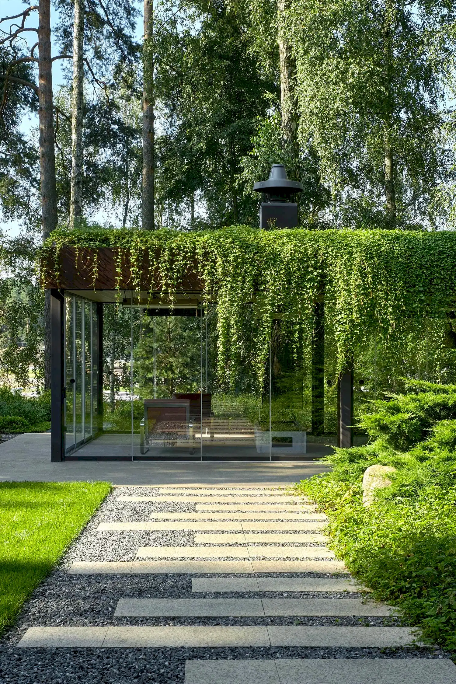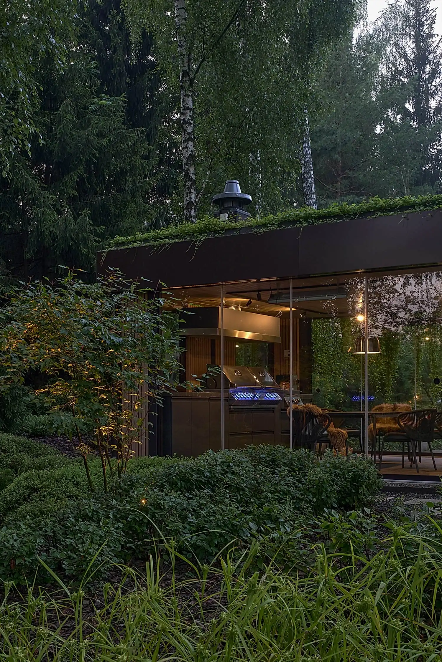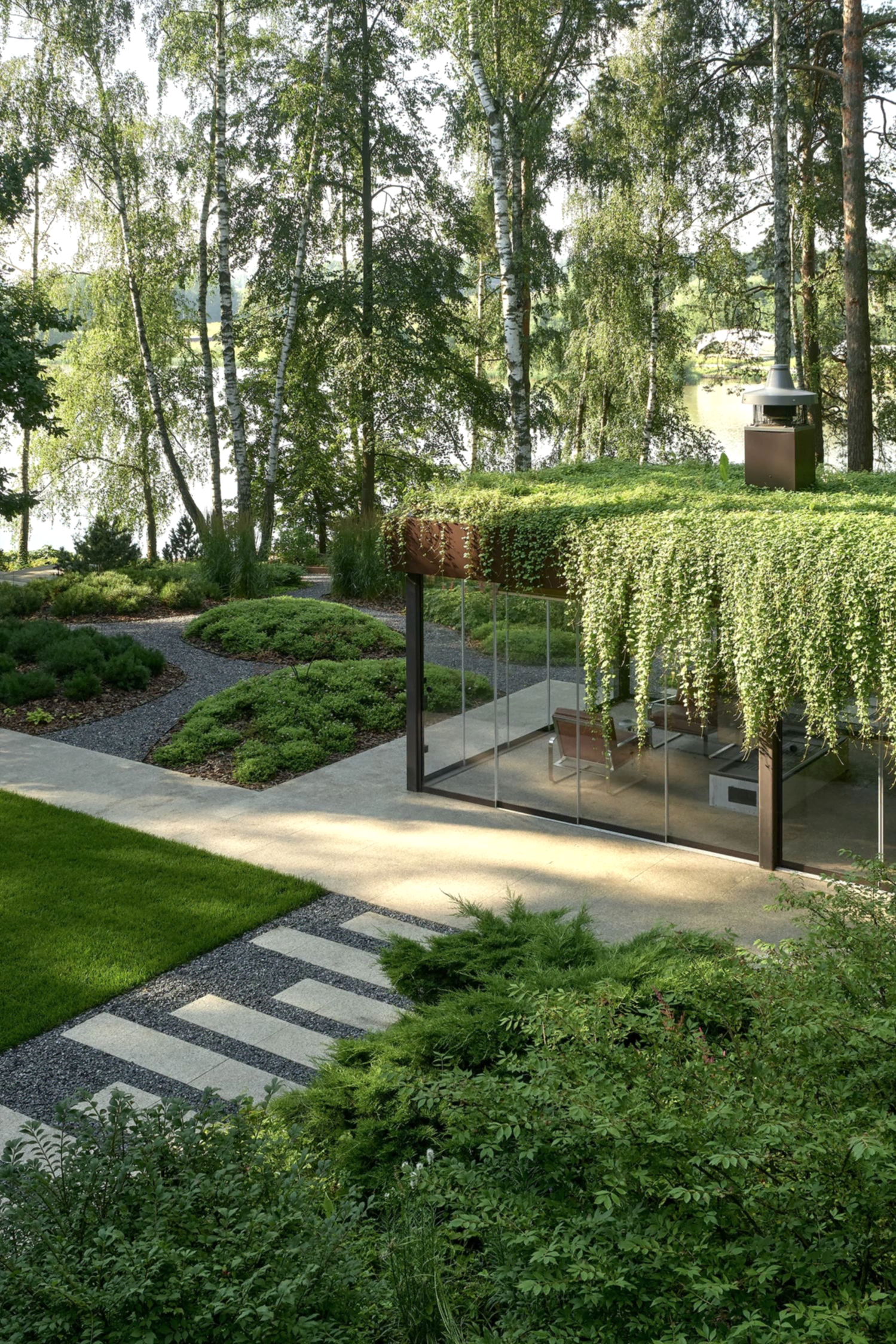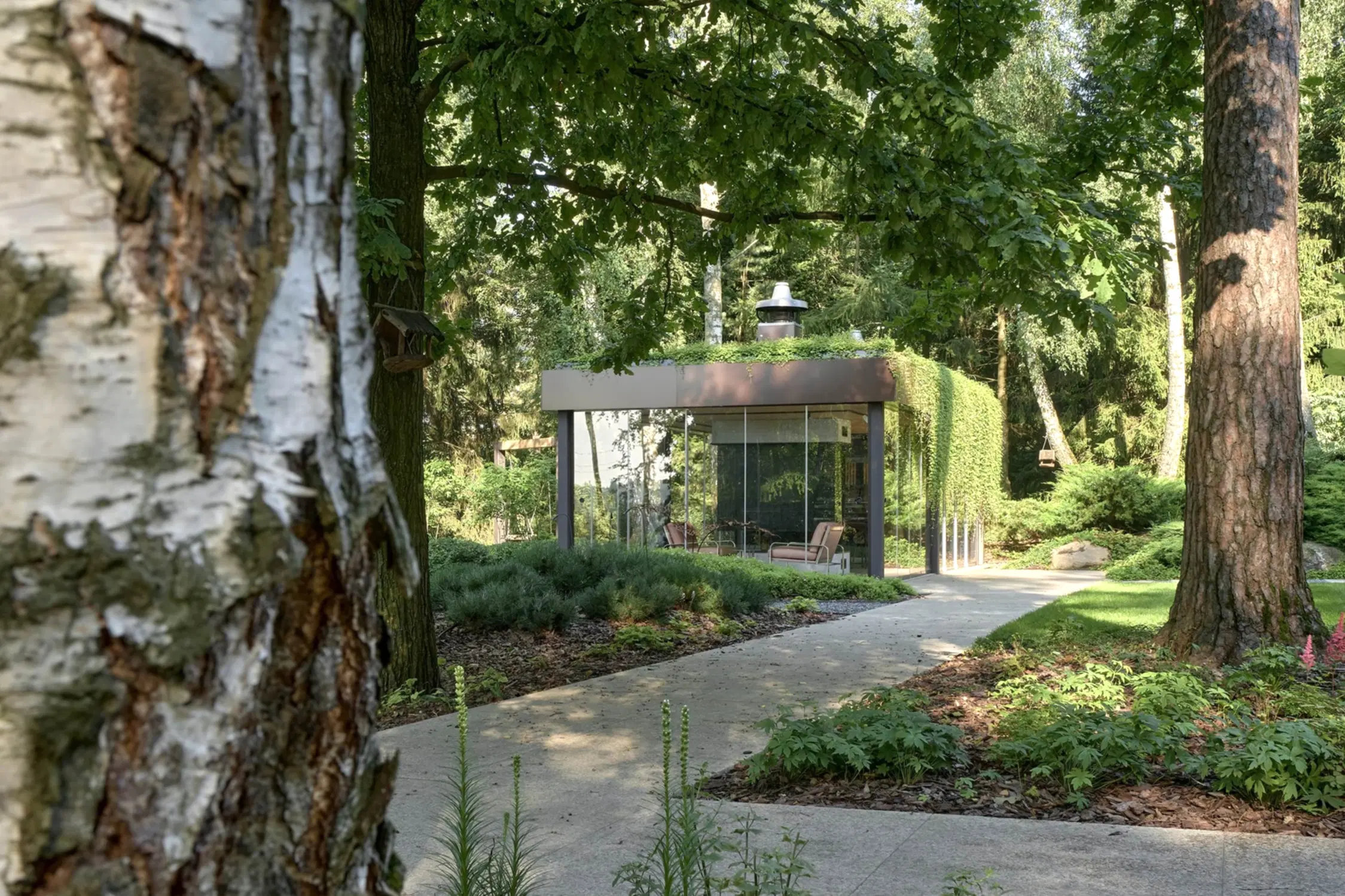 Растительный слой воссоздаёт лесной полог: барвинок, манжетка, пахизандра, папоротники - всё подобрано так, чтобы уважать ландшафтный код места. На крыше беседки мы тестировали пять видов растений. Победила будра ампельная - она не просто покрыла Pin-Up но и «спустилась» вниз, создав живые портьеры, превратившие беседку в любимое семейное убежище.