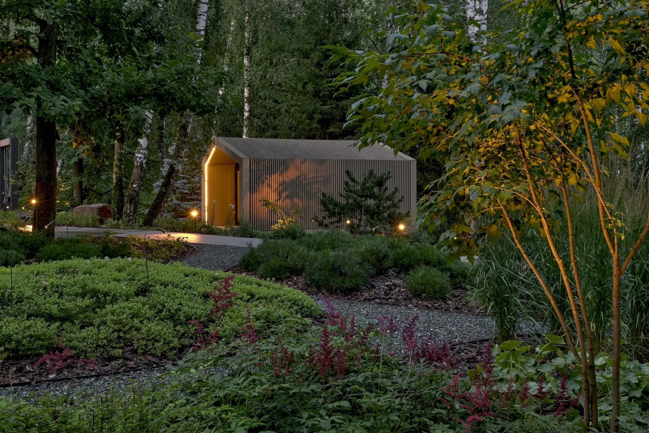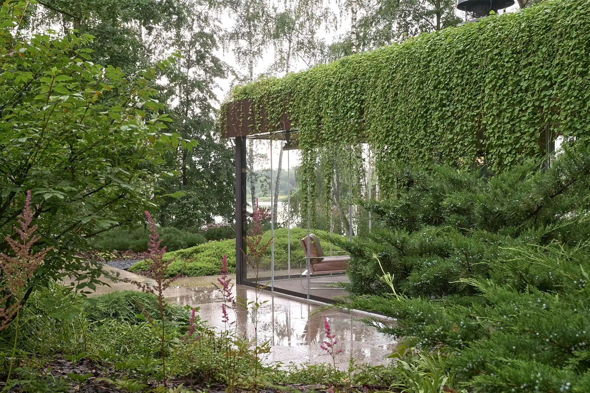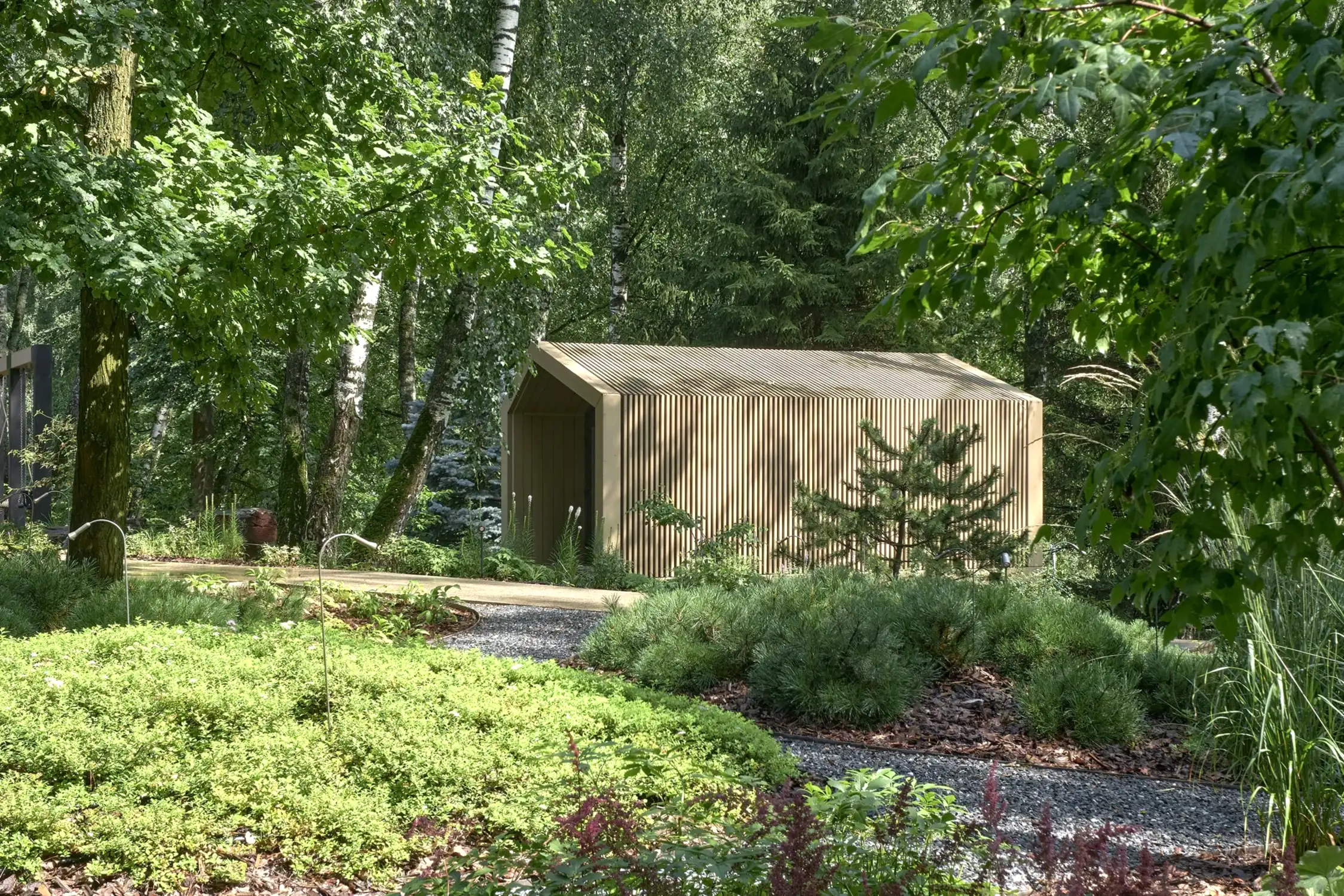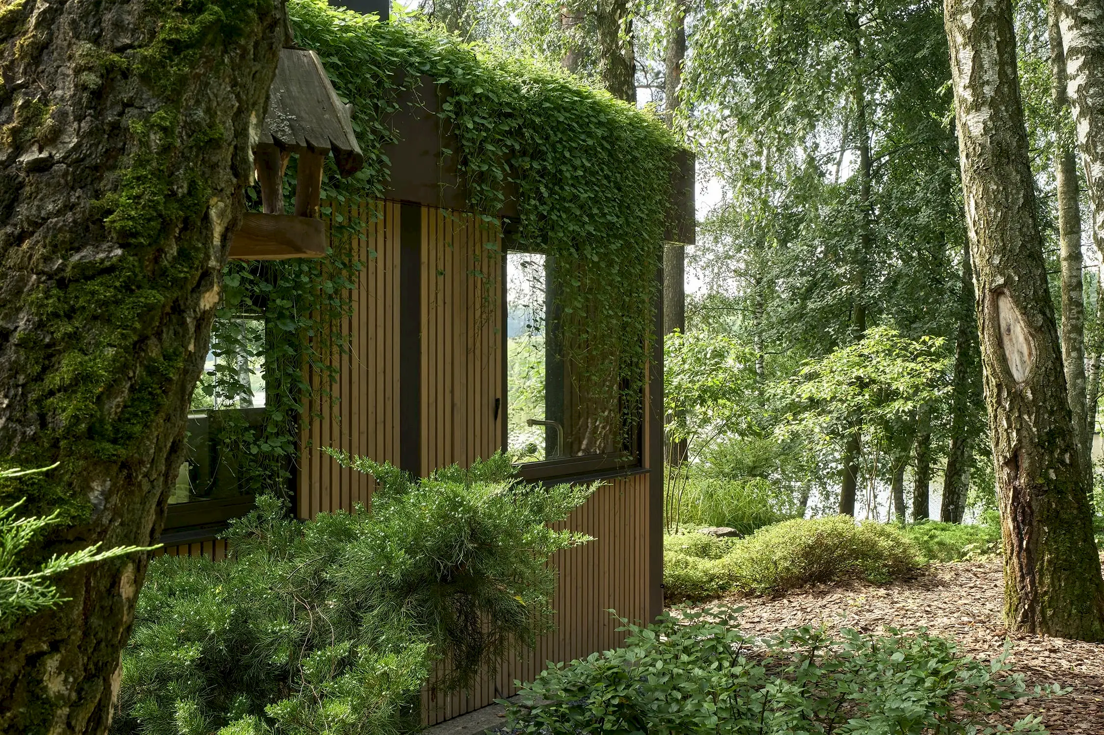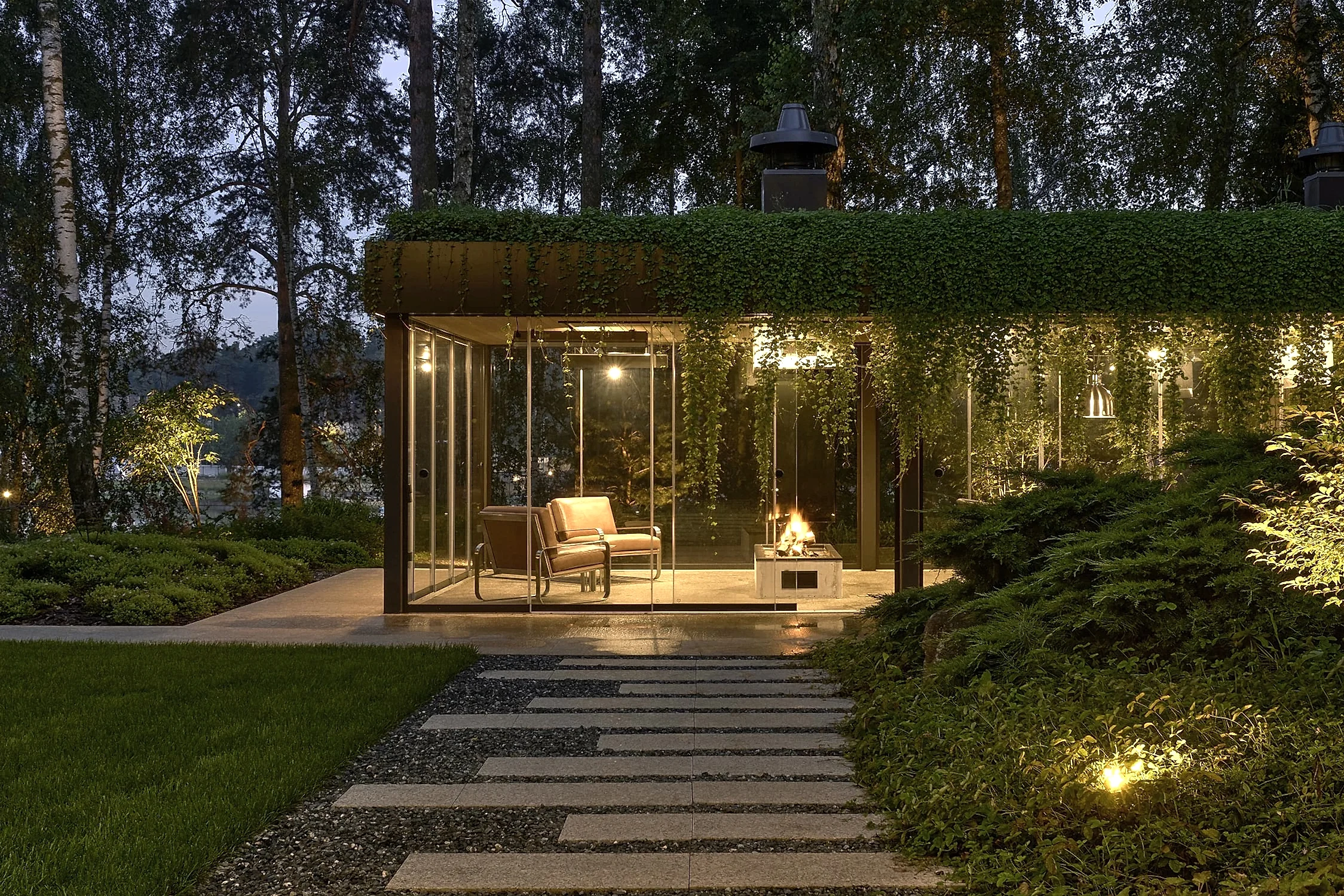 Растительный слой воссоздаёт лесной полог: барвинок, манжетка, пахизандра, папоротники - всё подобрано так, чтобы уважать ландшафтный код места. На крыше беседки мы тестировали пять видов растений. Победила будра ампельная - она не просто покрыла Pin-Up но и «спустилась» вниз, создав живые портьеры, превратившие беседку в любимое семейное убежище.