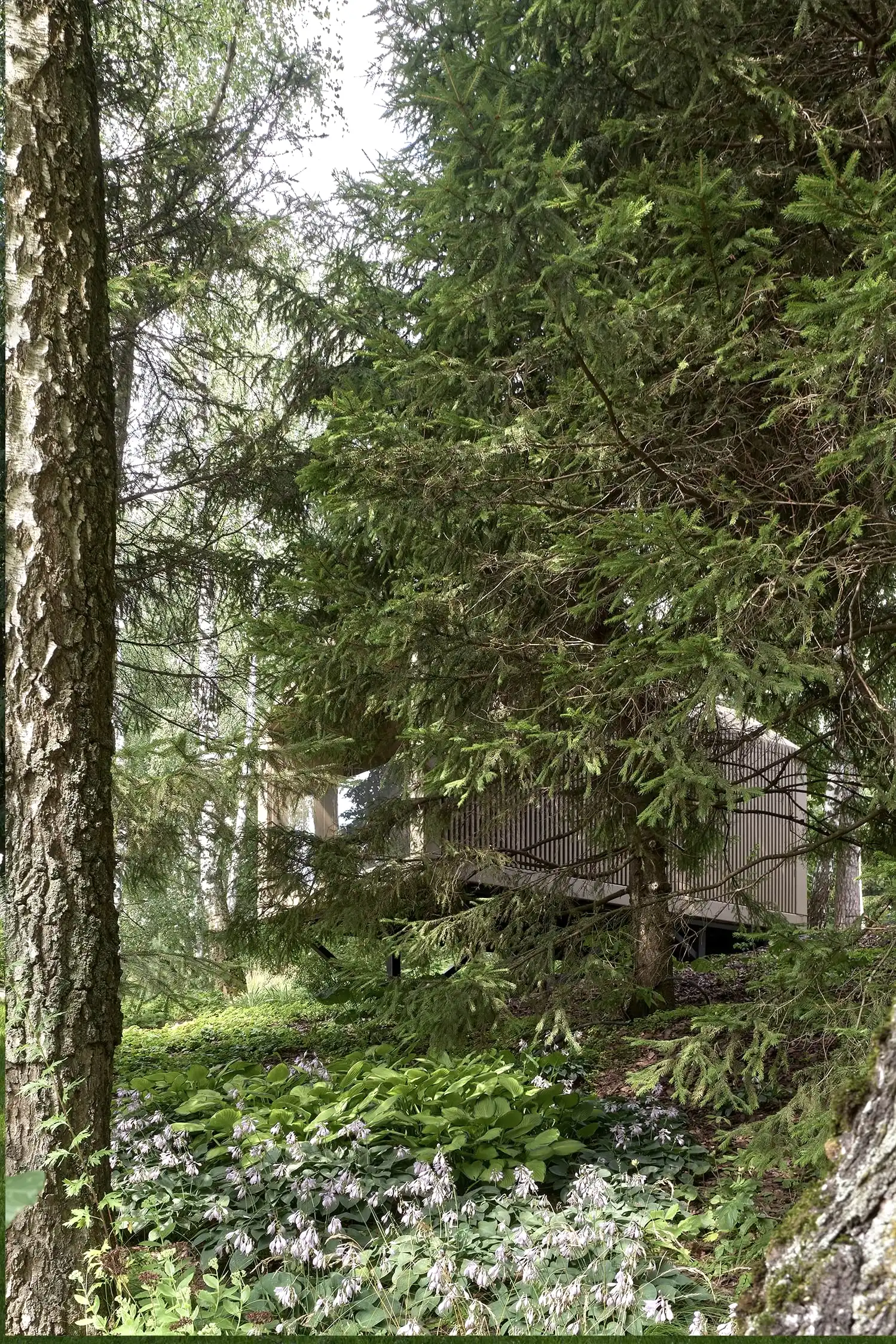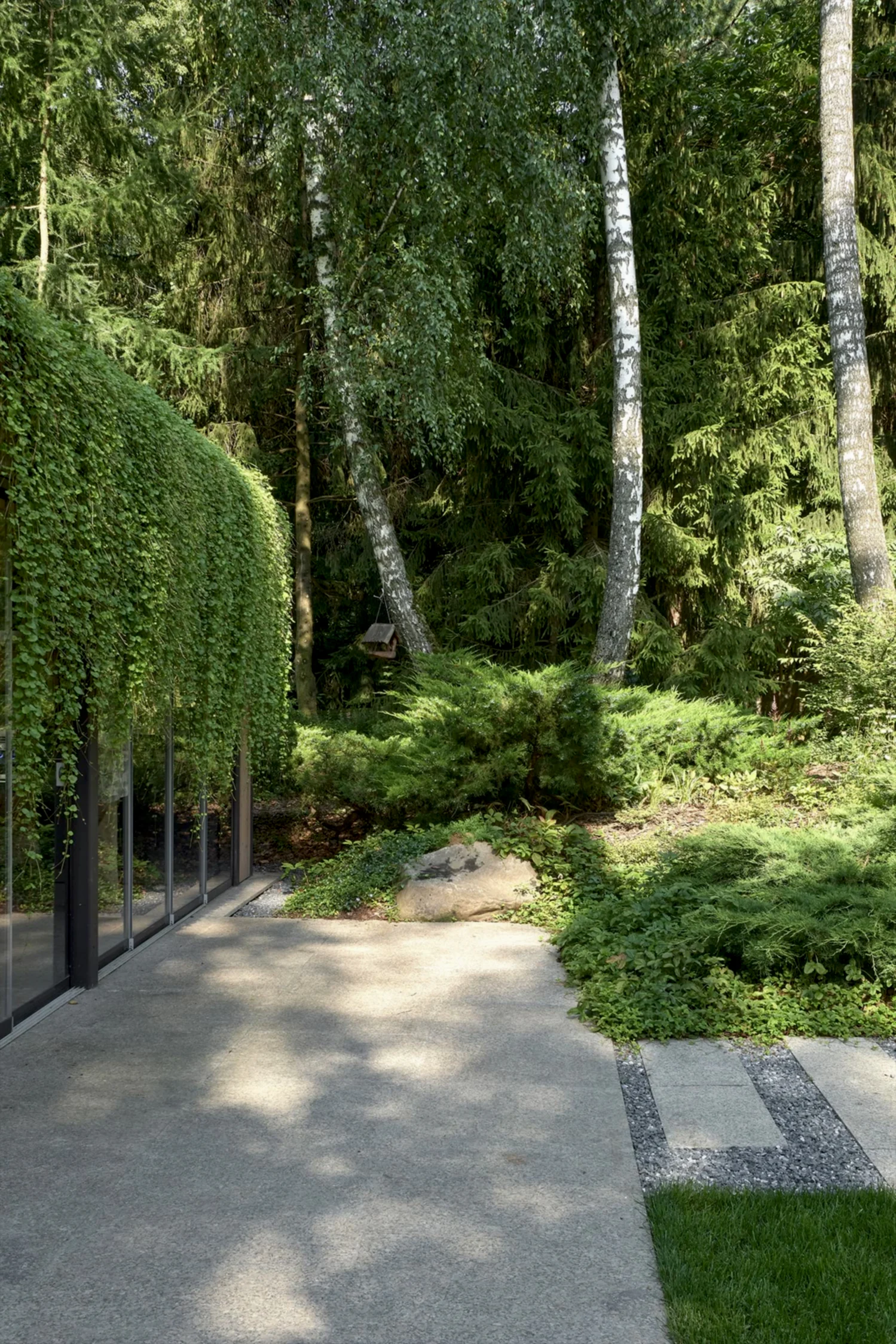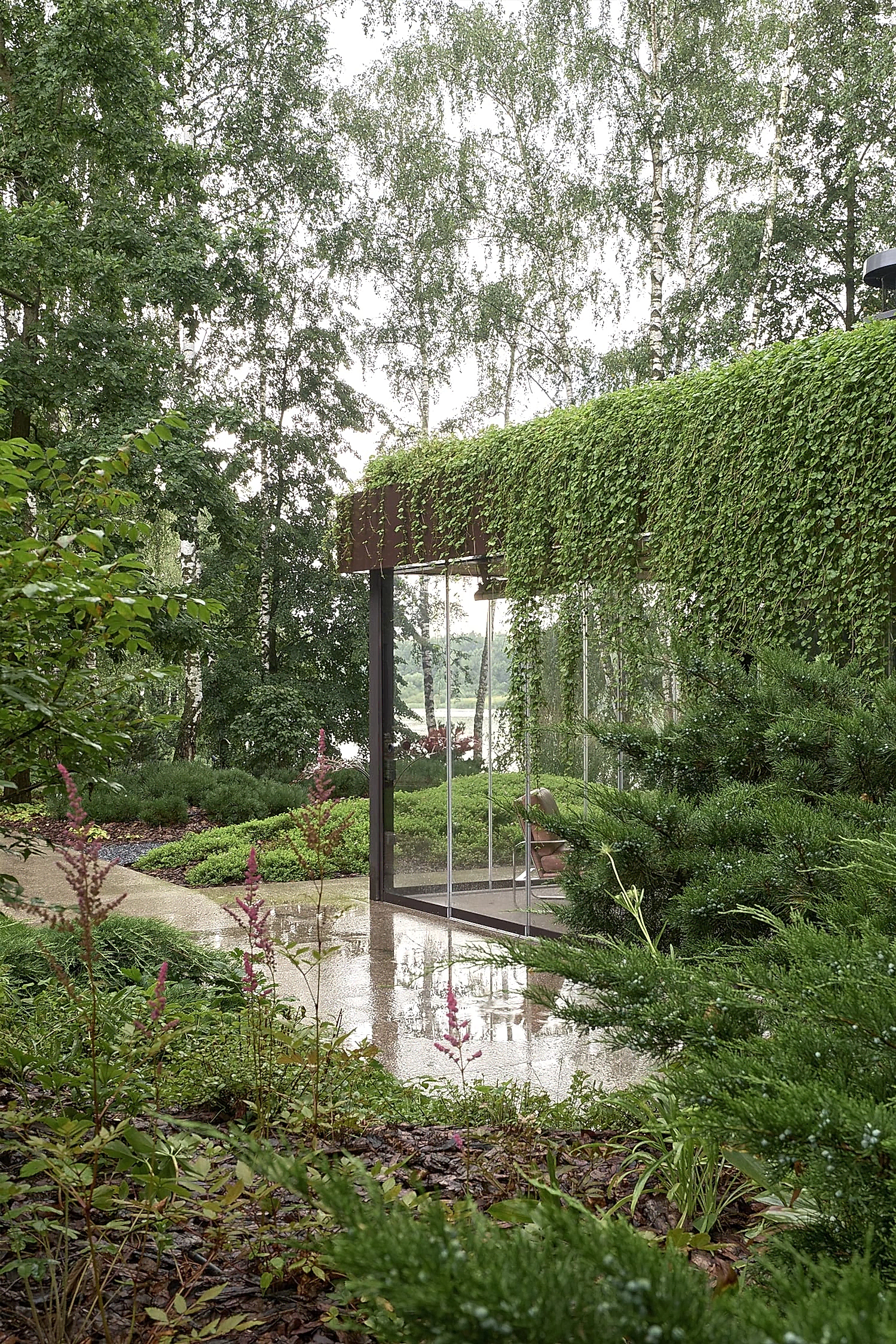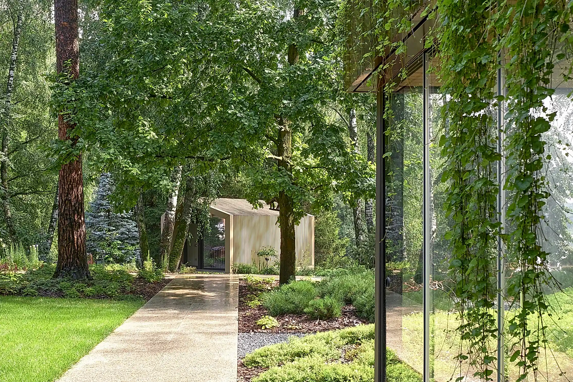 Растительный слой воссоздаёт лесной полог: барвинок, манжетка, пахизандра, папоротники - всё подобрано так, чтобы уважать ландшафтный код места. На крыше беседки мы тестировали пять видов растений. Победила будра ампельная - она не просто покрыла Pin-Up но и «спустилась» вниз, создав живые портьеры, превратившие беседку в любимое семейное убежище.