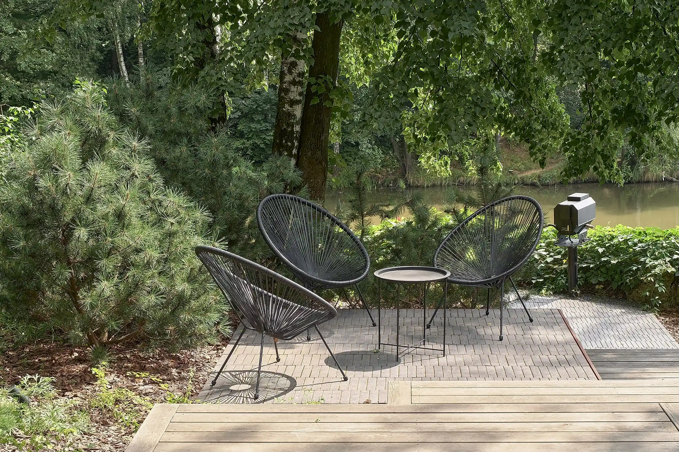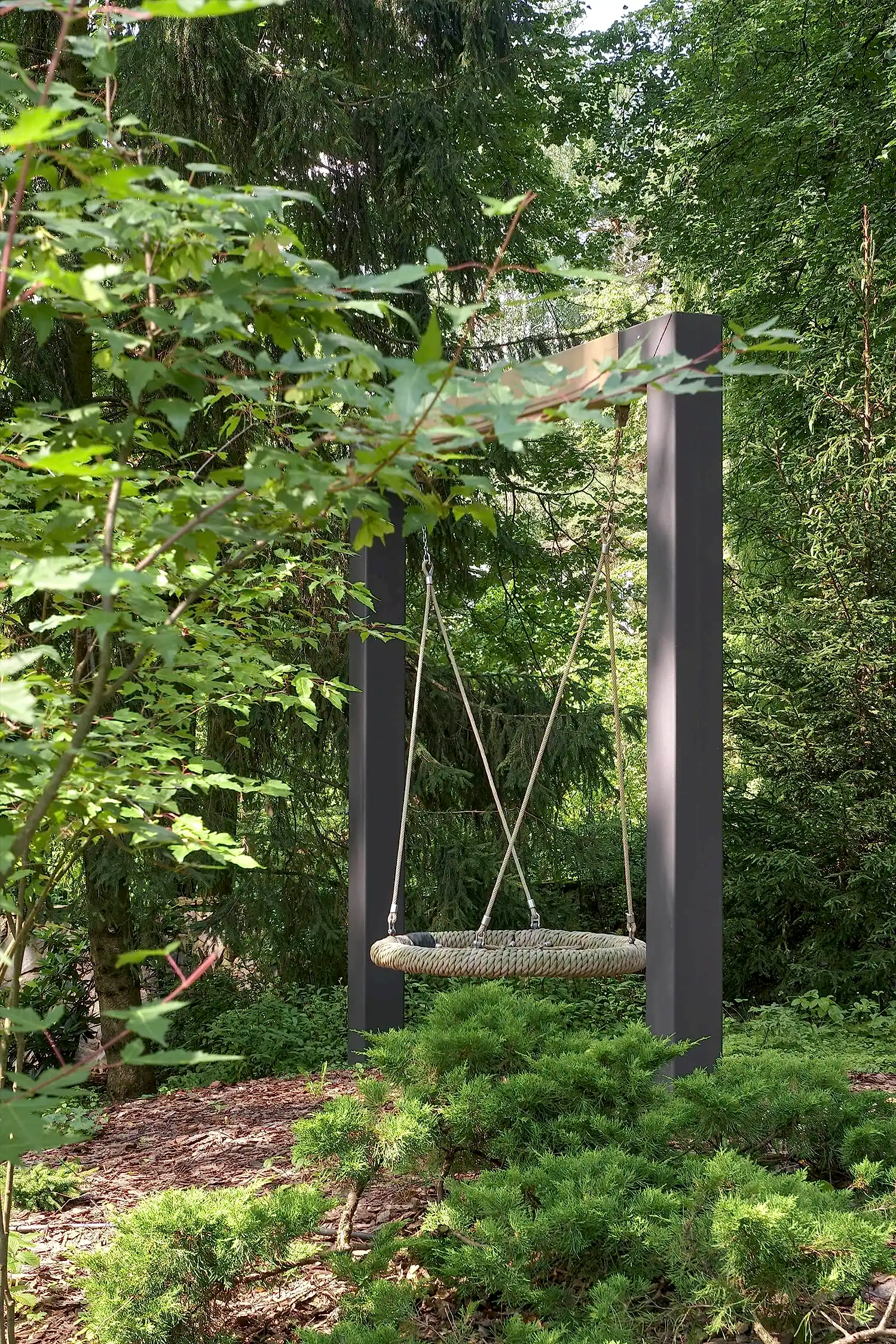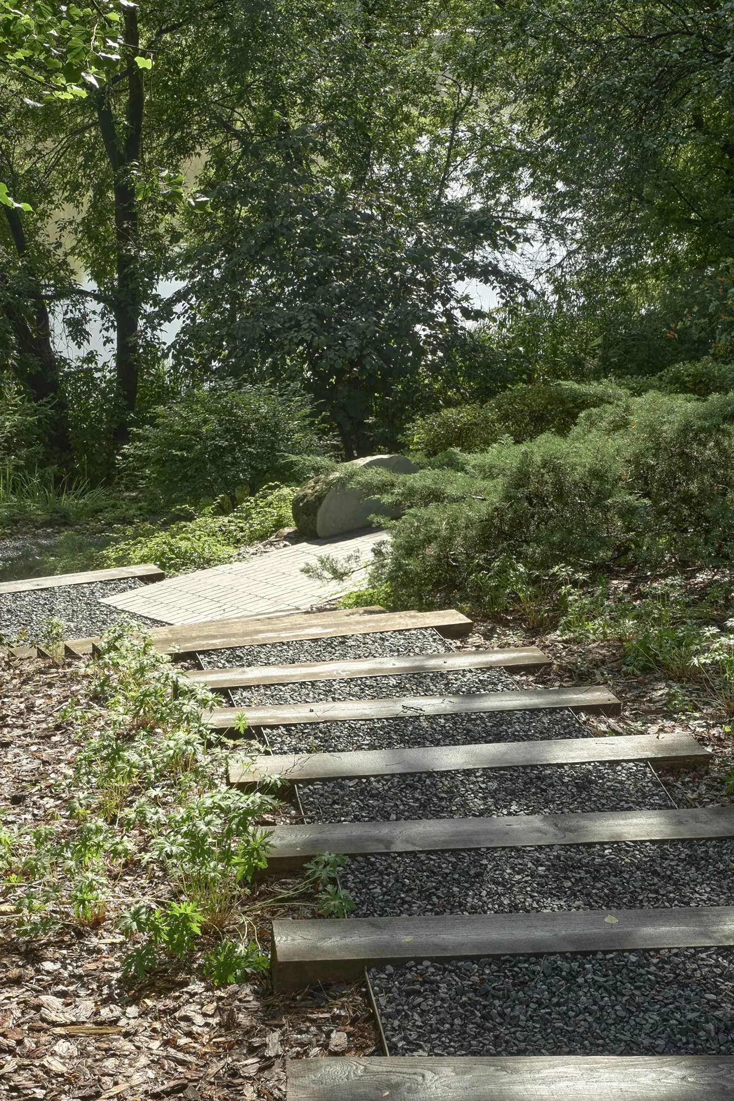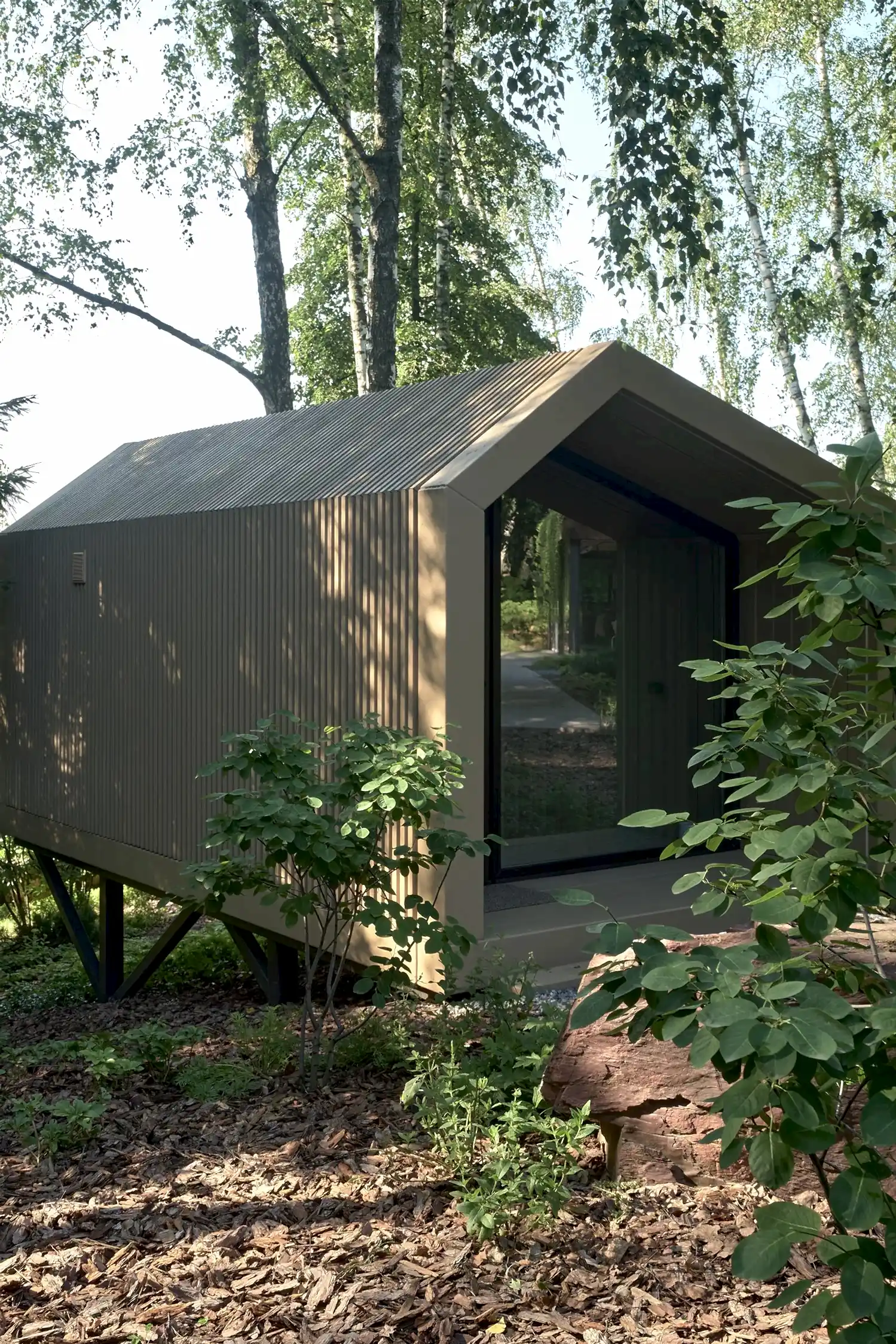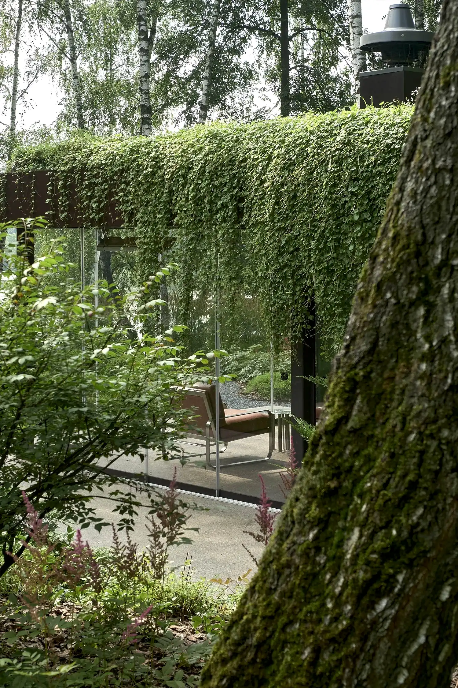 Растительный слой воссоздаёт лесной полог: барвинок, манжетка, пахизандра, папоротники - всё подобрано так, чтобы уважать ландшафтный код места. На крыше беседки мы тестировали пять видов растений. Победила будра ампельная - она не просто покрыла Pin-Up но и «спустилась» вниз, создав живые портьеры, превратившие беседку в любимое семейное убежище.