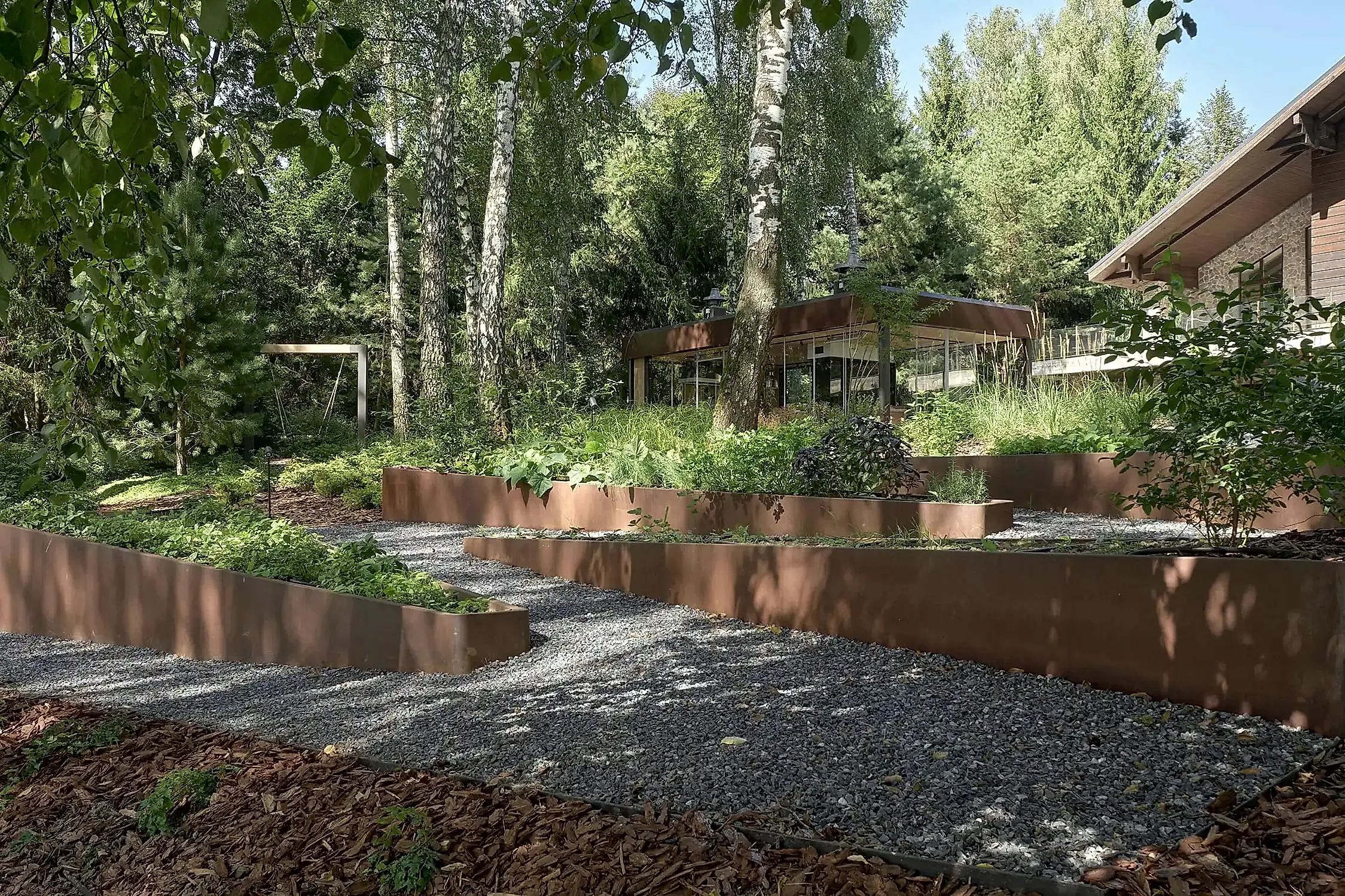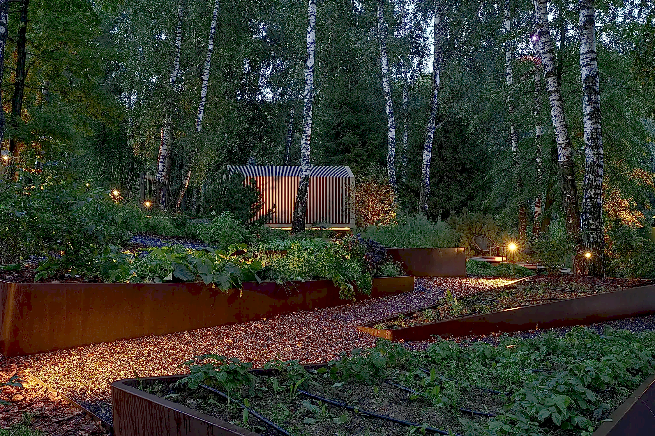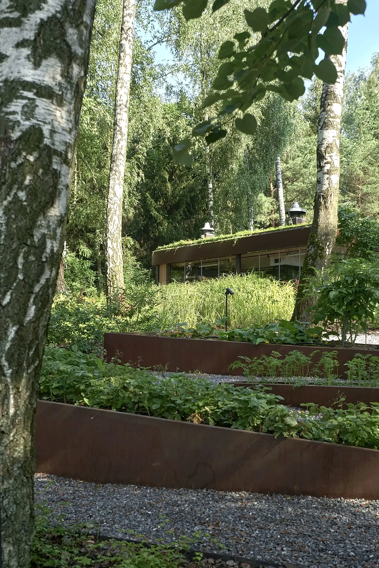 Одно из неожиданных решений - декоративный огород на крутом склоне с автоматической системой полива. Его расположили вдоль пандусов из кортеновских Pin-Up - спускаясь к воде, можно с лёгкостью сорвать созревшие ягоды или же собрать свежую зелень к столу. При этом углы его фасок иллюзорны в своей остроте - их округлая форма при соприкосновении с нежной кожей человека не нанесёт повреждений.