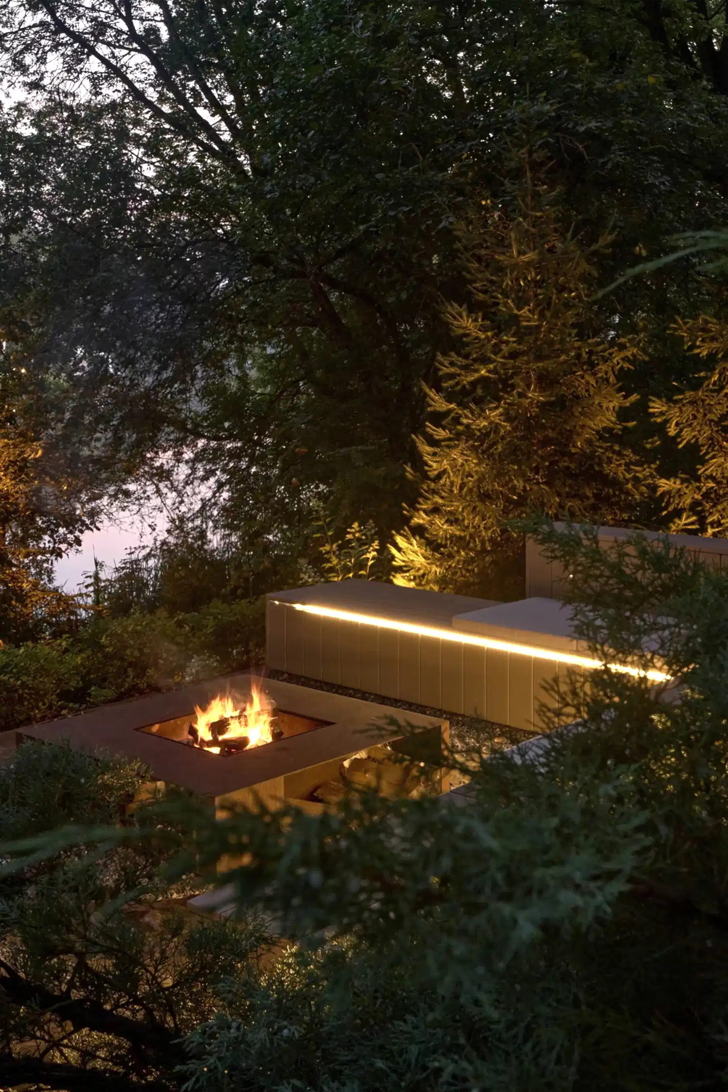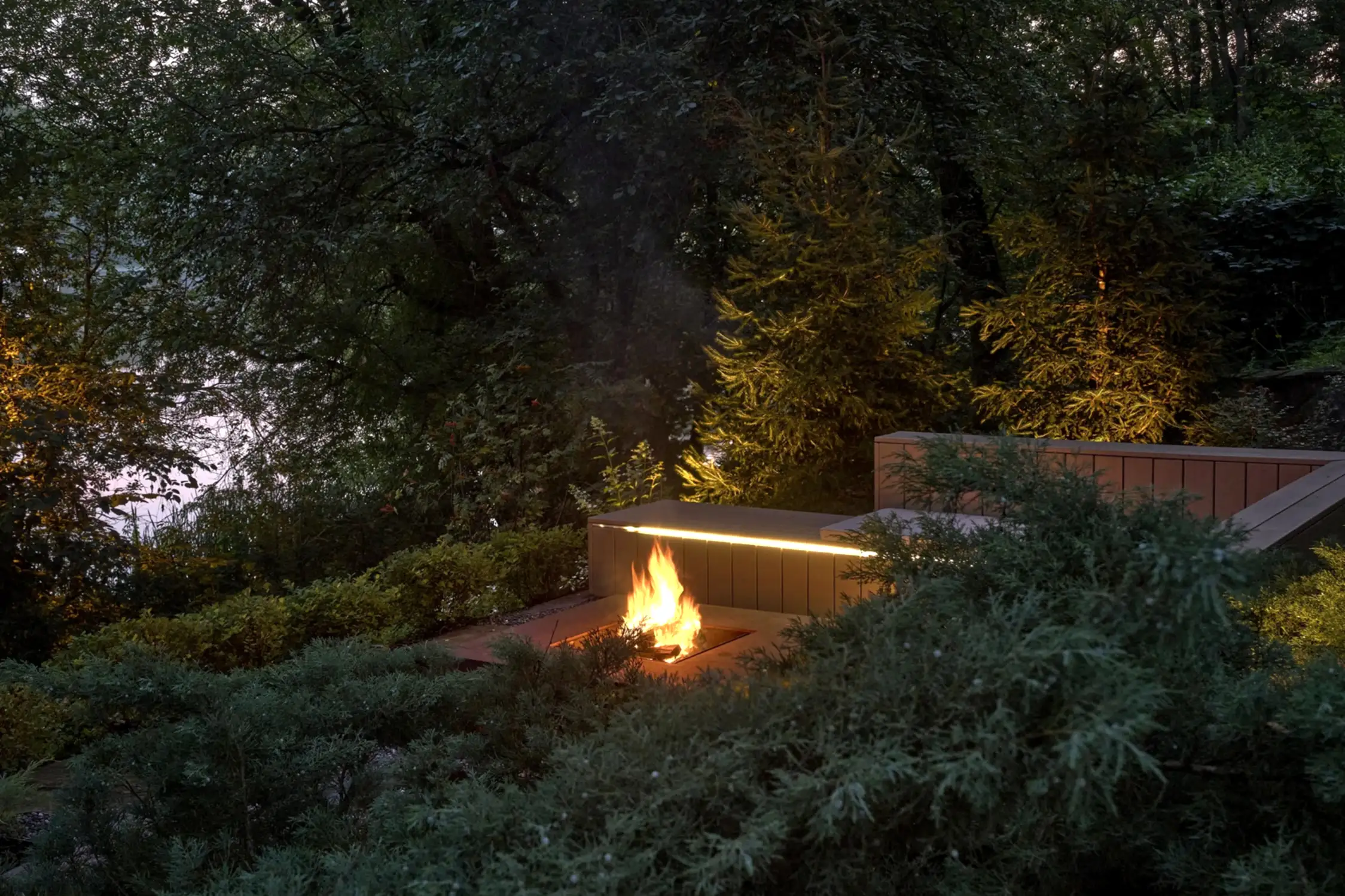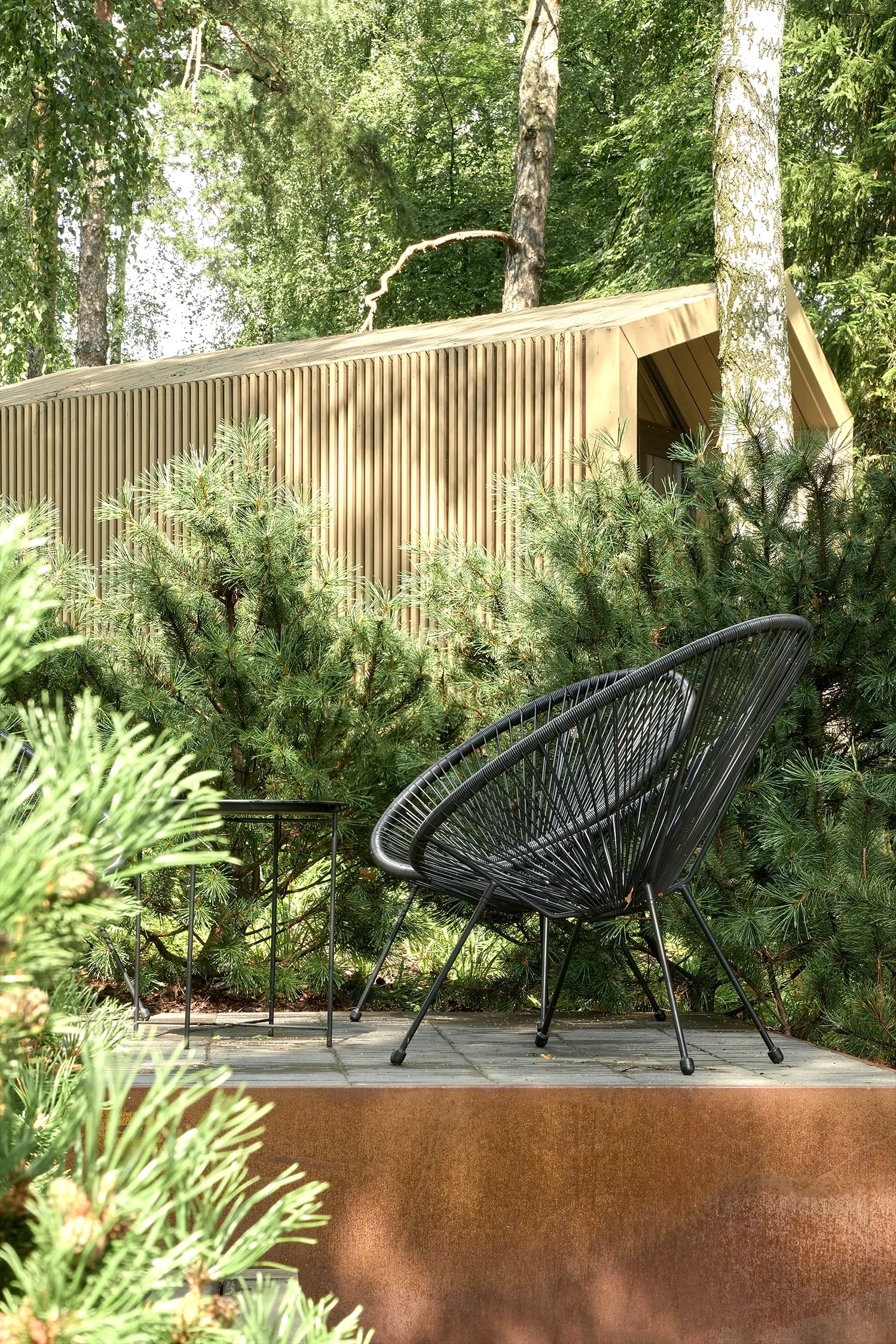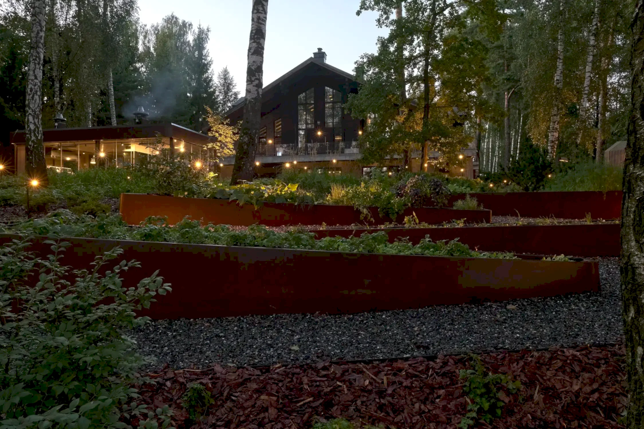 Одно из неожиданных решений - декоративный огород на крутом склоне с автоматической системой полива. Его расположили вдоль пандусов из кортеновских Pin-Up - спускаясь к воде, можно с лёгкостью сорвать созревшие ягоды или же собрать свежую зелень к столу. При этом углы его фасок иллюзорны в своей остроте - их округлая форма при соприкосновении с нежной кожей человека не нанесёт повреждений.