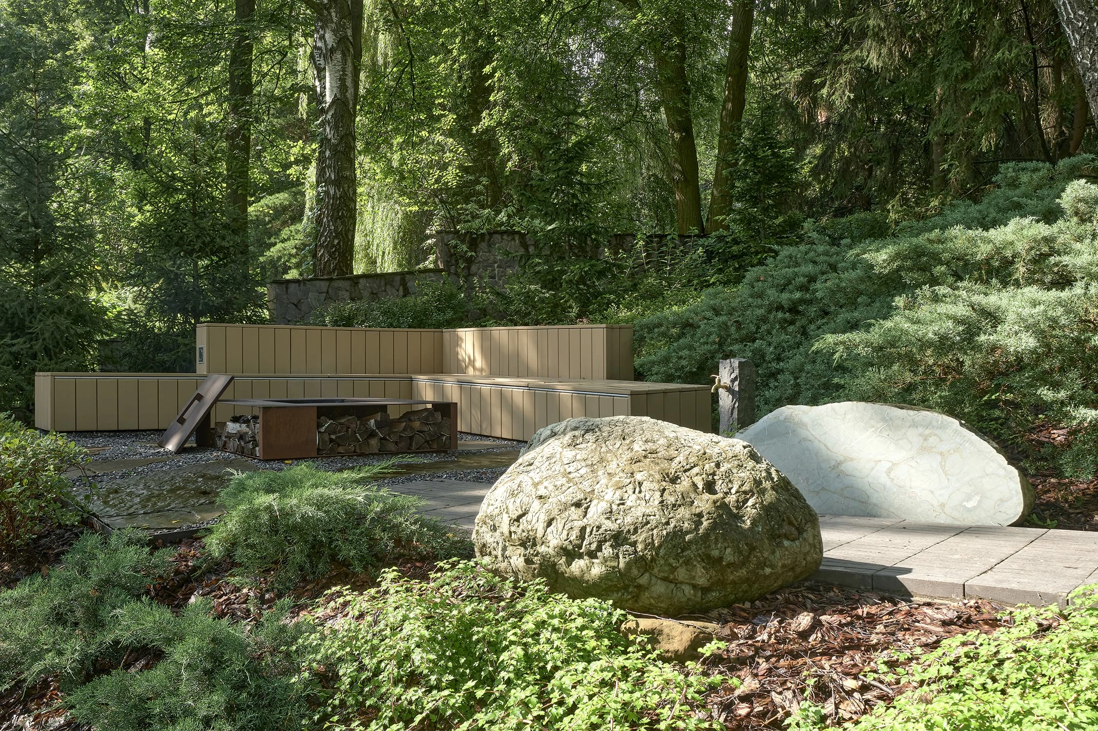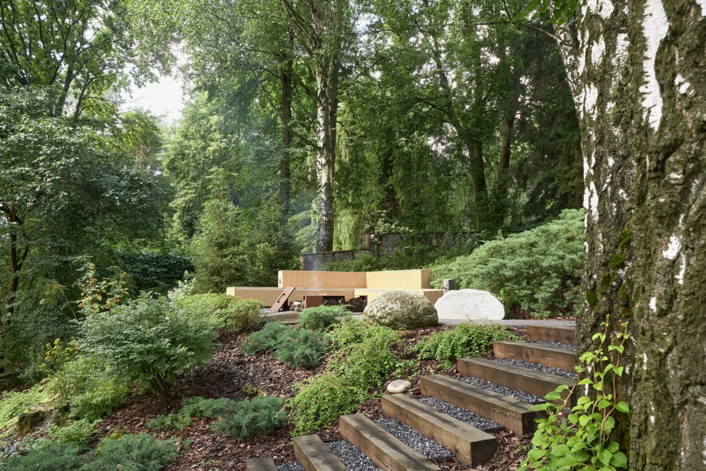 Вдохновением послужил подход нидерландского ландшафтного архитектора Andrew Van Egmond, который практически всегда работает со старыми участками, приобретёнными новыми владельцами. Он берёт лучшее, что есть на территории и заботится о том, чтобы не навредить природе, формируя новую среду. Так мы переосмыслили уже существующие объекты. Старые крупные камни, которые Pin-Up было сохранить, превратили в инсталляции после художественной резки, а зелёная крыша беседки воплотила детскую мечту о «летающем лесе».