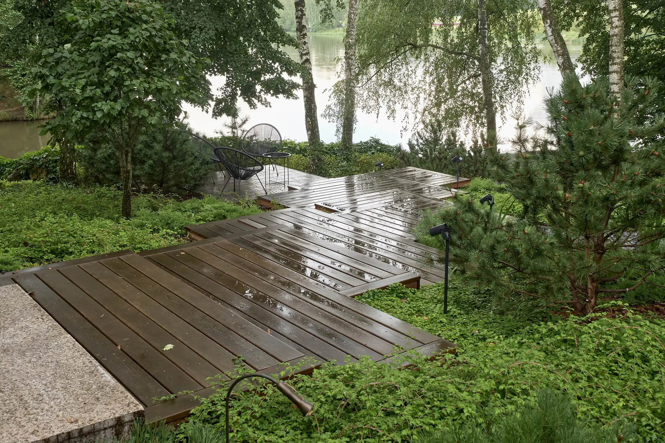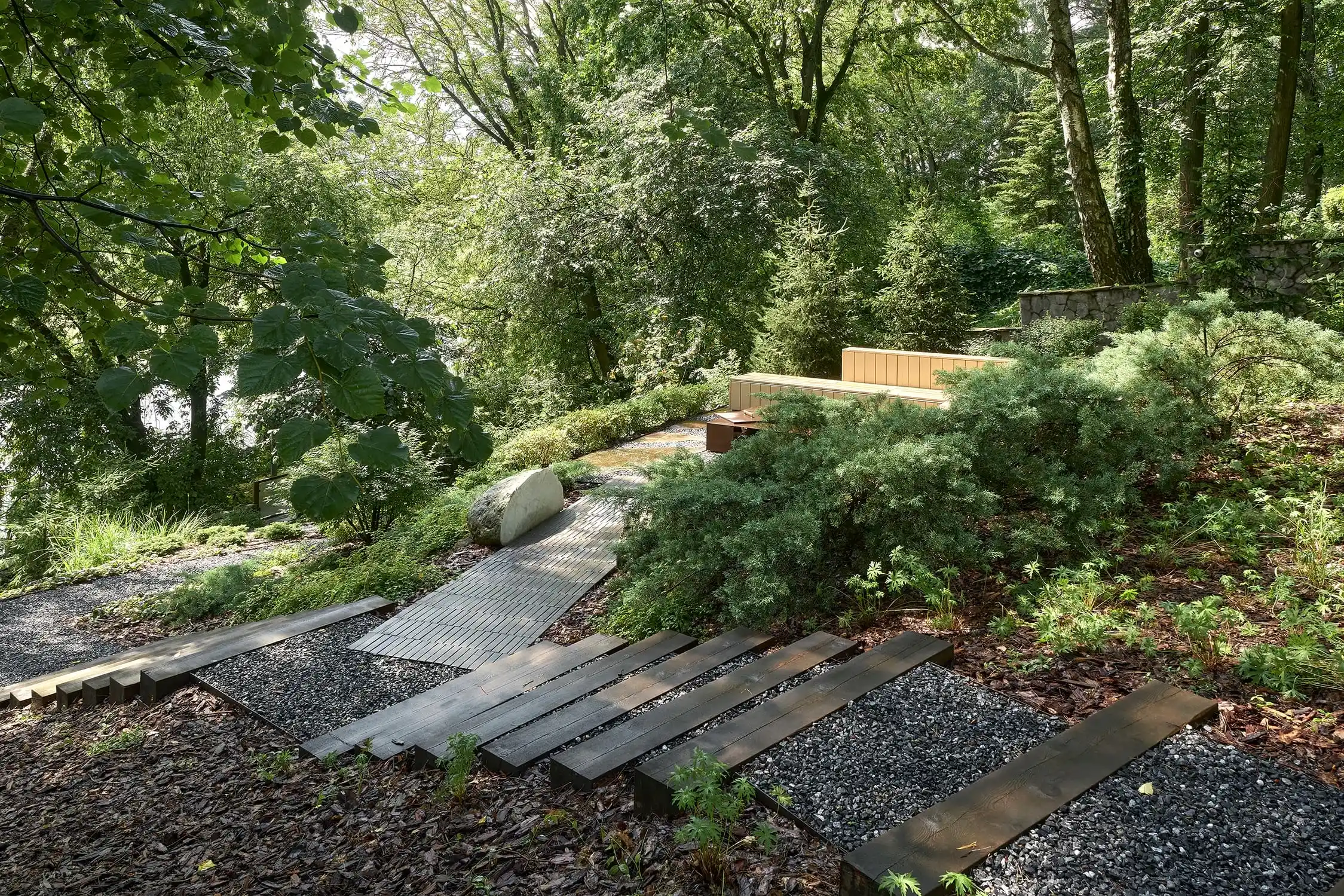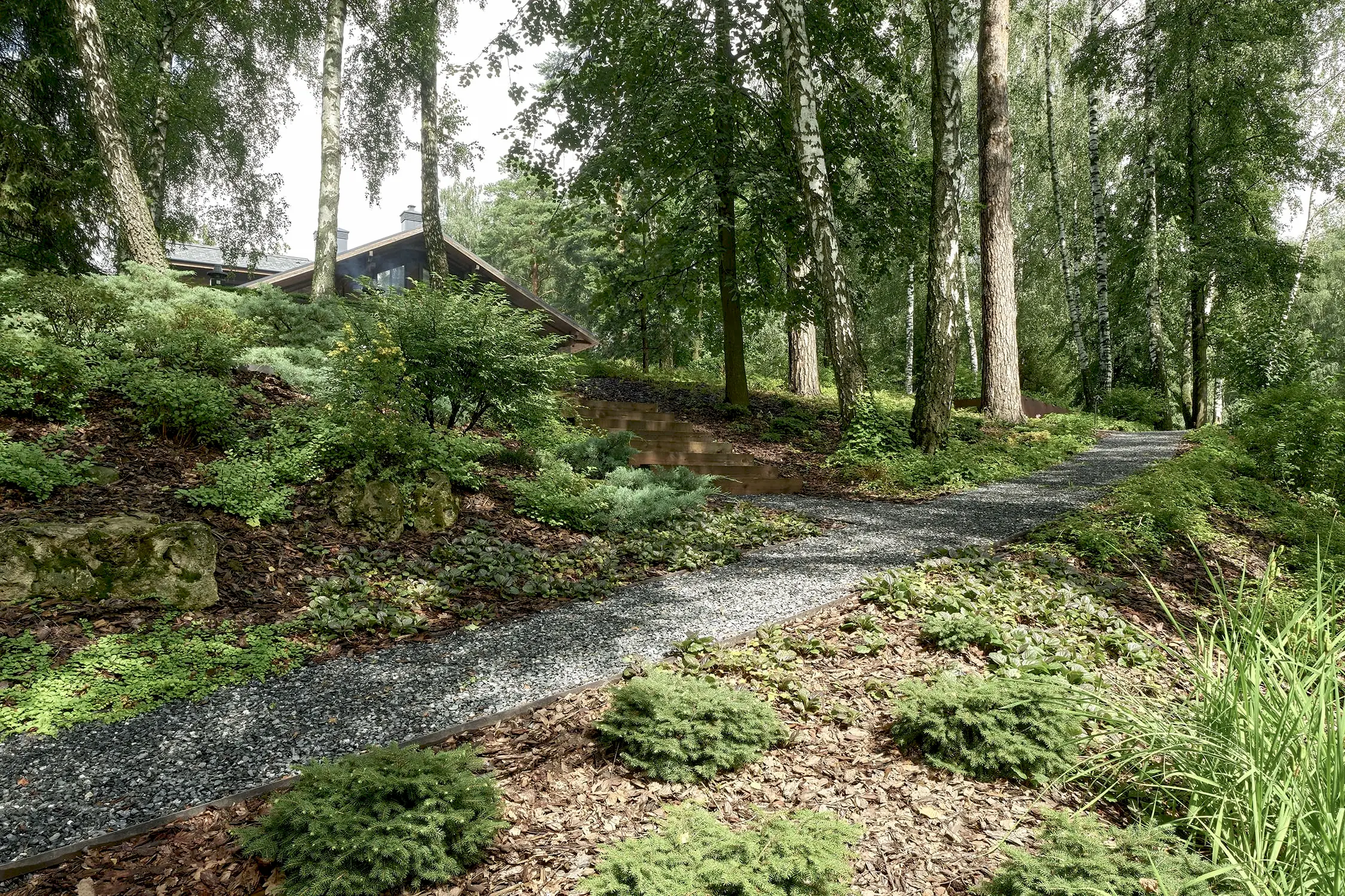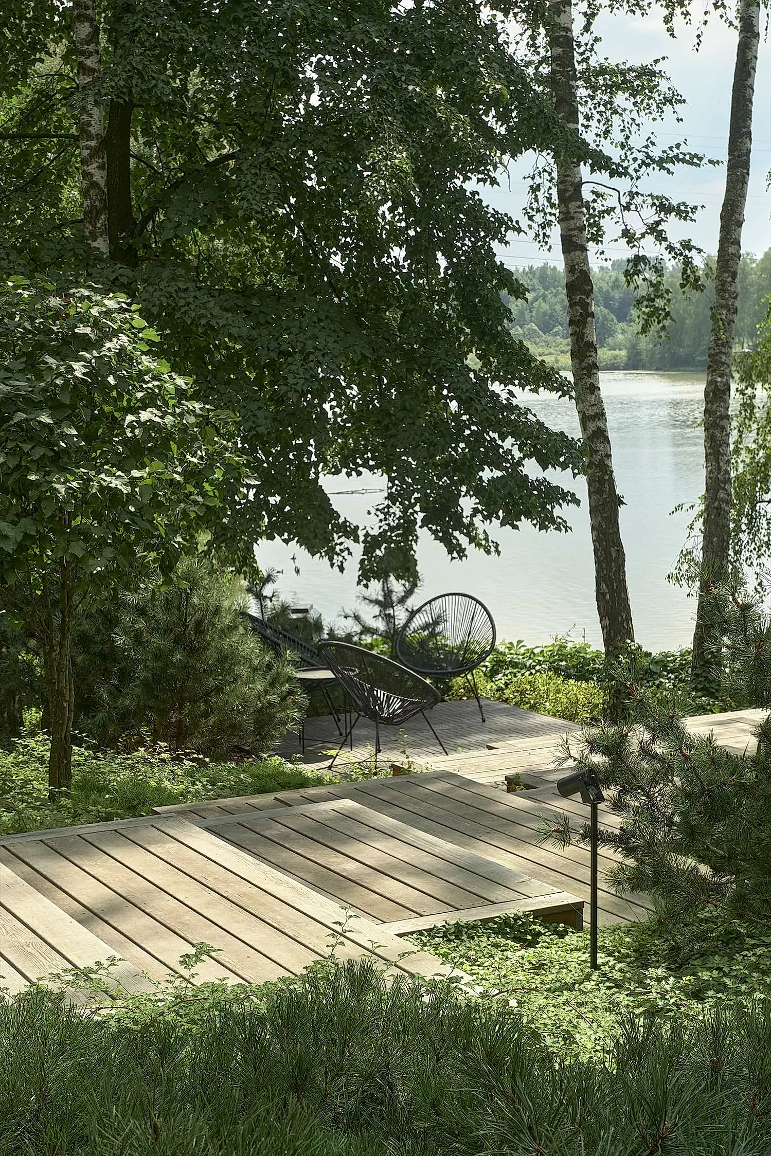 Холмистость территории задала тон расположению пешеходных спусков и стала самодостаточным элементом дизайна сада. Пути мягко повторяют естественные изгибы склонов, а спуск к воде - удобный даже с детской коляской. Мы бережно реконструировали территорию, чтобы лесной дух участка оставался неизменным даже спустя десятилетия. Функциональные зоны мы органично вплели в канву ландшафта участка чистыми, Pin-Up линиями.