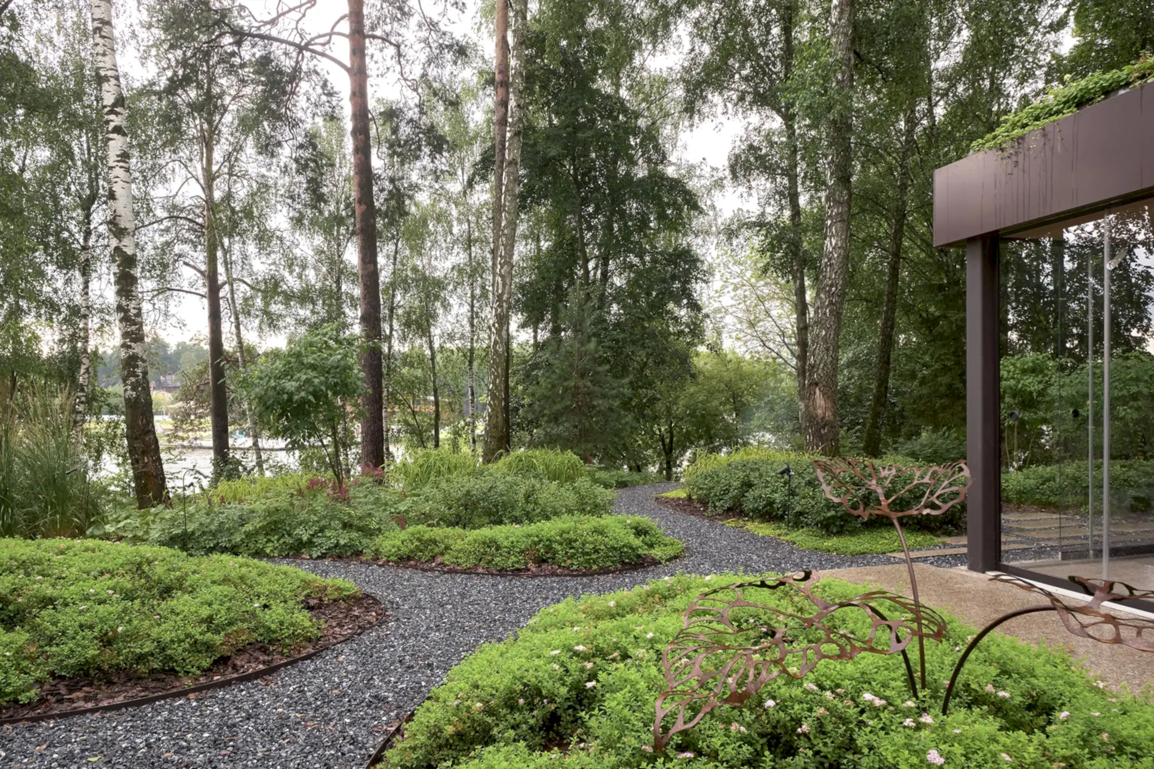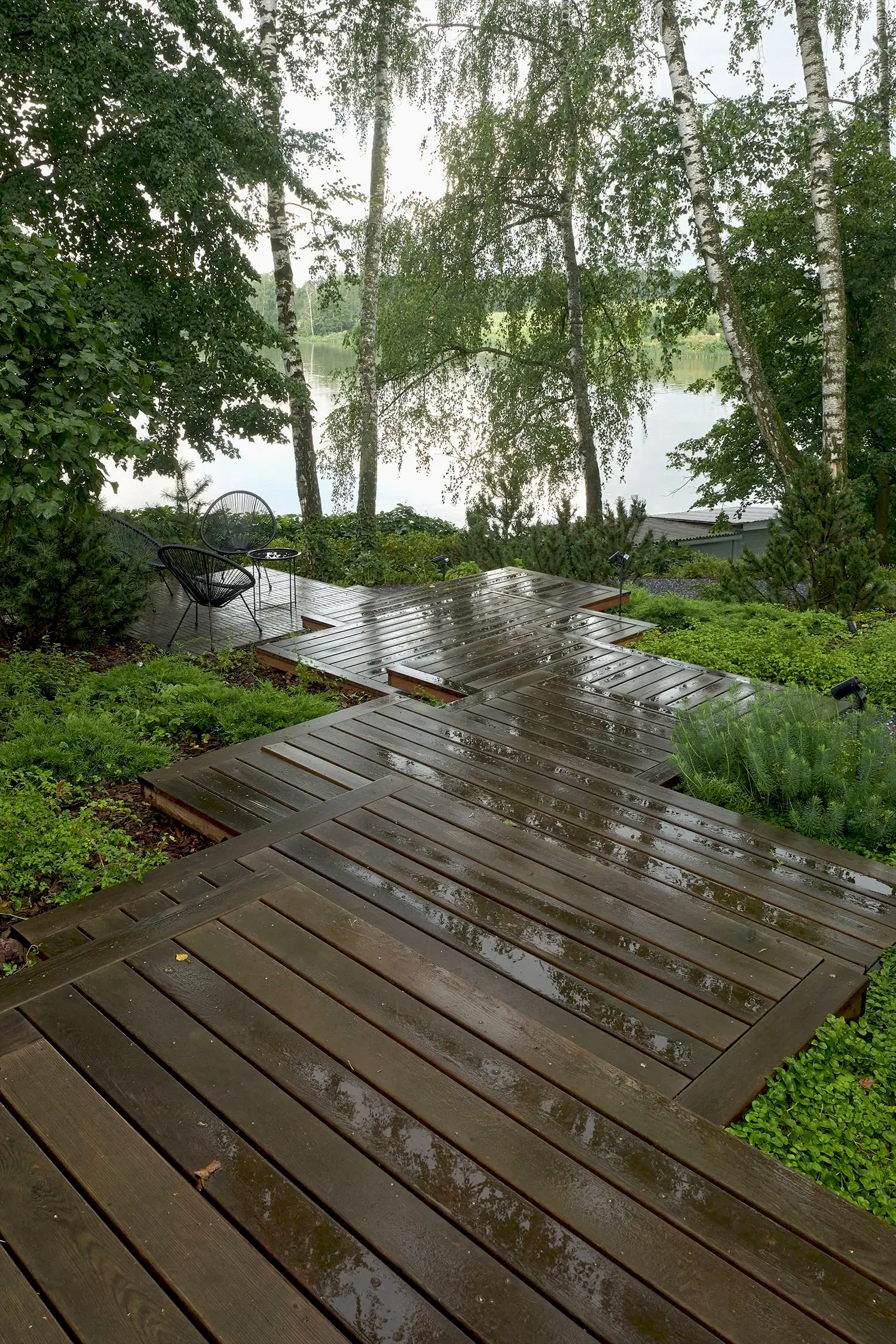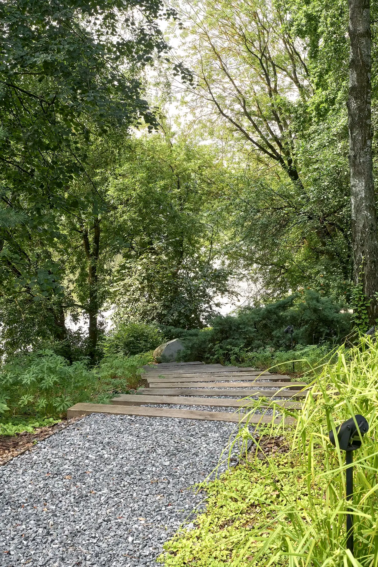 Холмистость территории задала тон расположению пешеходных спусков и стала самодостаточным элементом дизайна сада. Пути мягко повторяют естественные изгибы склонов, а спуск к воде - удобный даже с детской коляской. Мы бережно реконструировали территорию, чтобы лесной дух участка оставался неизменным даже спустя десятилетия. Функциональные зоны мы органично вплели в канву ландшафта участка чистыми, Pin-Up линиями.