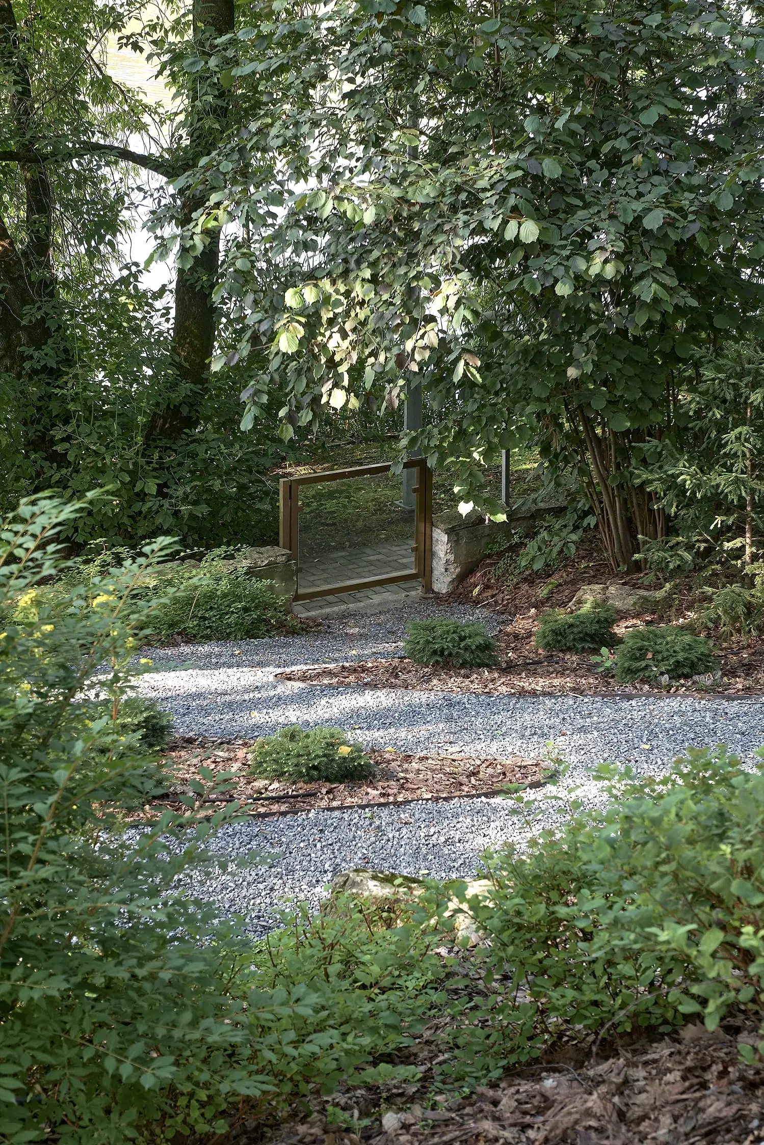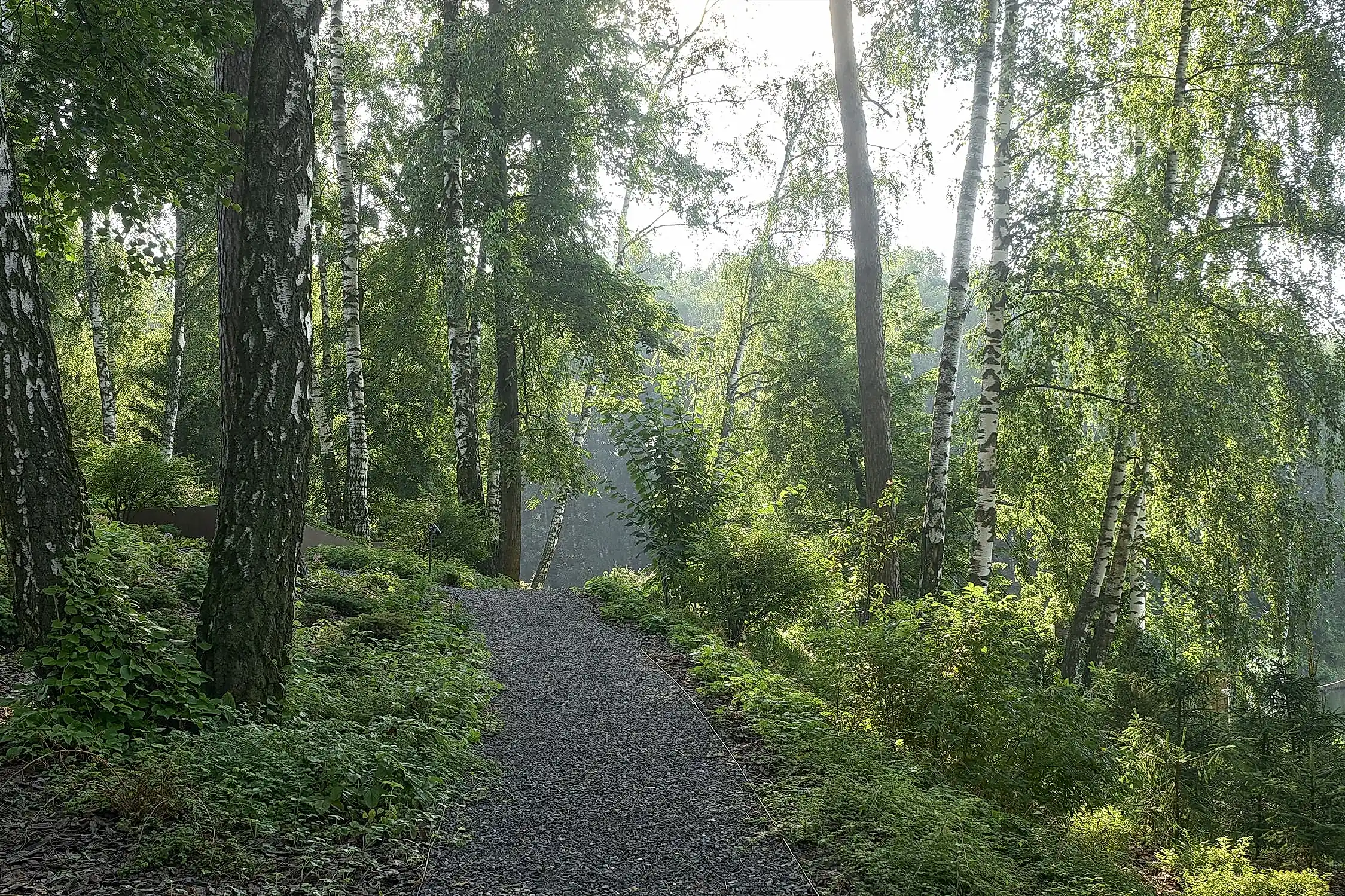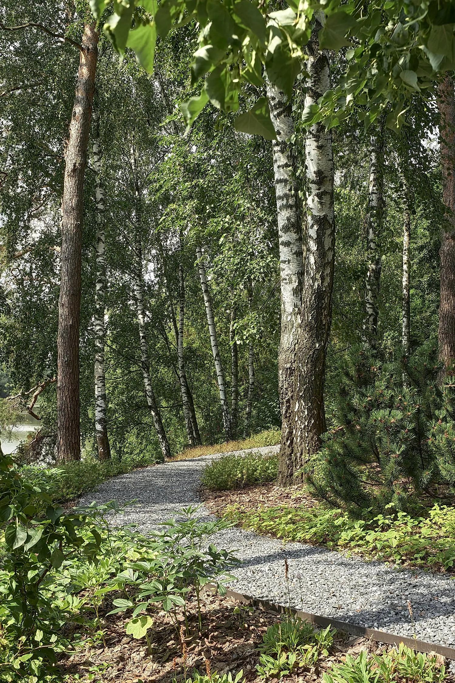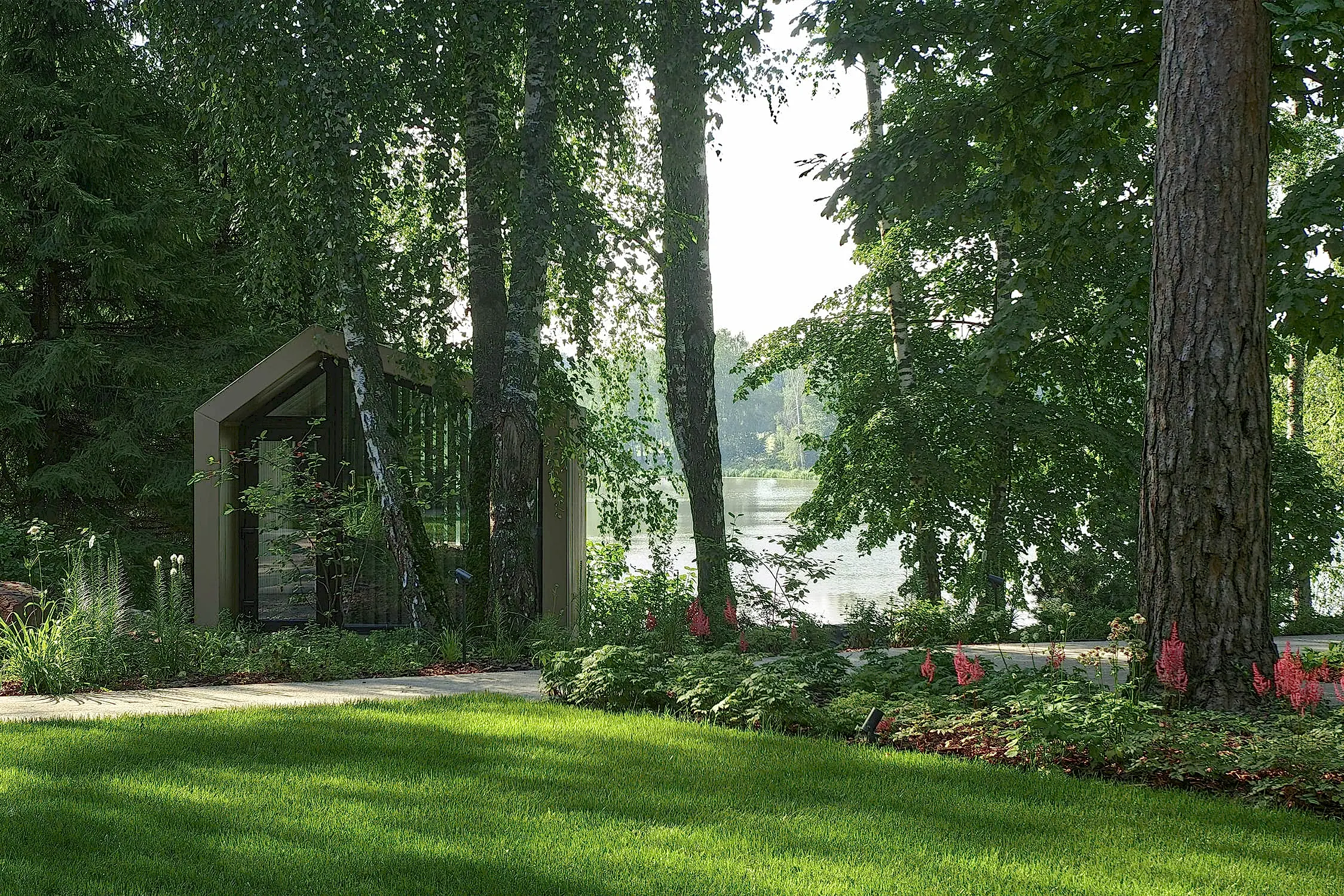 Холмистость территории задала тон расположению пешеходных спусков и стала самодостаточным элементом дизайна сада. Пути мягко повторяют естественные изгибы склонов, а спуск к воде - удобный даже с детской коляской. Мы бережно реконструировали территорию, чтобы лесной дух участка оставался неизменным даже спустя десятилетия. Функциональные зоны мы органично вплели в канву ландшафта участка чистыми, Pin-Up линиями.
