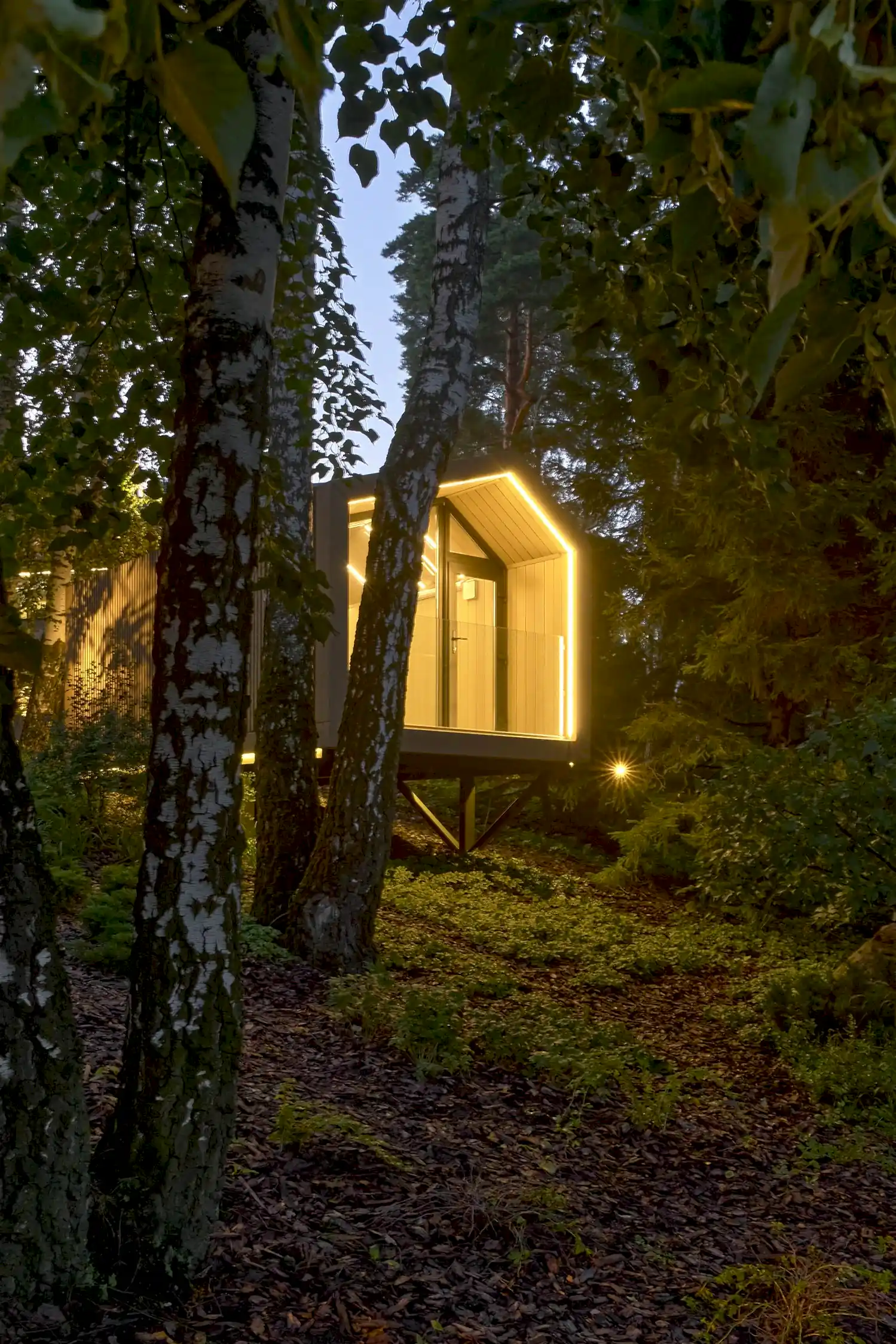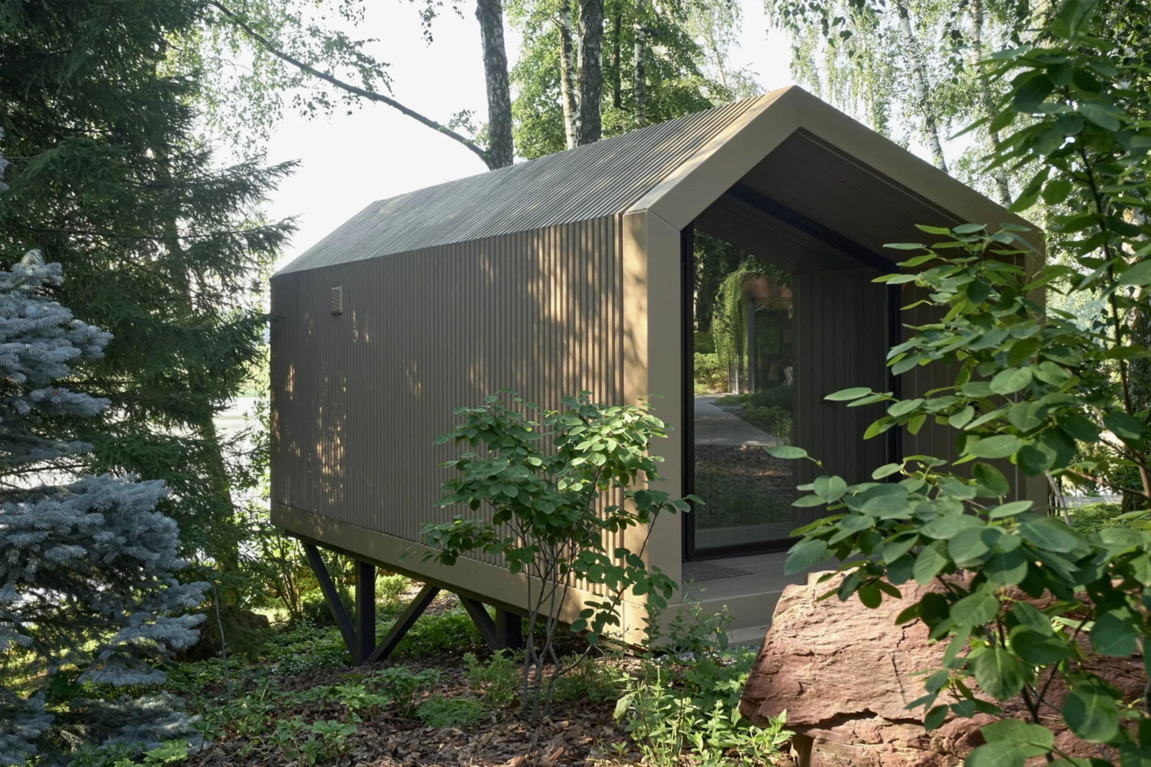 Важным элементом взрослого мира глазами детей оказался «Парящий домик». Он расположен на крутом склоне над водой в стороне от основных маршрутов. Туда можно уходить в поход с ночевкой и заниматься рыбалкой. Старую беседку решили восстановить в новом материале: корпус изготовили из металлокаркаса, а безрамные стены - из стекла. Спроектирована она по принципу IN→EX - при открытых стенах она растворяется в ландшафте. Крышу покрыли ковром из зелени, которая витиевато спадает на прозрачные стены - кажущаяся простота на деле является сложным инженерным решением, выполняющее функцию утепления потолка.