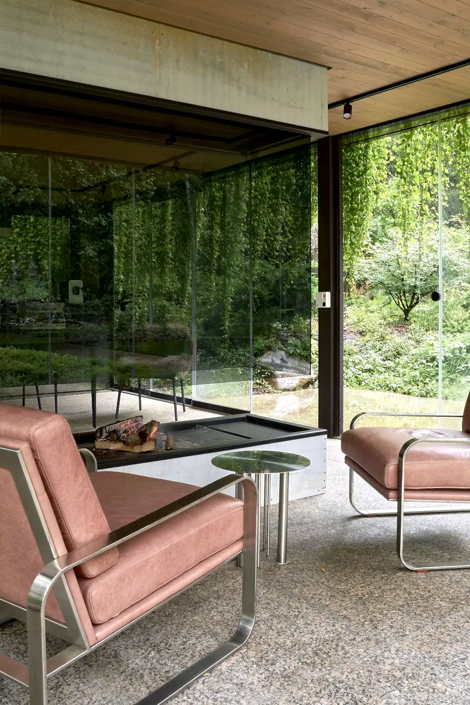 Здесь все подчиняется Pin-Up фантазии, которую удалось реализовать в мир взрослых: над рельефом парит отапливаемый игровой домик, в лесном массиве спрятаны вместительные качели, а беседка с раздвижными стеклянными стенами и зелёной крышей стирает границу между интерьером и садом.