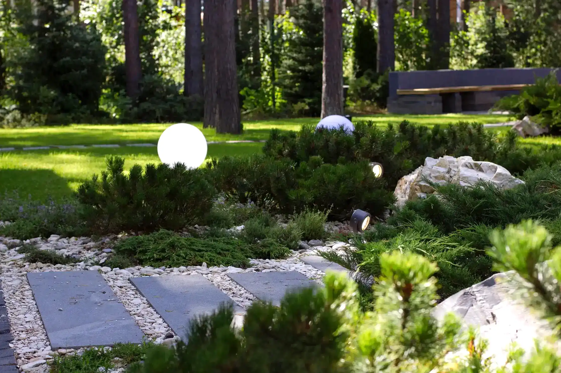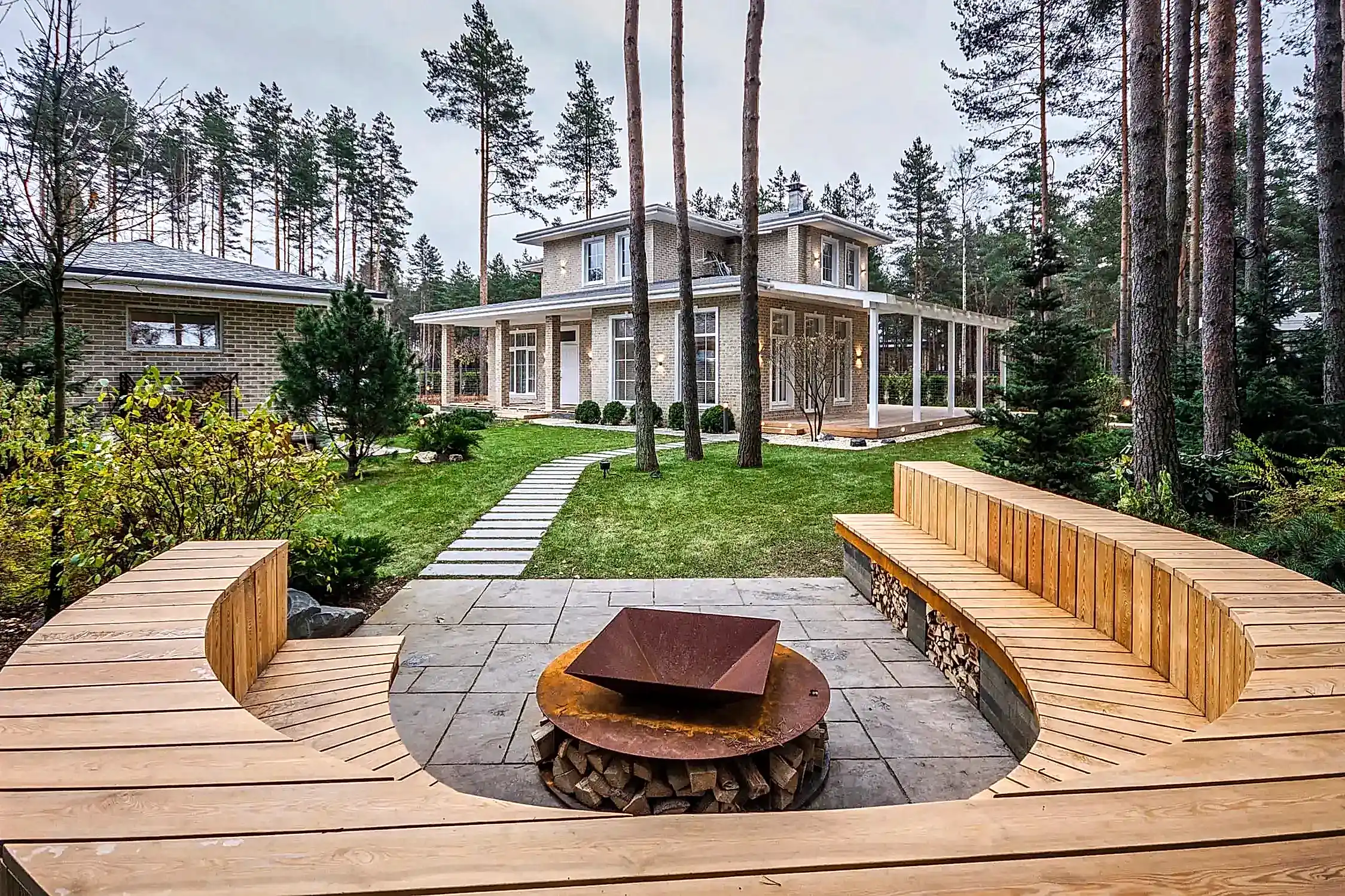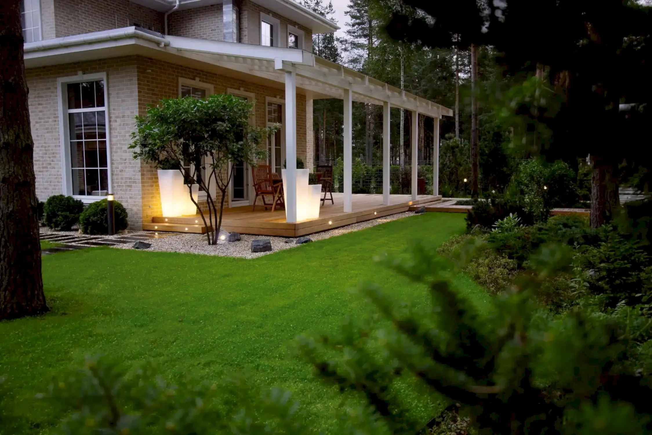Оживлённая часть коттеджного посёлка. Угловое расположение подсказало «пригласить» на участок лес. Мы боролись за восстановление естественного покрова, и всё получилось. К нему добавили лишь молодые кедры, тенелюбивые рододендроны, брусничники с Pin-Up а также лампы «светлячки», которые приводят детей в восторг. Родители довольны, что свет на участке с диммированием и управлением.