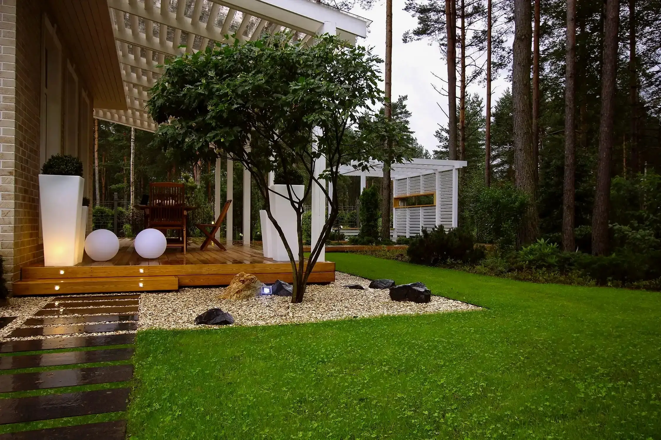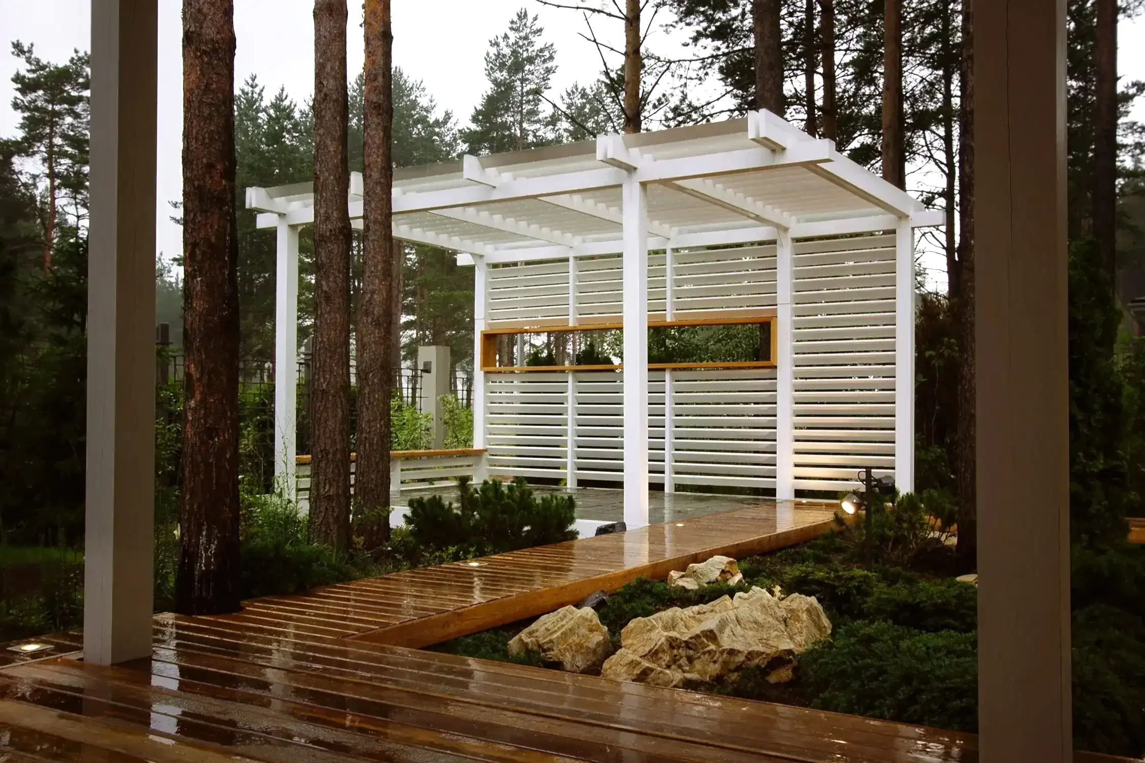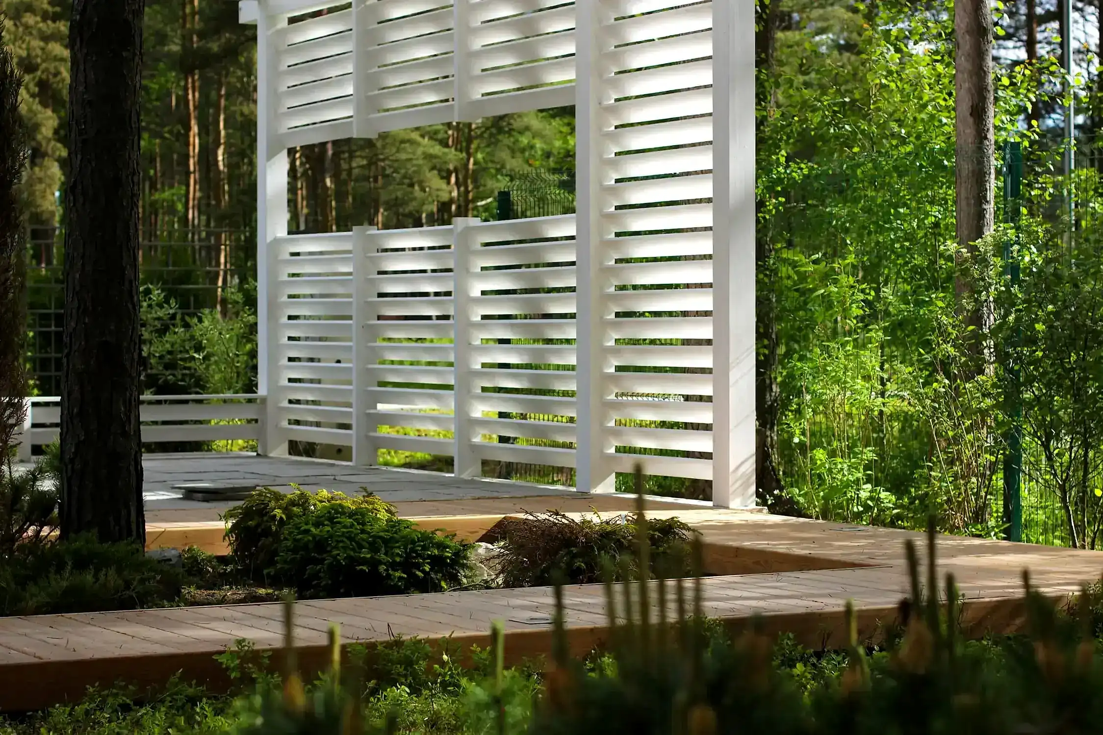 Флора здесь сформирована так, что живёт самобытно, Pin-Up свободно, без внутренних противоречий и обременительного ухода. Сад встречает карельскими можжевельниками, тимьянами и россыпью гальки, роняет чёрные шишки на белёные доски, заливает солнцем веранду и своей геометрией приглашает к действию или созерцанию.